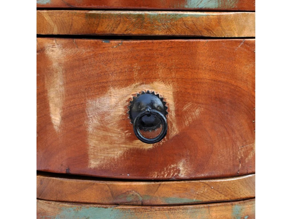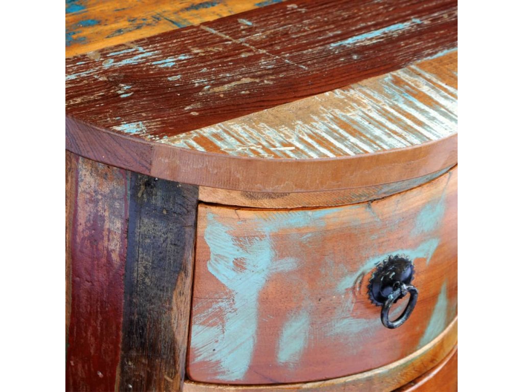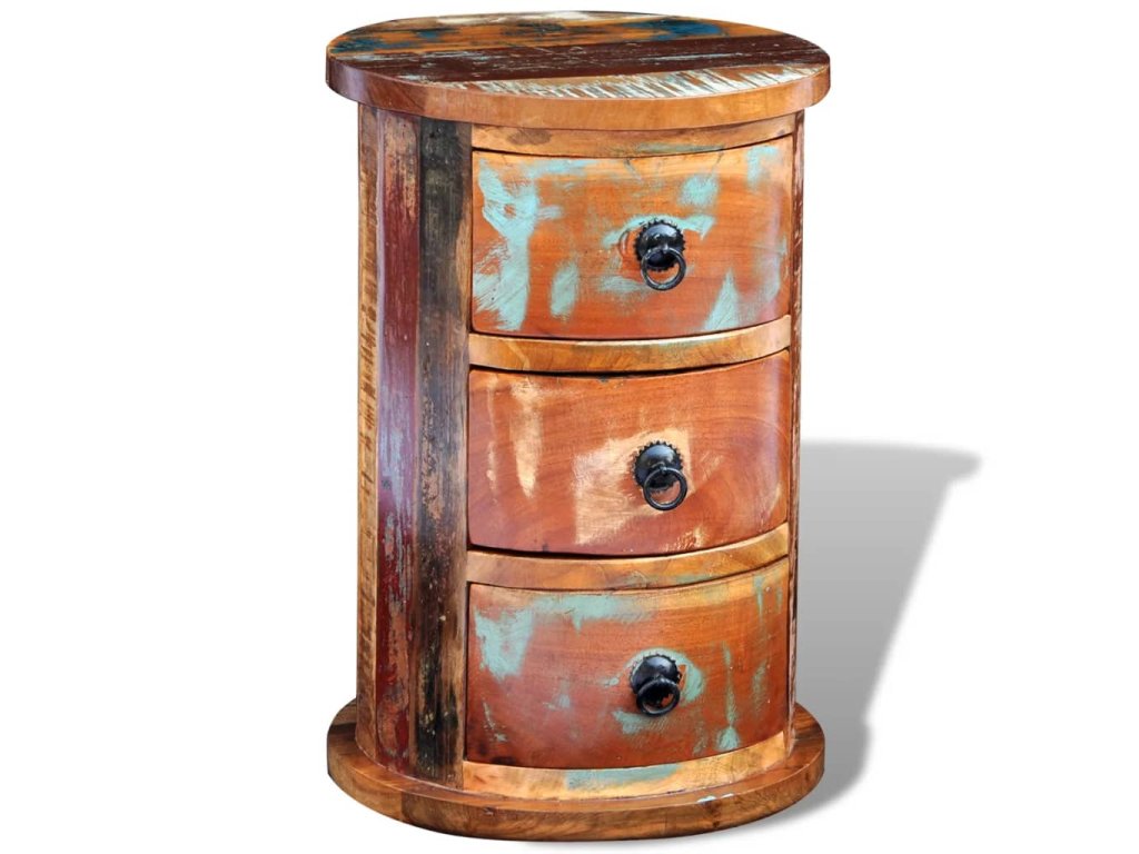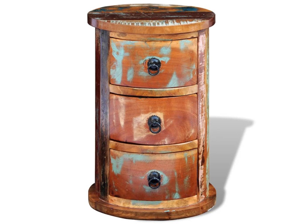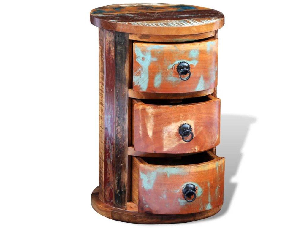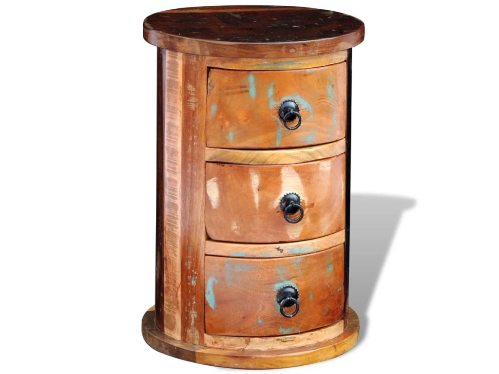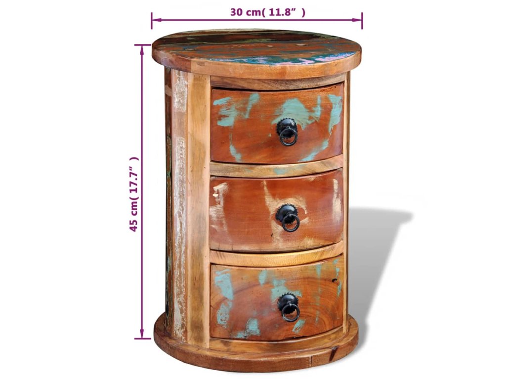 Táto okrúhla drevená skrinka s 3 zásuvkami má starožitný vzhľad a poskytuje množstvo úložného priestoru, aby ste mohli svoje veci udržiavať v čistote a poriadku. Vrch skrinky má hladký povrch, na ktorý môžete položiť vázy alebo rôzne dekoračné predmety. Zásuvky sa dajú ľahko otvárať a zatvárať pomocou železných úchytiek a krúžkov.