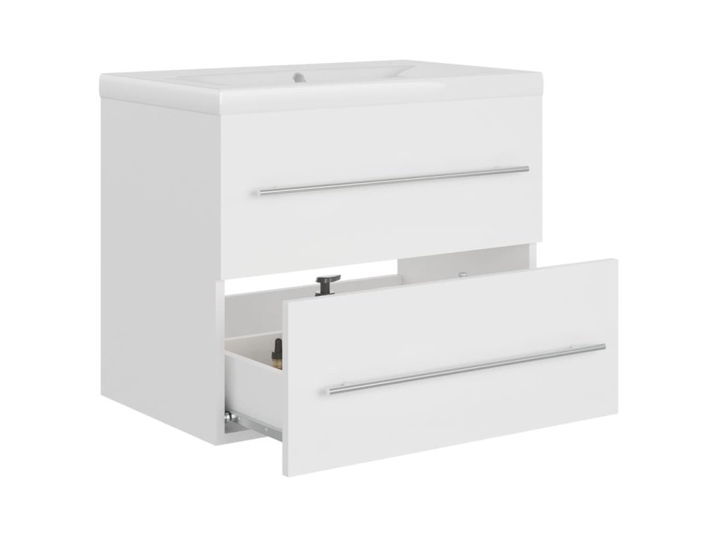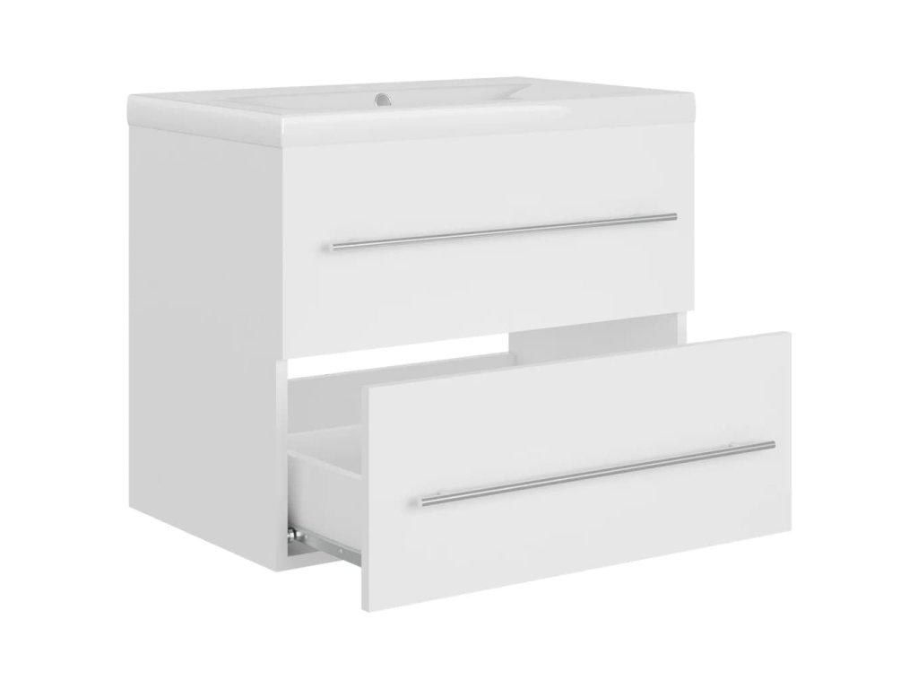 Táto skrinka je vyrobená zo spracovaného dreva, vďaka čomu je pevná a odolná. Úložná skrinka má 1 zásuvku, ktorá ponúka dostatok priestoru na uloženie vecí. Skrinka sa bude dokonale hodiť pod vaše umývadlo a priehľadne uskladní všetky kúpeľňové doplnky. Umývadlo je vyrobené z keramiky a môže slúžiť nielen ako nádoba na každodenné použitie, ale aj ako ozdoba vášho obytného priestoru. Vďaka svojmu trendovému a modernému dizajnu sa hodí do každého interiéru. Má aj prepad na odtekanie vody, keď je umývadlo plné. Jeho glazovaný povrch prináša moderný a zároveň elegantný dizajn. Skrinka a umývadlo sa navyše ľahko čistia vlhkou handričkou.
