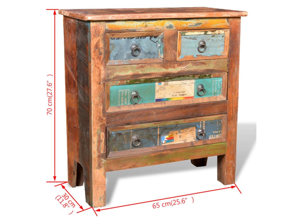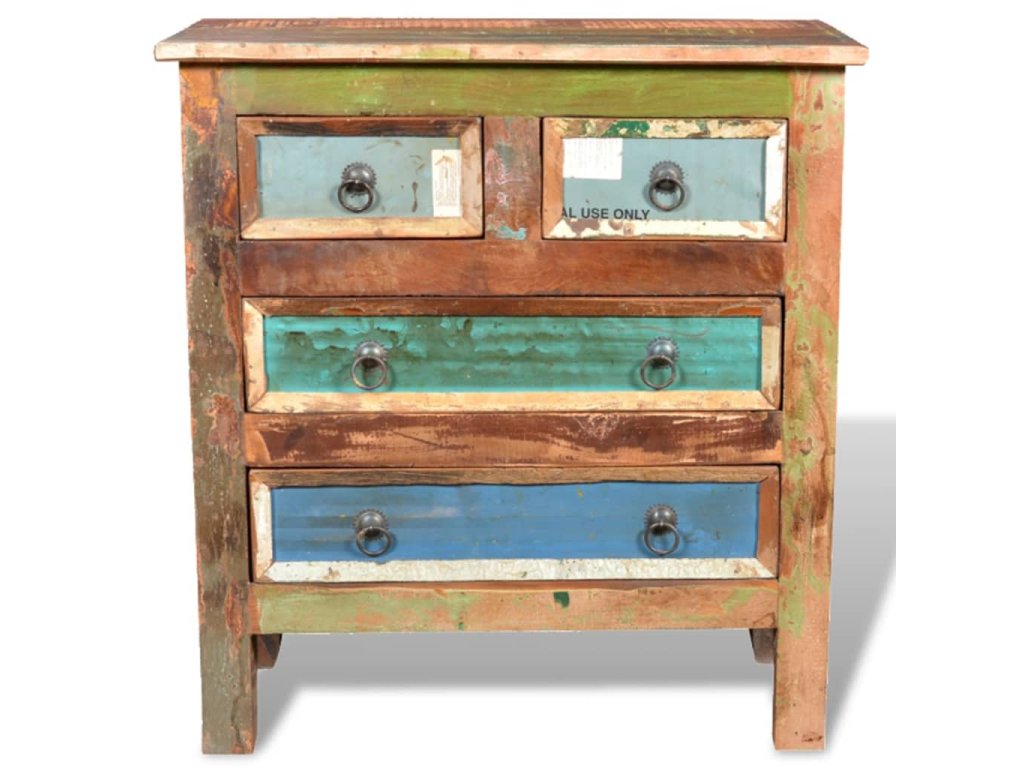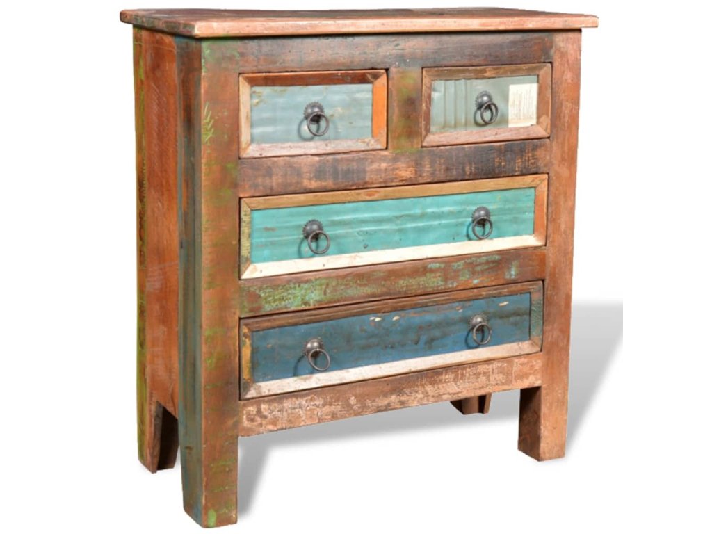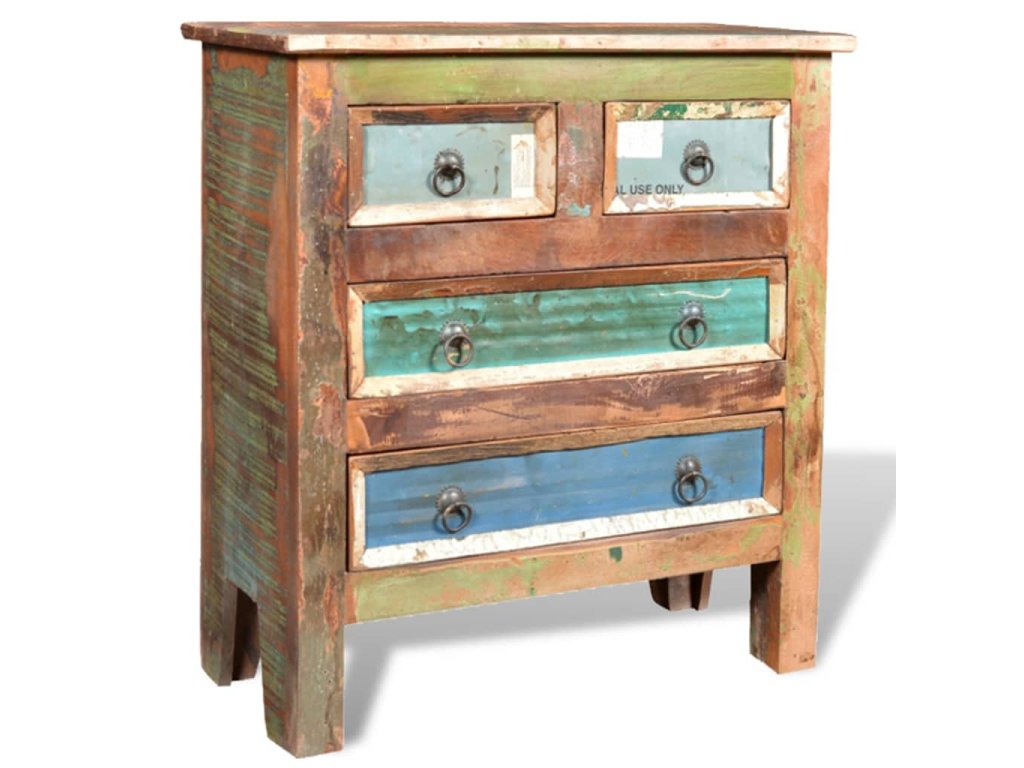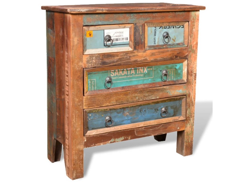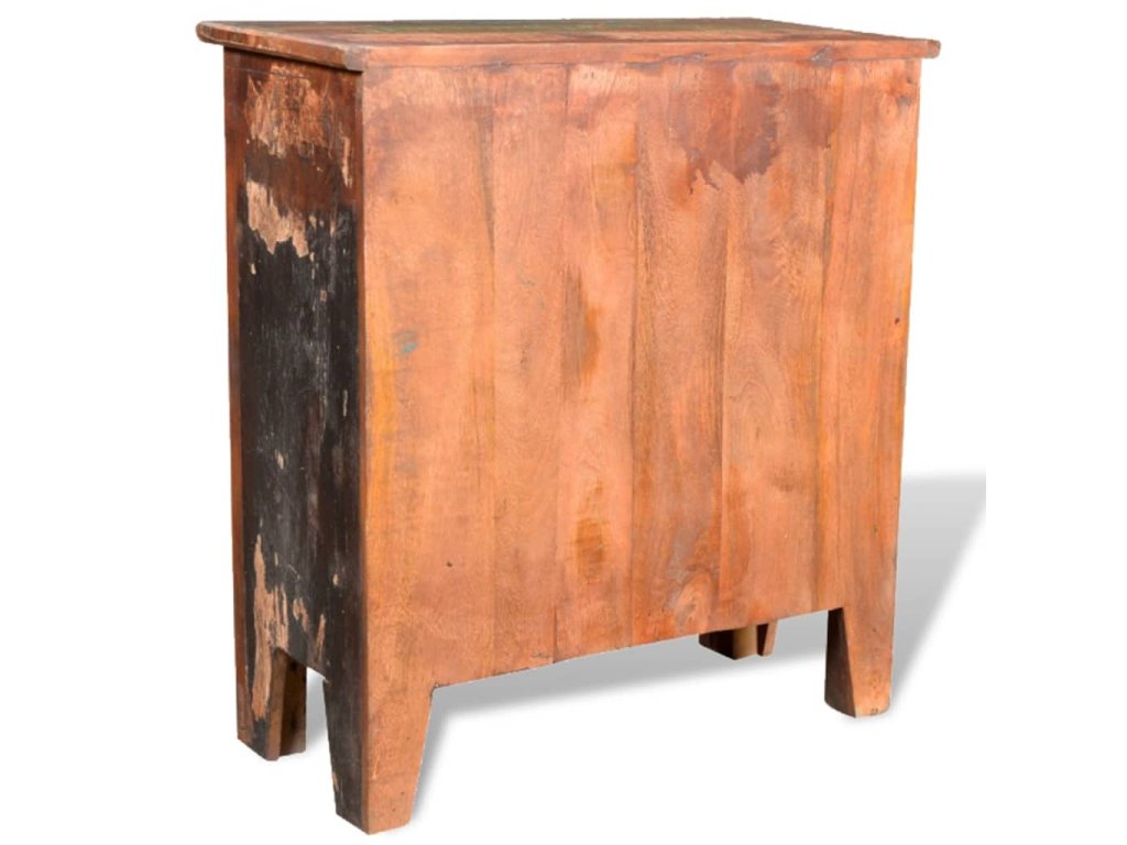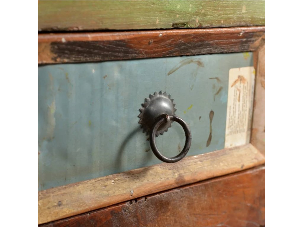 Skrinka je vyrobená z recyklovaného dreva, a preto nenájdete dva rovnaké kúsky tohto nábytku - každý je jedinečný. Recyklované drevo má podobné vlastnosti ako napríklad tíkové, akáciaové, akáciové, mangové drevo, drevo z damarovníka a podobne. Takéto drevo je pevné, stabilné, trvácne a má zaujímavú textúru. Vyskytnú sa na ňom aj dierky po klincoch, ktoré so sebou nesú svoj príbeh a podnecujú budúcich majiteľov k tomu, aby na svojom novom nábytku zanechali vlastnú stopu aj oni. Tento výrobok tiež poukazuje na to, že jeho majiteľovi záleží na ochrane životného prostredia, udržateľnom rozvoji a na tom, aby sa neplytvalo prírodnými zdrojmi.