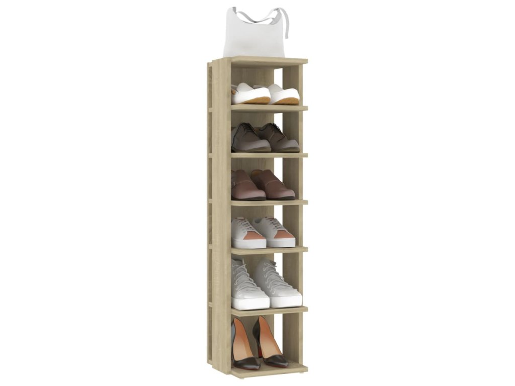 Je vyrobená z kvalitného kompozitného dreva, ktorá jej dodáva rafinovaný vzhľad a zabezpečuje jej stabilitu a odolnosť. Táto skrinka na topánky zaberá len málo miesta a je ideálna do úzkych kútov, napríklad do priestoru pod schodmi. Každá skrinka má 6 políc a zmestí sa do nej veľa topánok.