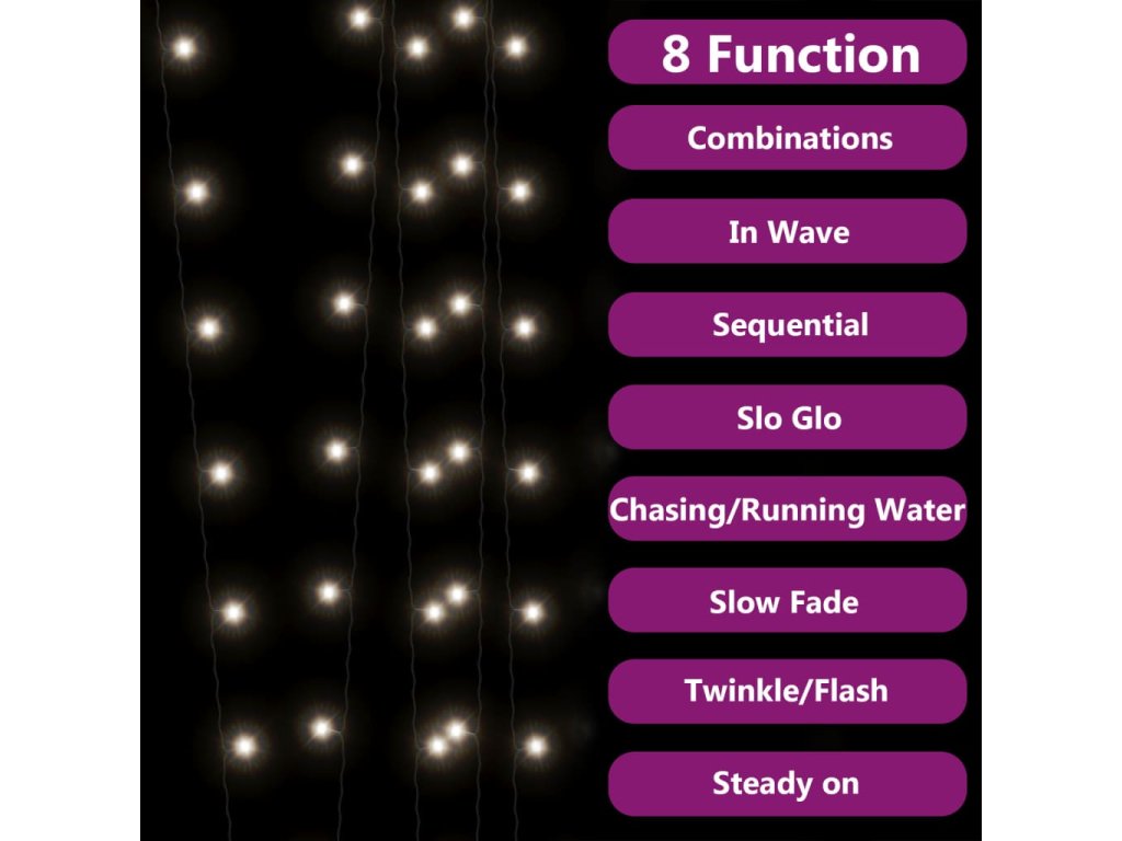 Počas dňa premieňa účinný solárny panel slnečné svetlo na elektrickú energiu uloženú vo vstavanej batérii. V noci sa rozprávkové svetlá automaticky rozsvietia. Svetelná reťaz je vybavená 200 energeticky úspornými LED diódami, ktoré vytvárajú magický svetelný výkon. Má 8 rôznych svetelných efektov: kombinovaný režim, vlny, sekvenčný režim, režim pomalého žiarenia, blikanie, režim pomalého blednutia, trblietanie a nepretržité svietenie. Je to skvelý dekoratívny doplnok na osvetlenie vnútorných a vonkajších priestorov.