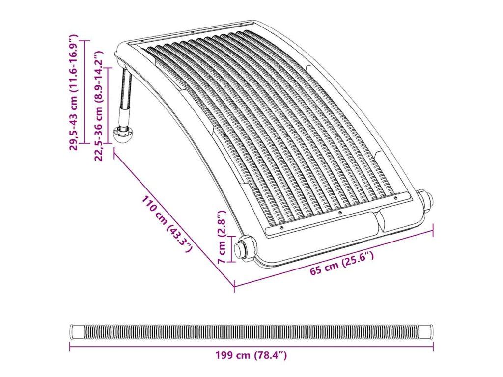 Tento solárny vyhrievací systém je navrhnutý z vysokokvalitných materiálov, ktoré odolávajú častému vystaveniu slnku a vonkajším elementom. Ohnuté panely na ohrievanie bazéna a nastaviteľné nohy zaisťujú maximálnu plochu pre zachytenie slnečnej energie, čo má za následok vyššiu účinnosť ohrievania.