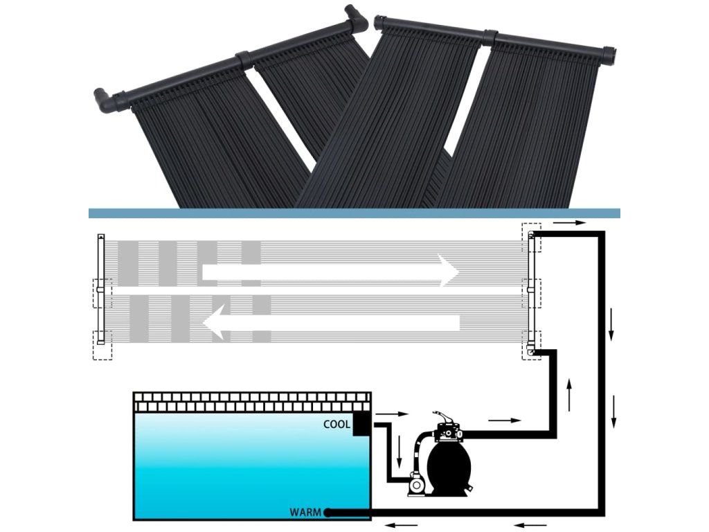 Po inštalácii tohto ohrievača cirkuluje voda z bazéna solárnymi kanálikmi a vracia sa do bazéna príjemne teplá. Je kompatibilný s väčšinou bazénových čerpadiel. Môže sa namontovať na strechu/držiak alebo sa môže jednoducho položiť na zem pri bazéne.