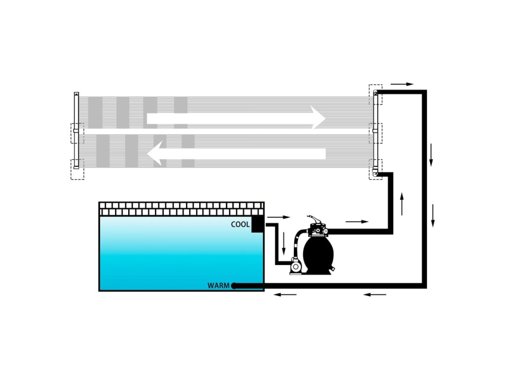 Po inštalácii tohto ohrievača cirkuluje voda z bazéna solárnymi kanálikmi a vracia sa do bazéna príjemne teplá. Je kompatibilný s väčšinou bazénových čerpadiel. Môže sa namontovať na strechu/držiak alebo sa môže jednoducho položiť na zem pri bazéne.