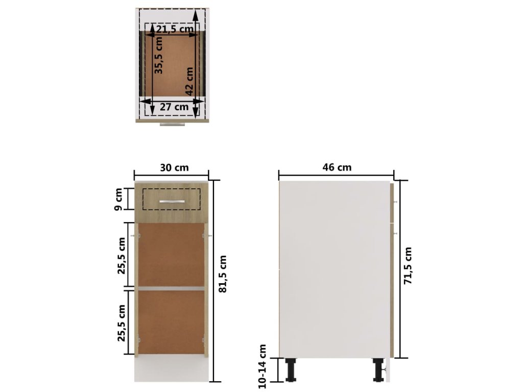 Úložná skrinka je trvácna a funkčná a postará sa o to, aby ste mali v kuchyni vždy poriadok. Skrinka má dve poličky a jednu zásuvku, ktoré ponúkajú dostatok priestoru na odkladanie misiek, tanierov, hrncov či iných kuchynských potrieb. Poličky zvonku chránia jedny dvierka, aby sa odložené veci nezašpinili. Skrinka sa navyše dá jednoducho očistiť navlhčenou handričkou.
