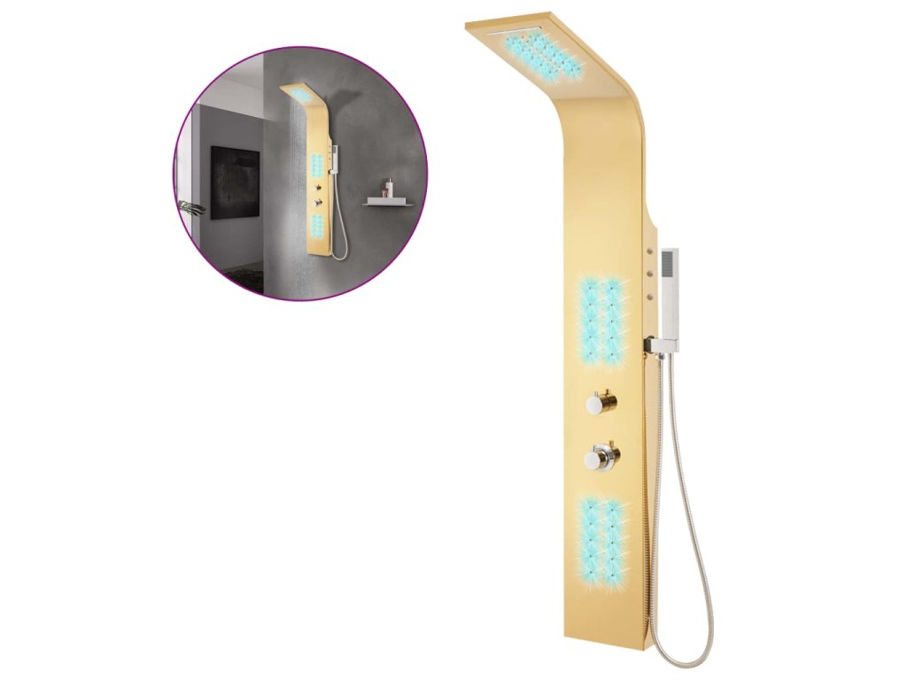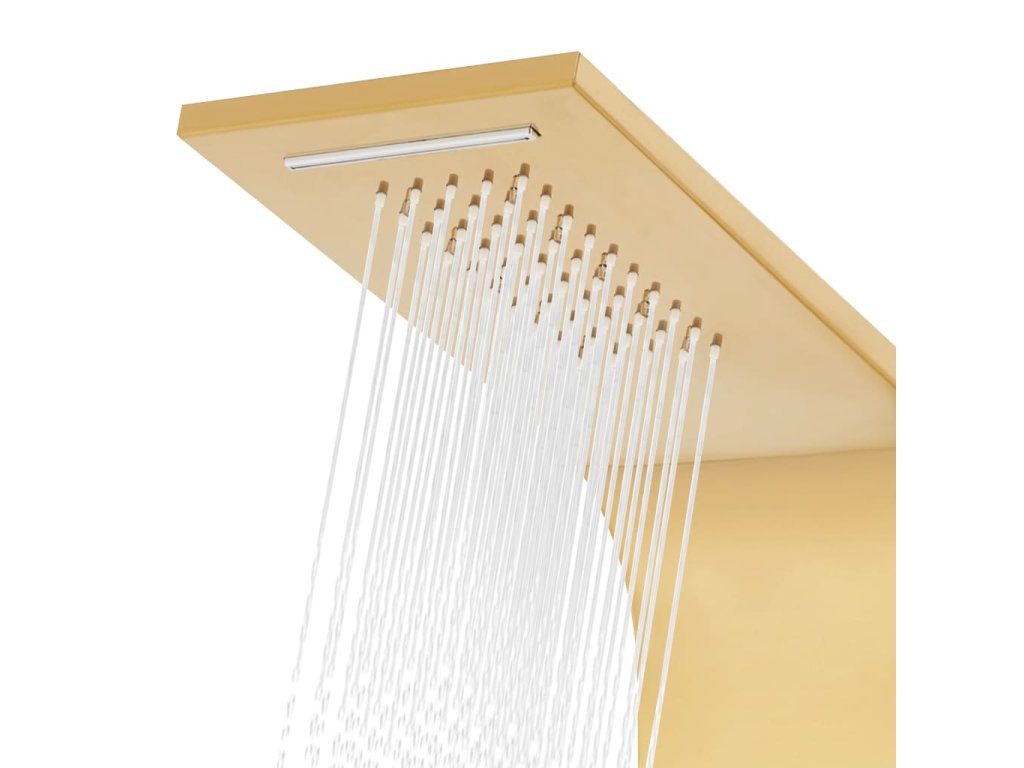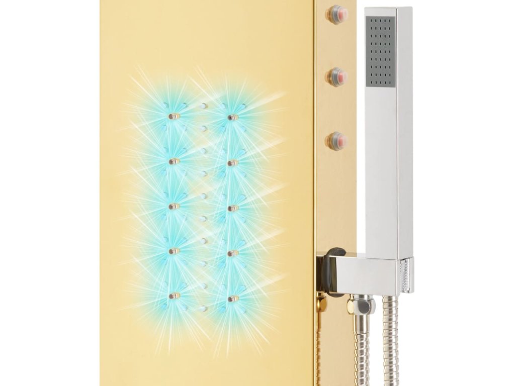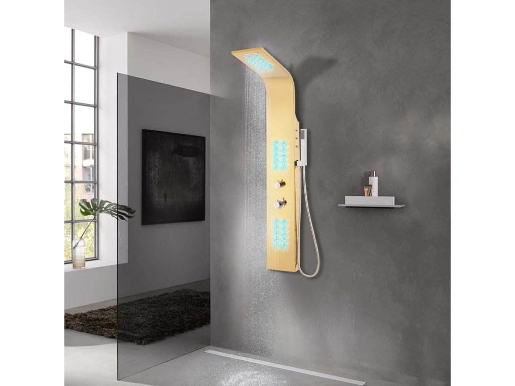Sprchový panel je vyrobený z odolnej nehrdzavejúcej ocele so zlatým lešteným povrchom a má krásny zahnutý dizajn. Má štyri rôzne režimy: dážď, vodopád, masážne trysky a ručnú sprchovú hlavicu. Režimy sa dajú ľahko meniť pomocou kohútikov. LED svietidlá môžu byť na základe vašej nálady buď zapnuté alebo vypnuté. Teplota vody je nastaviteľná pomocou gombíka termostatu.
