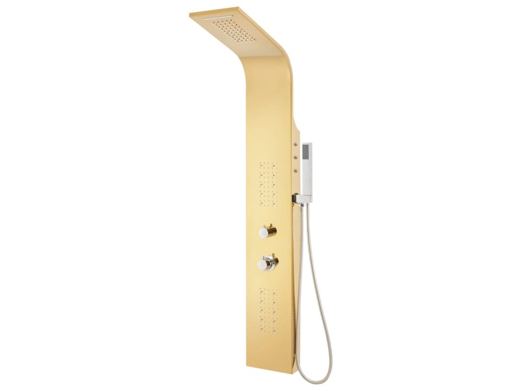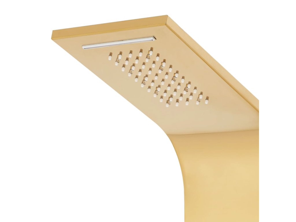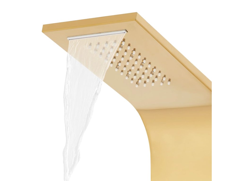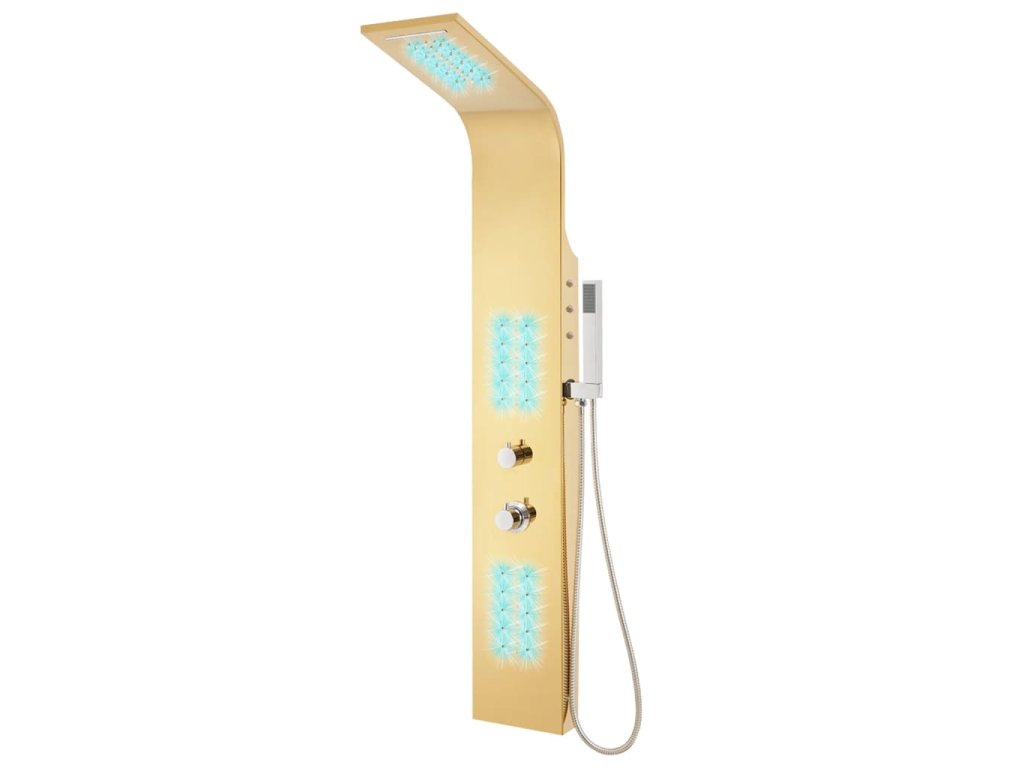 Sprchový panel je vyrobený z odolnej nehrdzavejúcej ocele so zlatým lešteným povrchom a má krásny zahnutý dizajn. Má štyri rôzne režimy: dážď, vodopád, masážne trysky a ručnú sprchovú hlavicu. Režimy sa dajú ľahko meniť pomocou kohútikov. LED svietidlá môžu byť na základe vašej nálady buď zapnuté alebo vypnuté. Teplota vody je nastaviteľná pomocou gombíka termostatu.