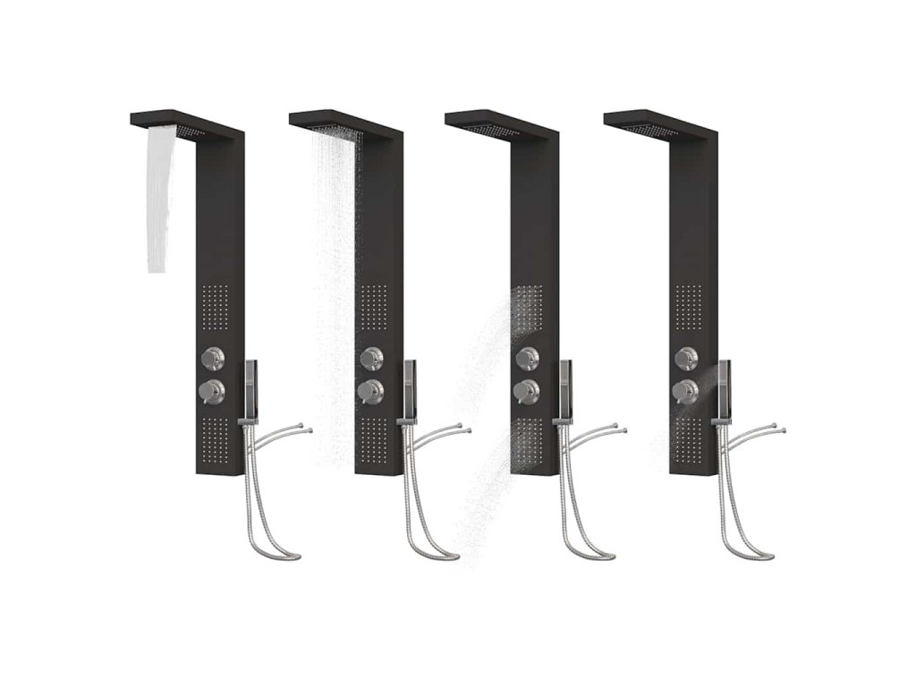 Sprchový panel je vyrobený z odolného hliníka a má krásny štvorcový dizajn. Má štyri rôzne režimy: dážď, vodopád, masážne trysky a ručnú sprchovú hlavicu. Režimy sa dajú ľahko meniť pomocou kohútikov.