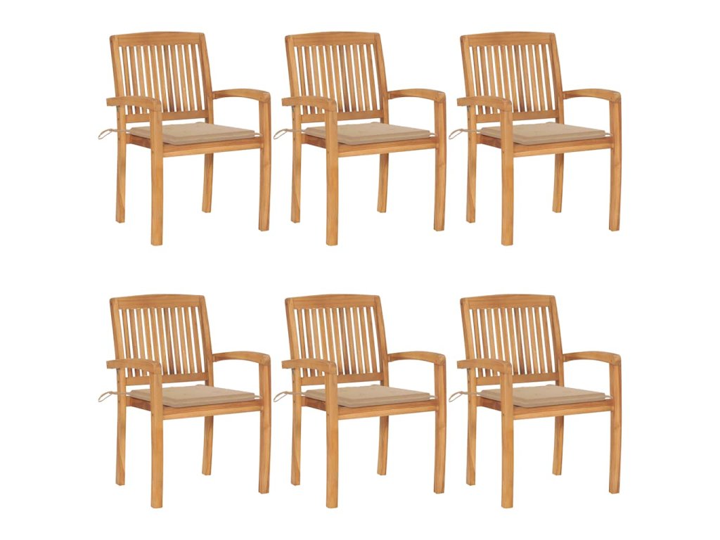 Táto sada tíkového nábytku je vyhotovená z mimoriadne trvácneho tvrdého tíkového dreva, ktoré bolo umelo vysušené v sušiarni a jeho povrch bol následne jemne obrúsený, aby získal hladký vzhľad. Tíkové drevo sa vyznačuje výnimočnou pevnosťou a odolnosťou voči poveternostným vplyvom, a tak predstavuje jeden z najvhodnejších materiálov na výrobu záhradného nábytku spomedzi všetkých ostatných druhov dreva. Ak si chcete zaobstarať záhradný nábytok, ktorý vám bude slúžiť dlhé roky, tíkové drevo je pre vás ako stvorené. Nevyžaduje si náročnú údržbu a dá sa ľahko očistiť vlhkou handričkou. Keď sa jedálenské stoličky nepoužívajú, stačí ich jednoducho poukladať na seba a odložiť, aby nezaberali veľa miesta. Navyše, pribalené vankúše poskytujú ďalšie pohodlie. Každý vankúš má 2 sady šnúrok, ktorými sa pevne pripevnia k stoličke.