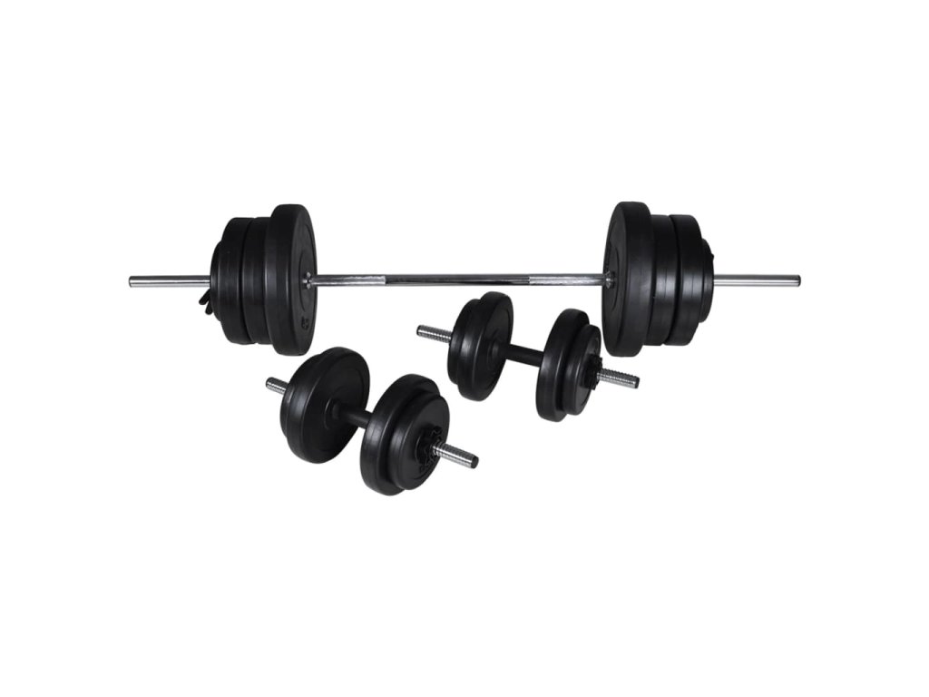 Súprava činiek barbell a dumbbell obsahuje pevné pochrómované činkové tyče s rychloupínacou pružinovou objímkou (pre tyč barbell), protišmykové ryhované rukoväte a vrúbkované hviezdicové uzávery (pre tyče dumbbell), ktoré zaisťujú bezpečné upevnenie kotúčových závaží. Budete tak môcť cvičiť bez obáv o svoje bezpečie. Posilňovacie kotúče sú vyrobené s robustným plášťom z polyetylénu. Dajú sa kombinovať tak, aby vyhovovali rôznym tréningovým požiadavkám.