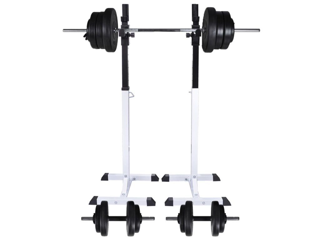 Tento robustný a stabilný stojan na činku / na drepy so sadou jednoručných a obojručných činiek je ideálny do vašej domácej posilňovne! V kombinácii s posilňovacou lavicou bude vhodný aj na tréning tlakov na lavici.