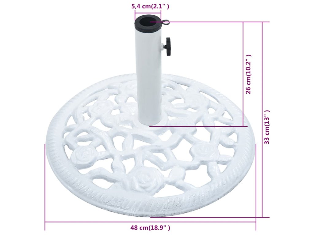 Stojan je vhodný na slnečníky s tyčou s priemerom 35, 38 alebo 48 mm. Precízne ornamenty a očarujúci motív kvetov prinesú do každej záhrady či iných vonkajších priestorov punc elegancie.