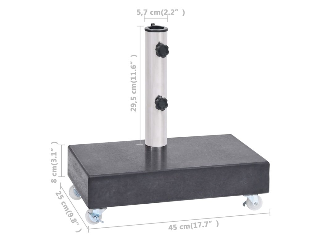 Držiak na slnečník má odolnú konštrukciu zo žuly, ktorá je veľmi stabilná vďaka svojej vysokej hmotnosti. Žula taktiež vyzerá nádherne a dodáva stojanu sofistikovaný vzhľad. Tento stojan dodá vášmu vonkajšiemu obytnému priestoru eleganciu a krásne doplní aj luxusný záhradný nábytok. Rúrka je vyrobená z nehrdzavejúcej ocele. Kolieska navyše umožňujú jeho ľahké presúvanie.
