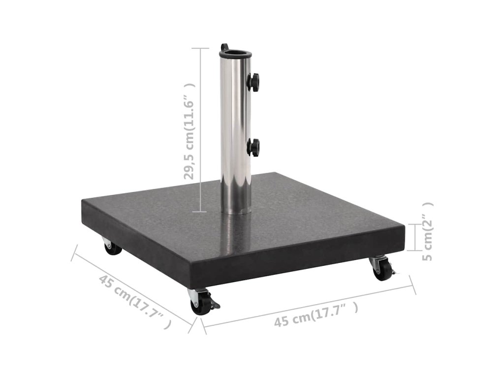 Tento podstavec na slnečník je vyrobený z pevnej žuly s hmotnosťou 30 kg, a preto je mimoriadne stabilný a postará sa o to, aby slnečník držal na mieste aj vo veternom počasí. Stojan má 2 uzamykacie skrutky, ktoré udržujú tyč slnečníka na svojom mieste. V balení sa nachádza jeden adaptér, vďaka ktorému je držiak na slnečník vhodný na tyče s priemerom 38/48 mm. Vďaka 4 otočným kolieskam môžete slnečník jednoducho premiestniť.
