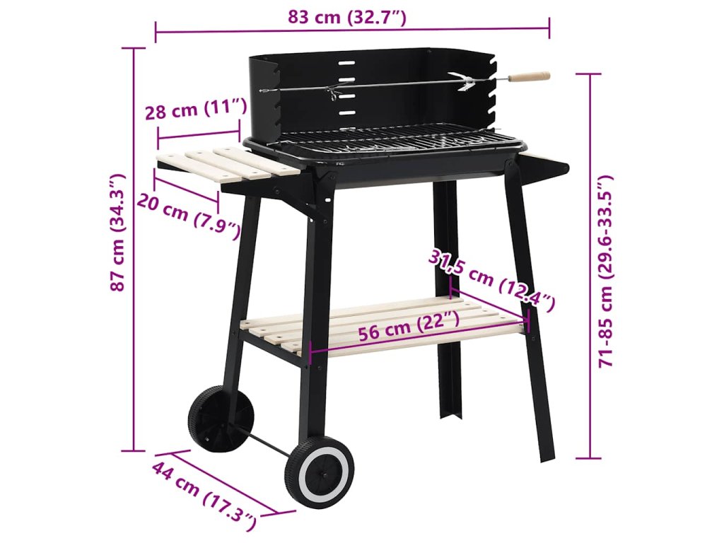 Má aj bočnú poličku a spodná policu, na ktorej môžete pohodlne uskladniť svoje príslušenstvo na grilovanie. S chrómovanou mriežkou na varenie a súpravou na opekanie bude vaša grilovačka jednoduchá a zábavná! Tento gril je vybavený 2 kolieskami a dá sa ľahko premiestňovať.