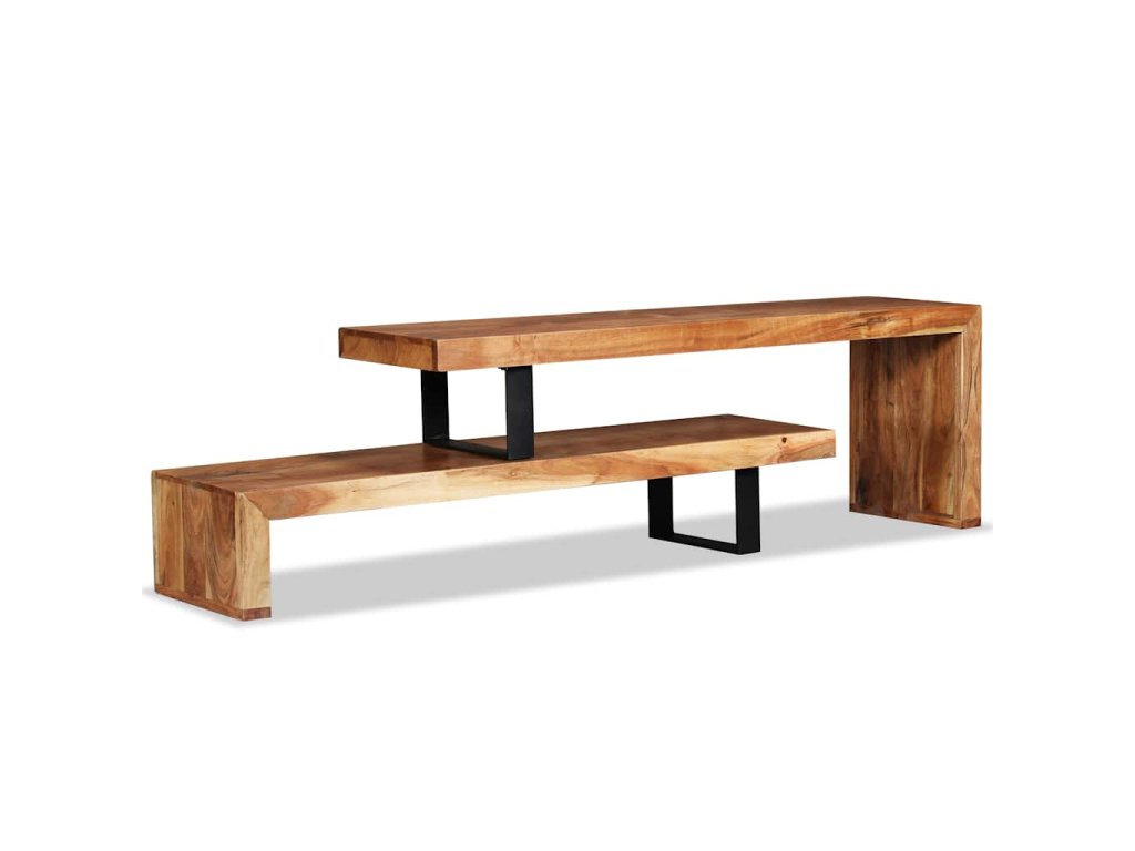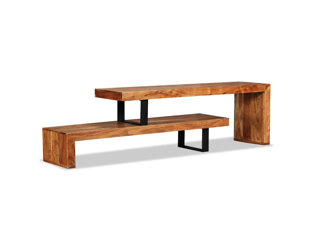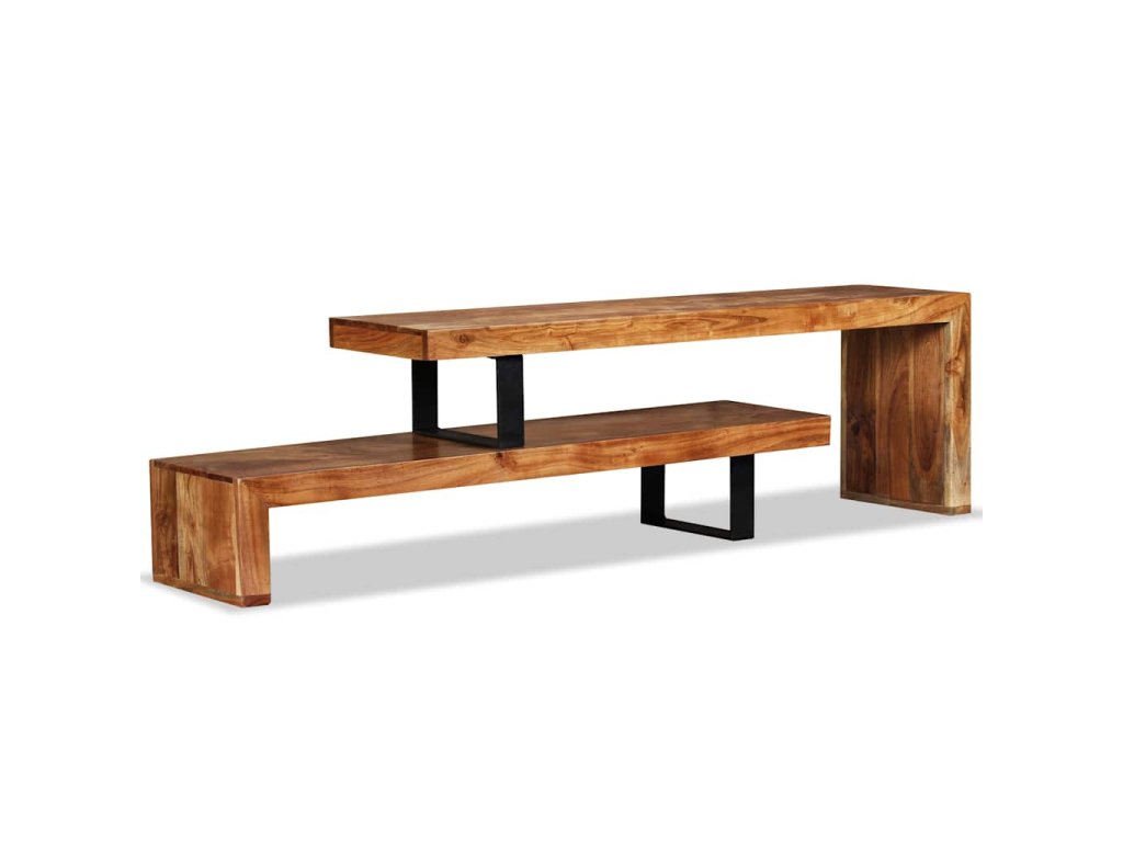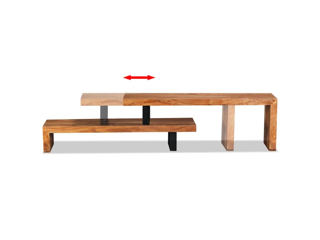 Stolík pod TV bol ručne vyrobený z masívneho akáciového dreva, ktoré je stabilné, odolné a krásne. Remeselné spracovanie mu dodáva veľkolepý retro štýl. Každý krok procesu výroby sa vykonáva s najväčšou starostlivosťou, či už ide o leštenie alebo lakovanie. Vďaka remeselnému spracovaniu a štruktúre dreva je každý kus nábytku jedinečný a trochu odlišný od ďalších kusov. 2 poličky v rôznych úrovniach poskytujú dostatok priestoru na uskladňovanie multimediálnych zariadení, nosičov médií a akýchkoľvek iných predmetov, ktoré chcete vystaviť alebo mať na dosah ruky. Horná časť tohto stolíka sa dá odstrániť alebo umiestniť v rôznych polohách, čím môžete upravovať jeho šírku.
