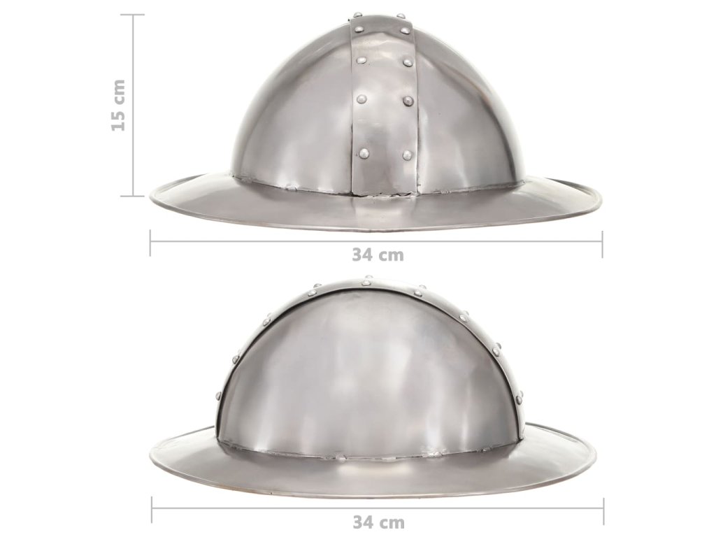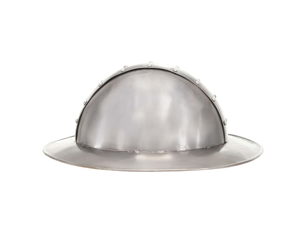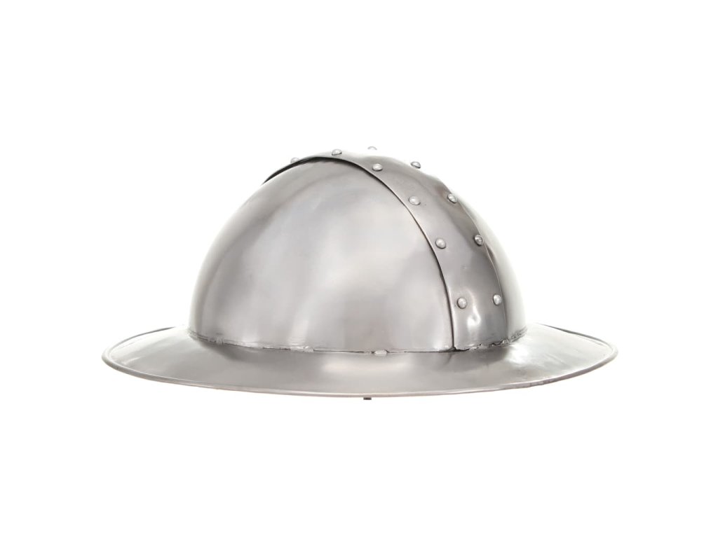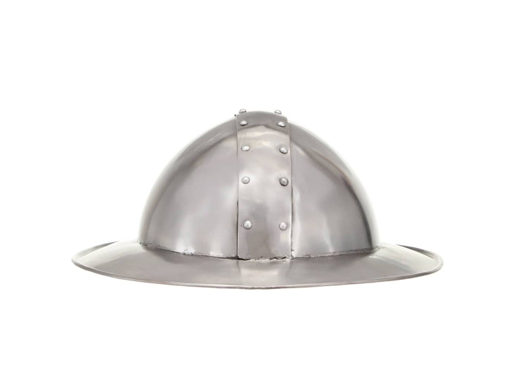 Pancierová prilba je presnou replikou stredovekej prilby zvanej železný klobúk. Táto rímska prilba, vyrobená z 1,2 mm ocele kombinuje starožitný štýl a odolný materiál. Vzniká tak pútavá prilba, ktorá dokonale ladí s vaším rytierskym outfitom. Prilba je okrúhla a vďaka širokému okraju pomáha ochrániť svojho nositeľa pred oslepujúcim slnkom, silným dažďom, atď. Nastavovací remienok pod bradu vám túto prilbu udrží na svojom mieste. Okrem toho sa jedná aj o pútavý výstavný kúsok.