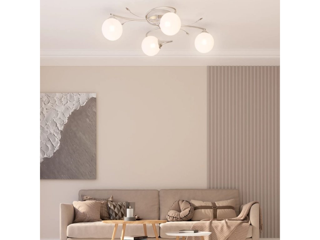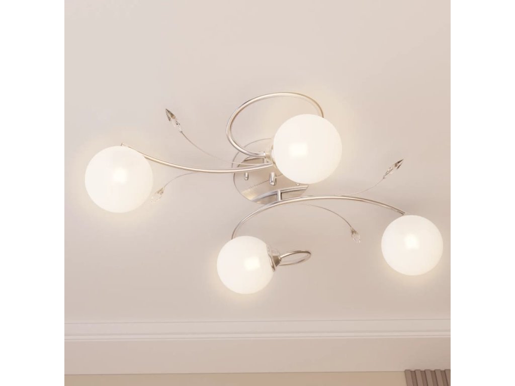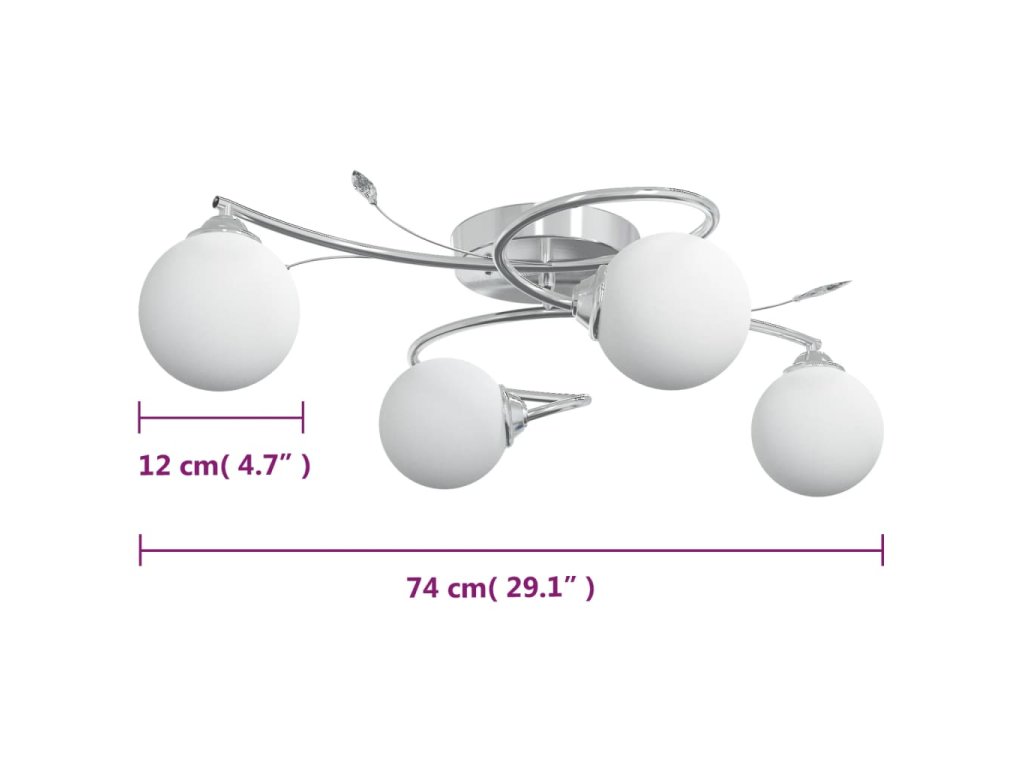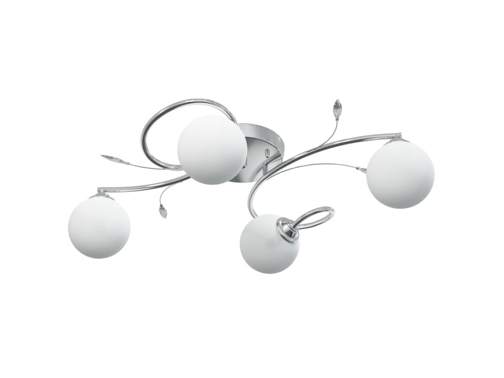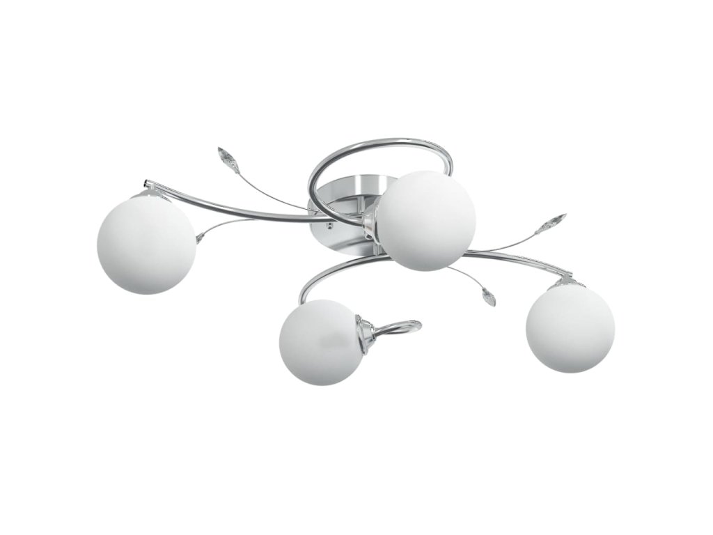 Toto jedinečné stropné svietidlo s elegantnými akrylovými dekoráciami listov a 4 guľovitými sklenenými tienidlami bude skvelým doplnkom do každej obývačky alebo spálne.