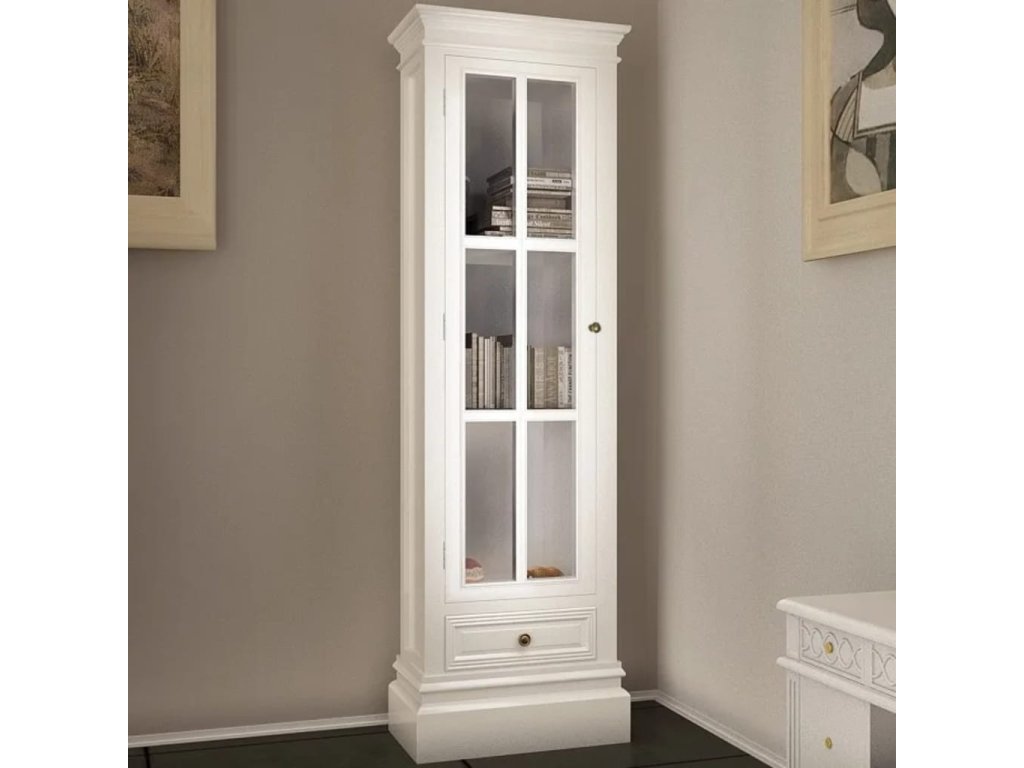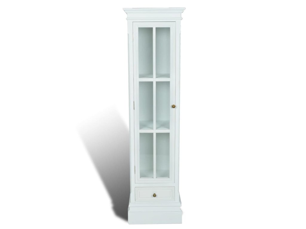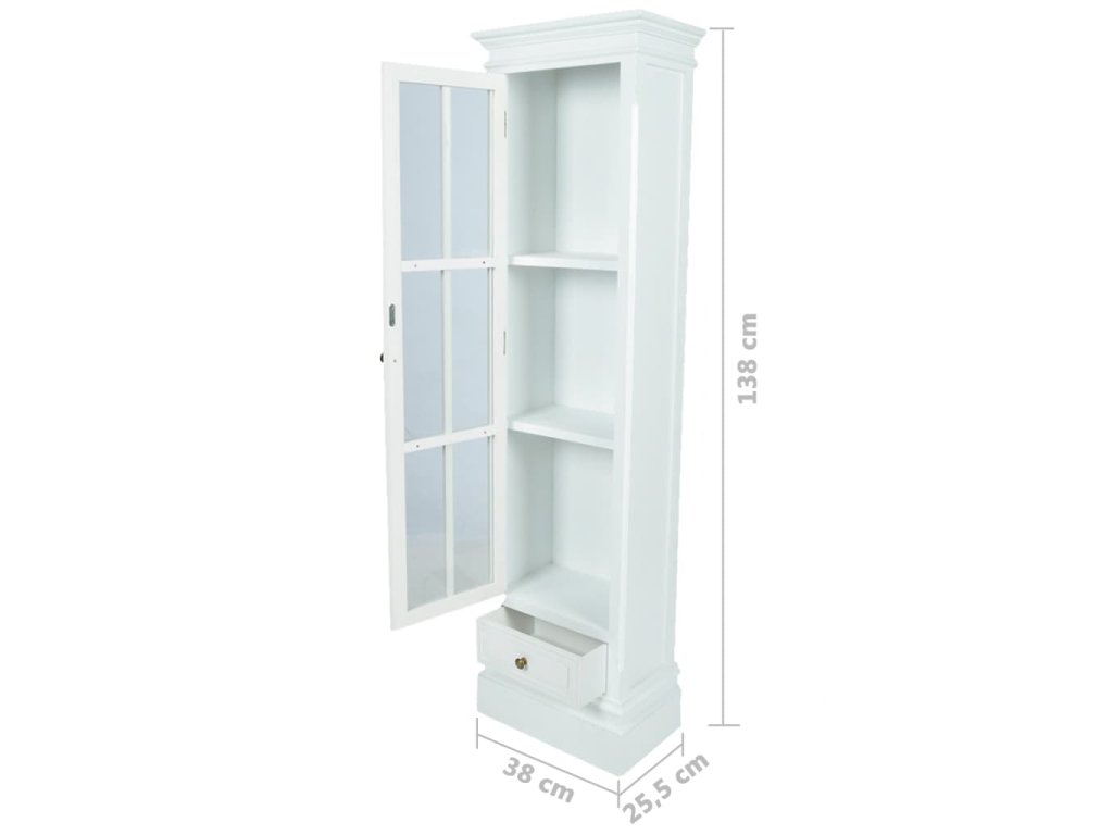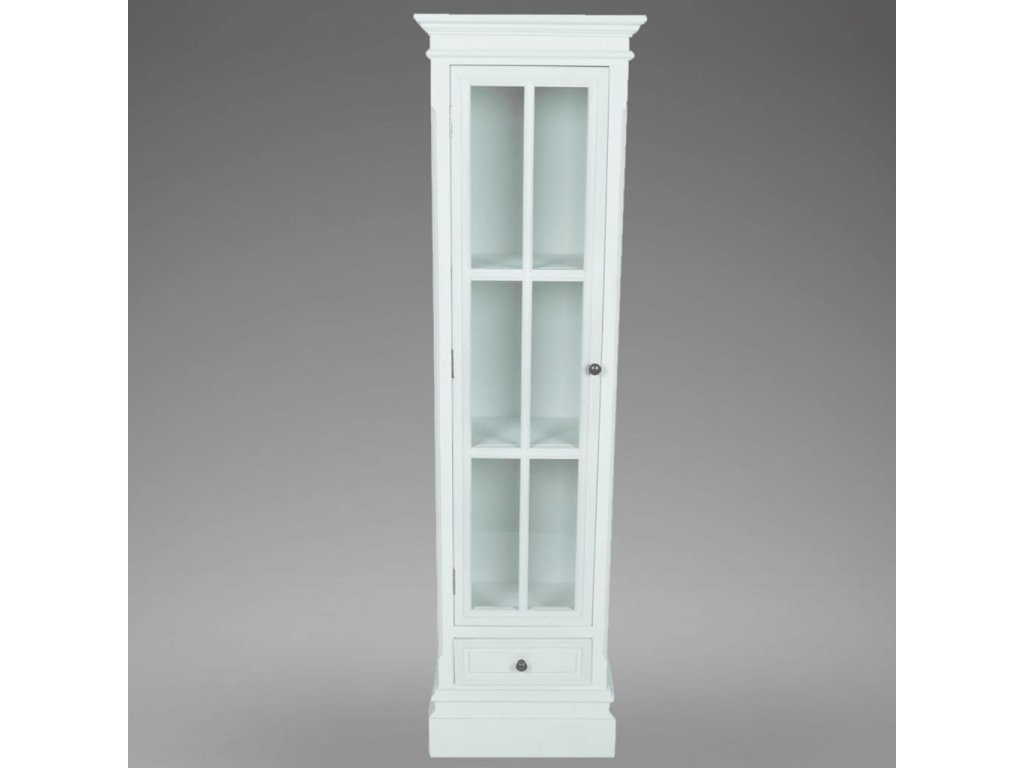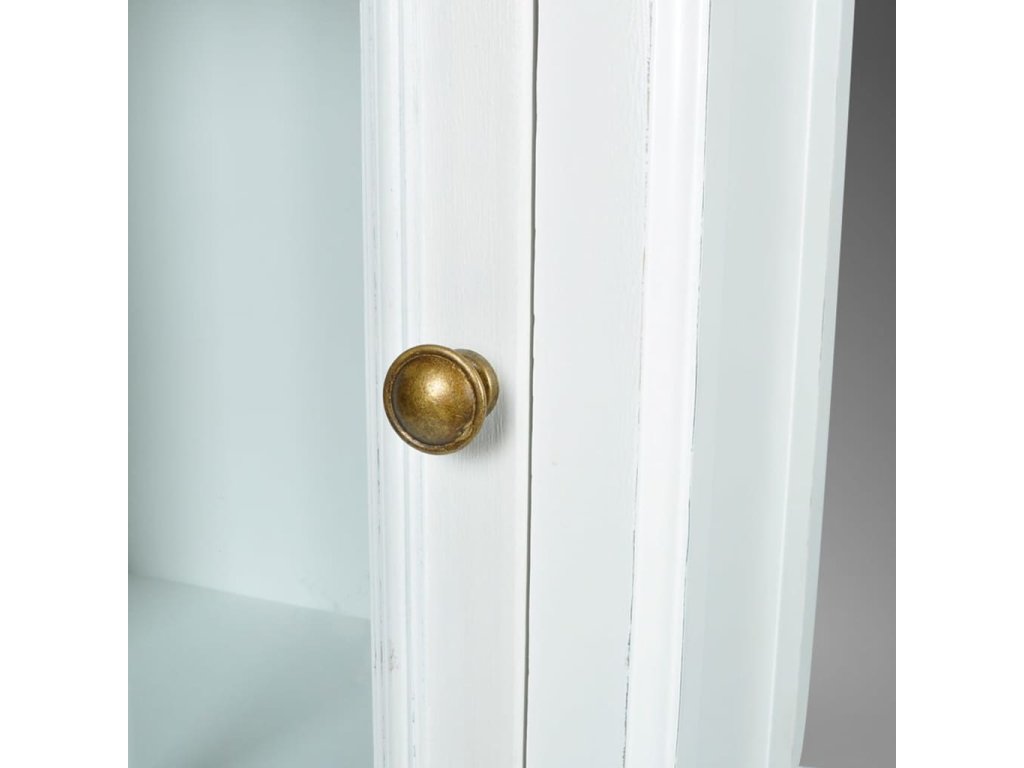 Vitrína je vyrobená z trvácneho a ľahkého MDF s bielym náterom a ošúchaným povrchom, ktorý skrinke dodáva nedbalý starožitný vzhľad. Vďaka svojmu všestrannému a štýlovému dizajnu predstavuje skvelý doplnok do domácnosti.