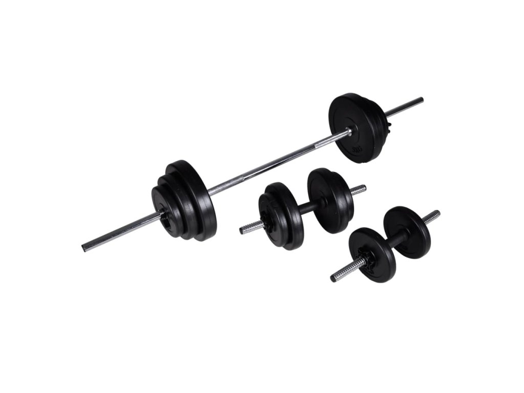 - Sada činky barbell so závažiami: Táto ergonomicky tvarovaná sada obsahuje 1 činku barbell, 2 činky dumbbell a 12 závaží s celkovou hmotnosťou 30,5 kg vrátané tyčí.