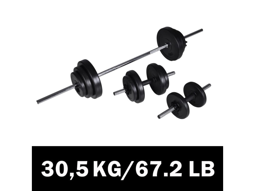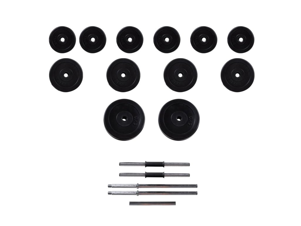 Táto súprava činiek barbell a dumbbell vám umožní zacvičiť si priamo v pohodlí vášho domova. Celá súprava váži 30,5 kg a obsahuje 12 kotúčových závaží s hmotnosťou 1,25 kg, 2,5 kg a 5 kg.