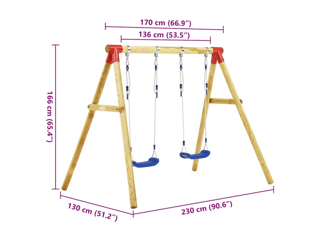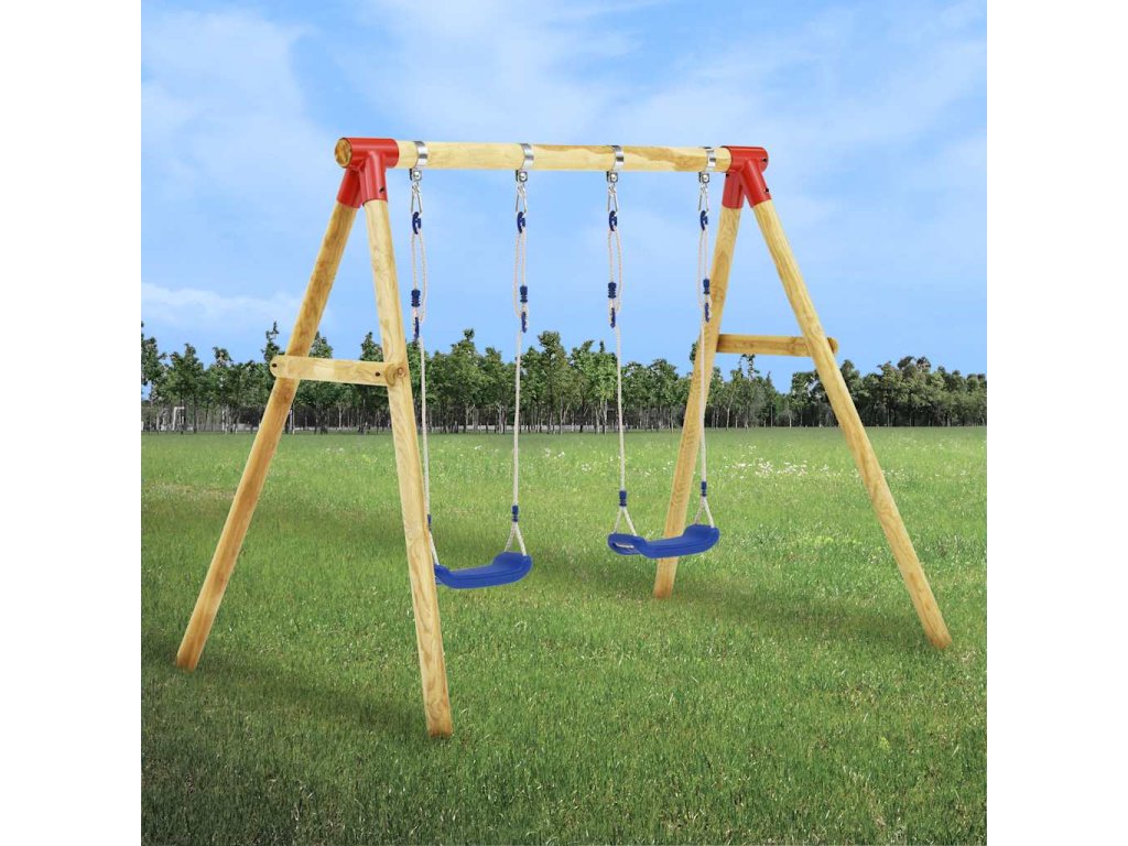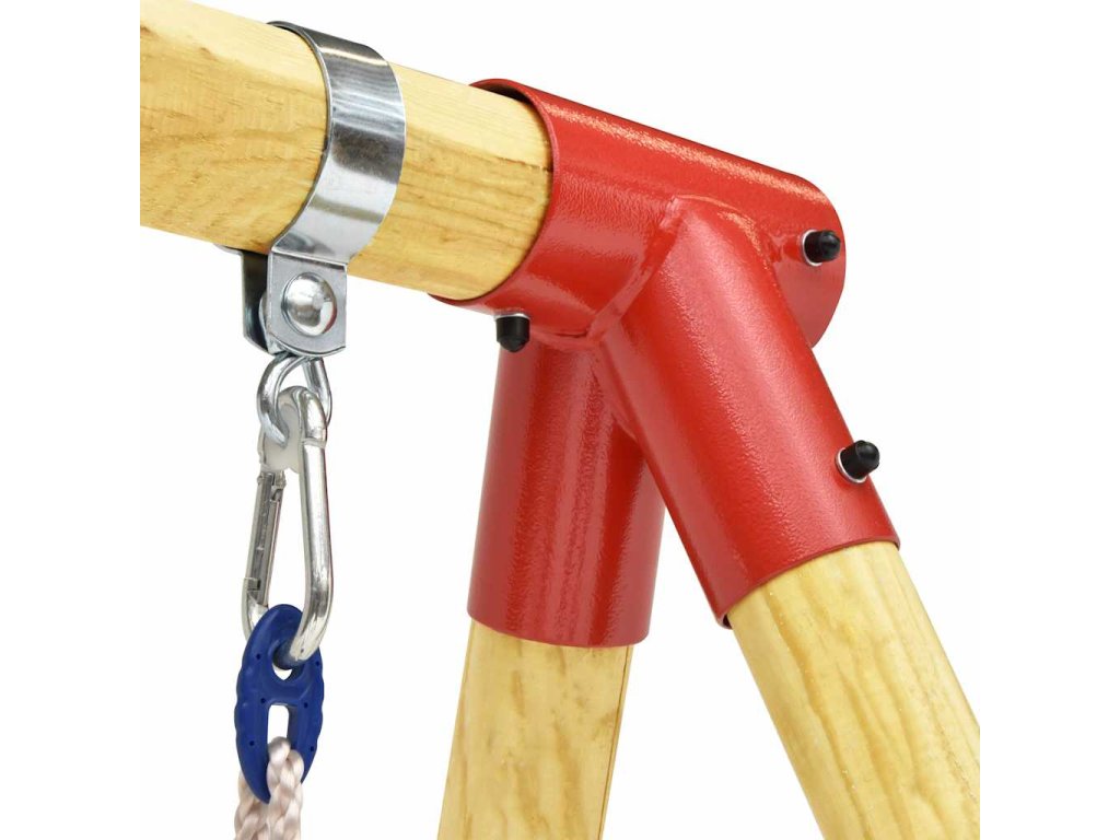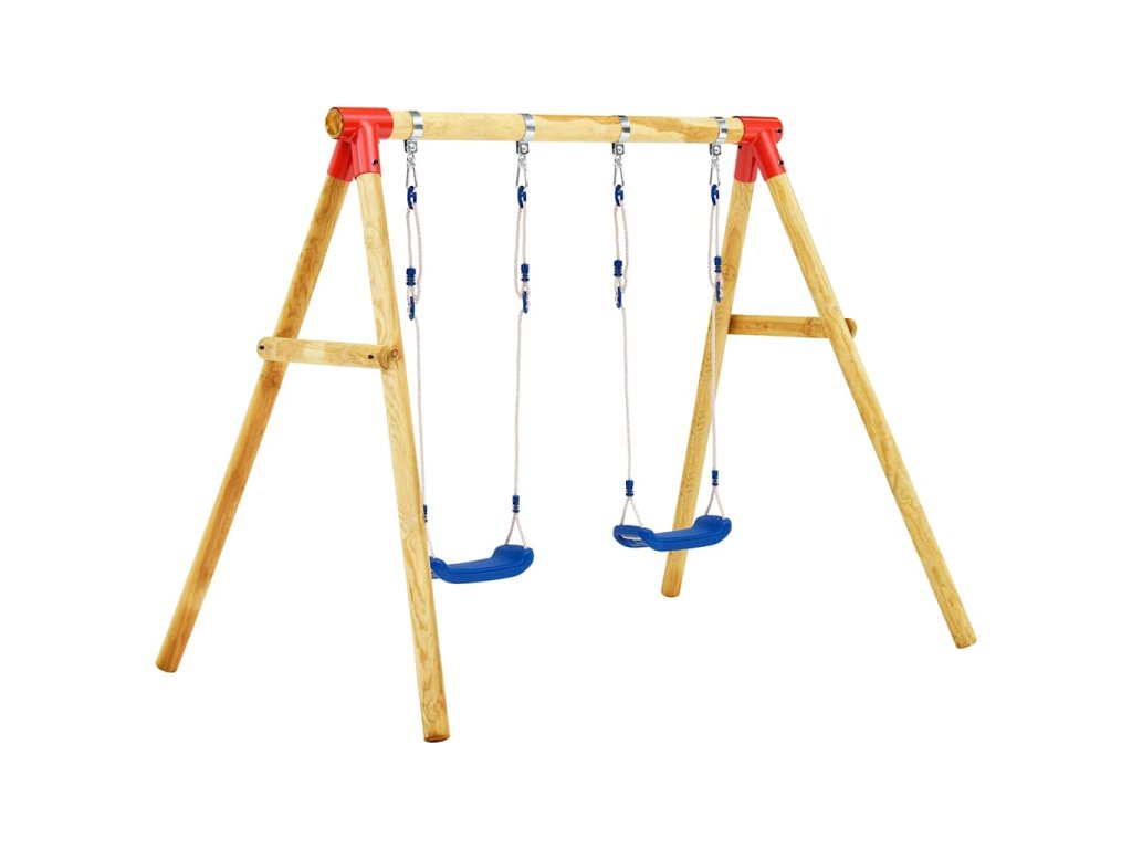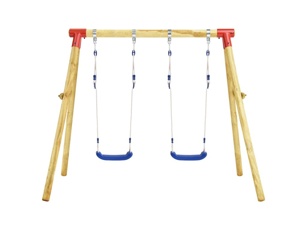 Súprava hojdačiek je vyrobená z borovicového masívu so zelenou impregnáciou a pevného plastu, a preto je mimoriadne pevná, trvácna a odolná voči poveternostným vplyvom. Hojdačky sú k rámu pripevnené pomocou kovových hákov, ktoré odolávajú opotrebovaniu. Rodičia preto môžu byť pokojní, že sa ich deti hrajú na kvalitnom ihrisku, ktoré spĺňa najnovšie bezpečnostné štandardy.