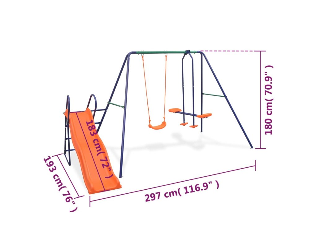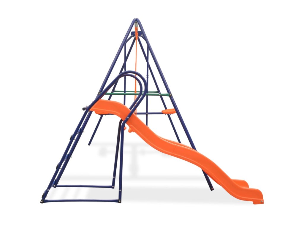 Sada hojdačiek pozostáva z pevného kovového rámu v tvare písmena A s hojdačkou pre jedného, hojdačkou s dvoma sedadlami a šmýkačkou dlhou 183 cm. Na dvojitej hojdačkej sa môžu hojdať dve deti naraz. Vďaka pevnému oceľovému rámu a plastovým sedadlám a šmýkačke je celá súprava veľmi trvácna a odolná voči poveternostným vplyvom a zároveň sa jednoducho montuje. Hojdačky a šmýkačka sú pevne pripojené k stabilnému rámu v tvare písmena A pomocou odolných držiakov, skrutiek, hákov a lán a súčasťou súpravy je aj stabilný a robustný rebrík, vďaka ktorému sa deti dostanú k šmýkačke.