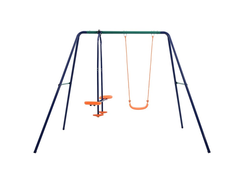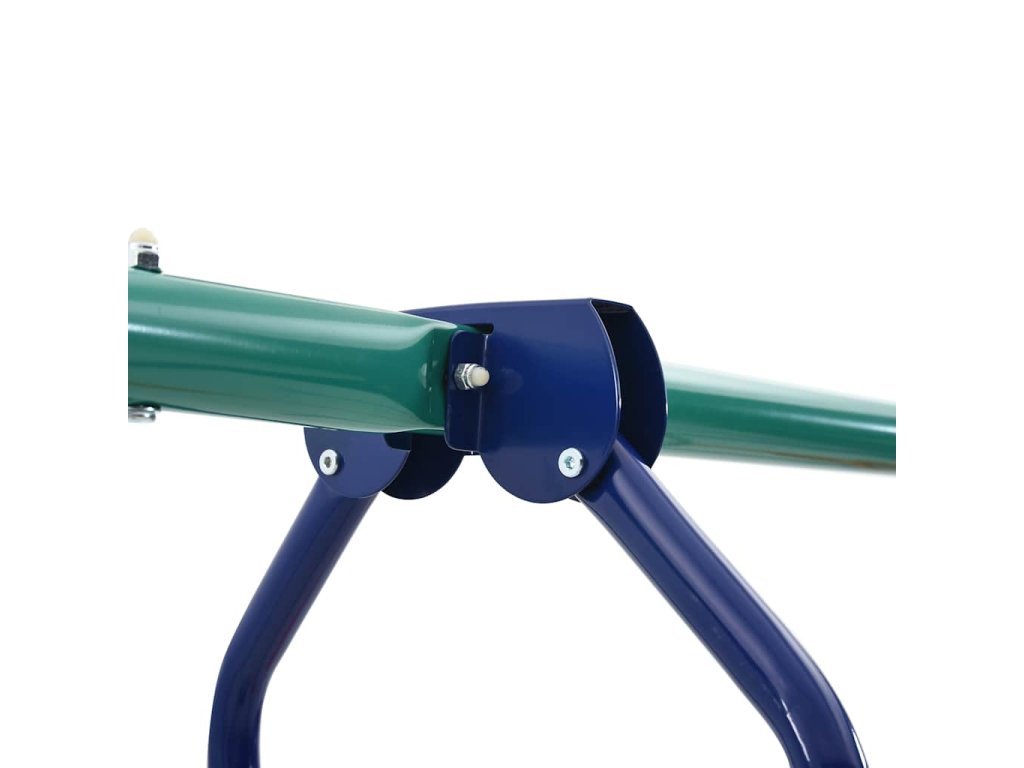 Sada hojdačiek sa skladá z pevného oceľového rámu v tvare písmena A s jednomiestnou hojdačkou a jednou dvojitou hojdačkou. Dvojitá hojdačka so sedadlami je vhodná pre dve deti súčasne. Vďaka pevnému oceľovému rámu a plastovým sedadlám je sada veľmi trvácna a odolná voči poveternostným vplyvom. Jednoducho sa inštaluje. Všetky prvky sú pevne pripevnené k priečnemu nosníku rámu v tvare písmena A pomocou pevných konzol, skrutiek, hákov a lán.