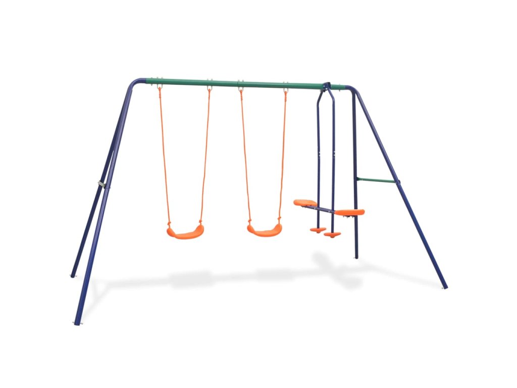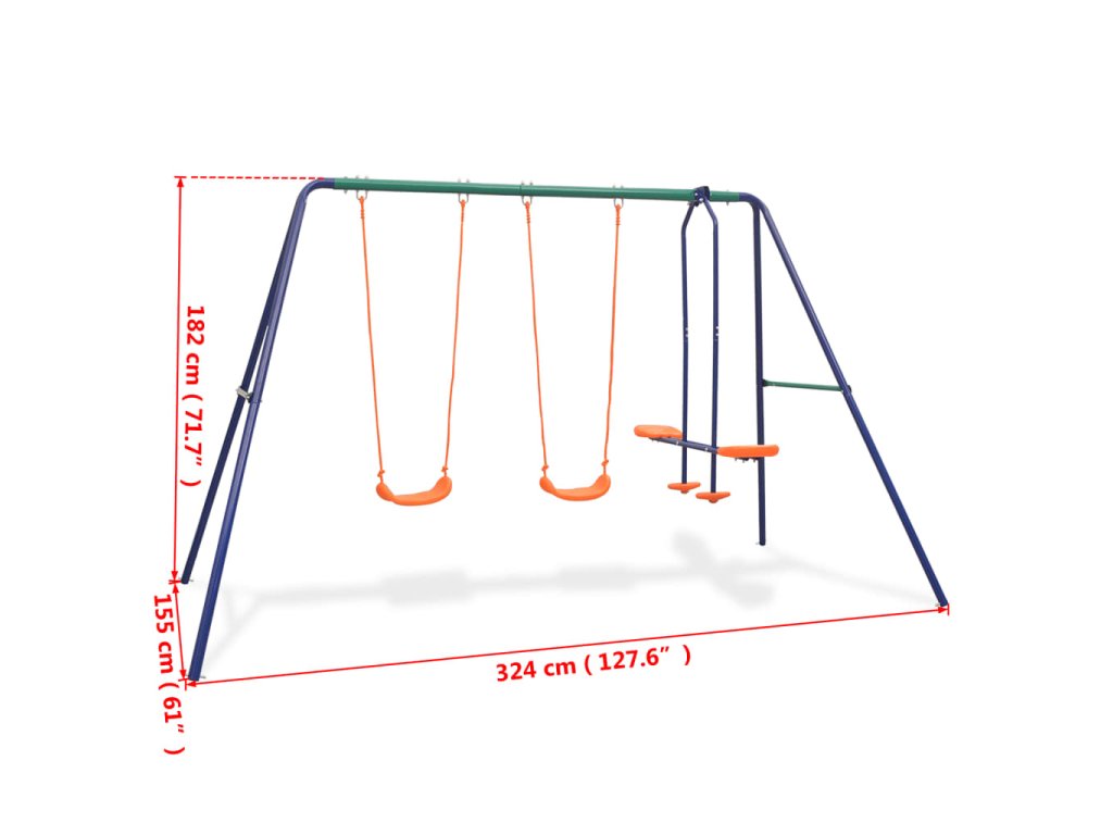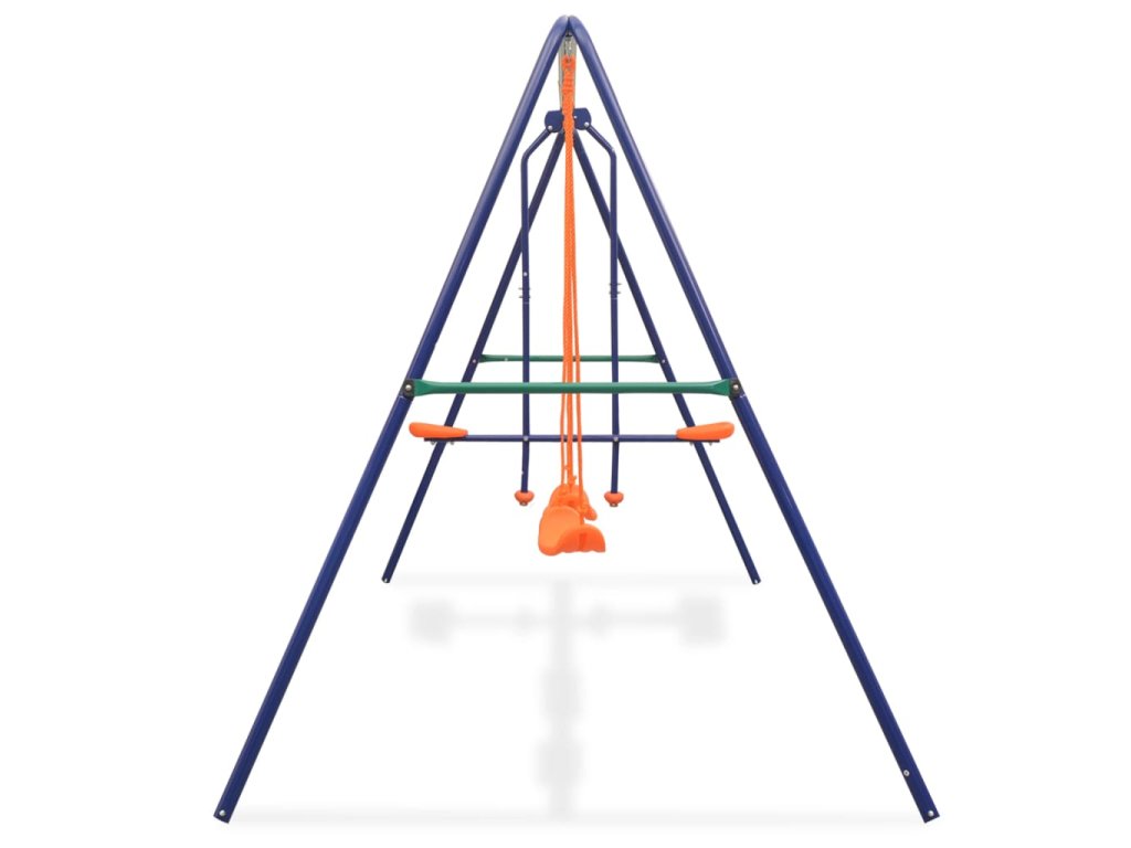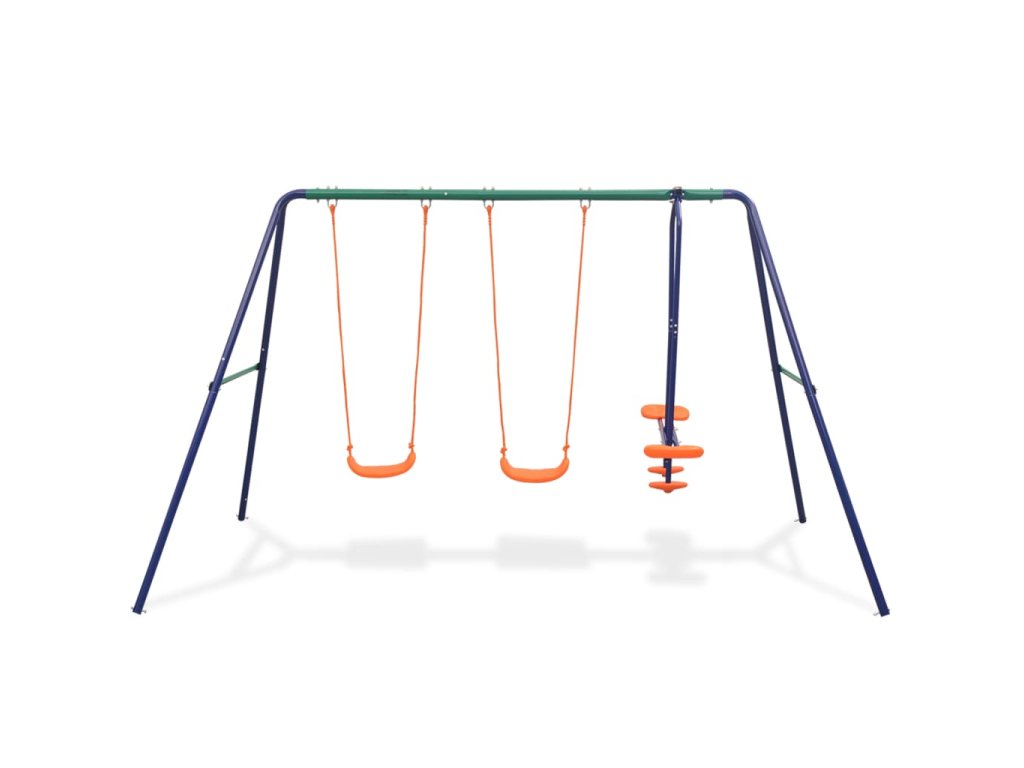 Sada hojdačiek pozostáva z pevného kovového rámu v tvare písmena A s 2 hojdačkami pre jedného a jednou hojdačkou s dvoma sedadlami. Na dvojitej hojdačkej sa môžu hojdať dve deti naraz. Vďaka pevnému oceľovému rámu a plastovým sedadlám je celá súprava veľmi trvácna a odolná voči poveternostným vplyvom a zároveň sa jednoducho montuje. Všetky hojdačky sú pevne pripojené k stabilnému rámu v tvare písmena A pomocou odolných držiakov, skrutiek, hákov a lán.