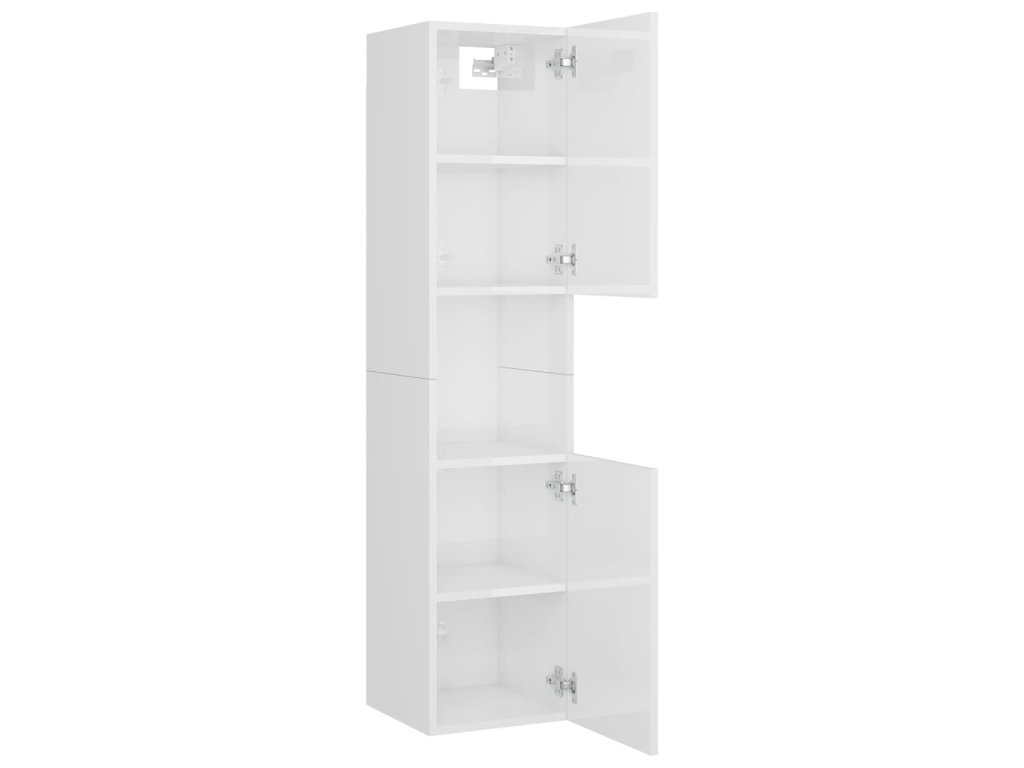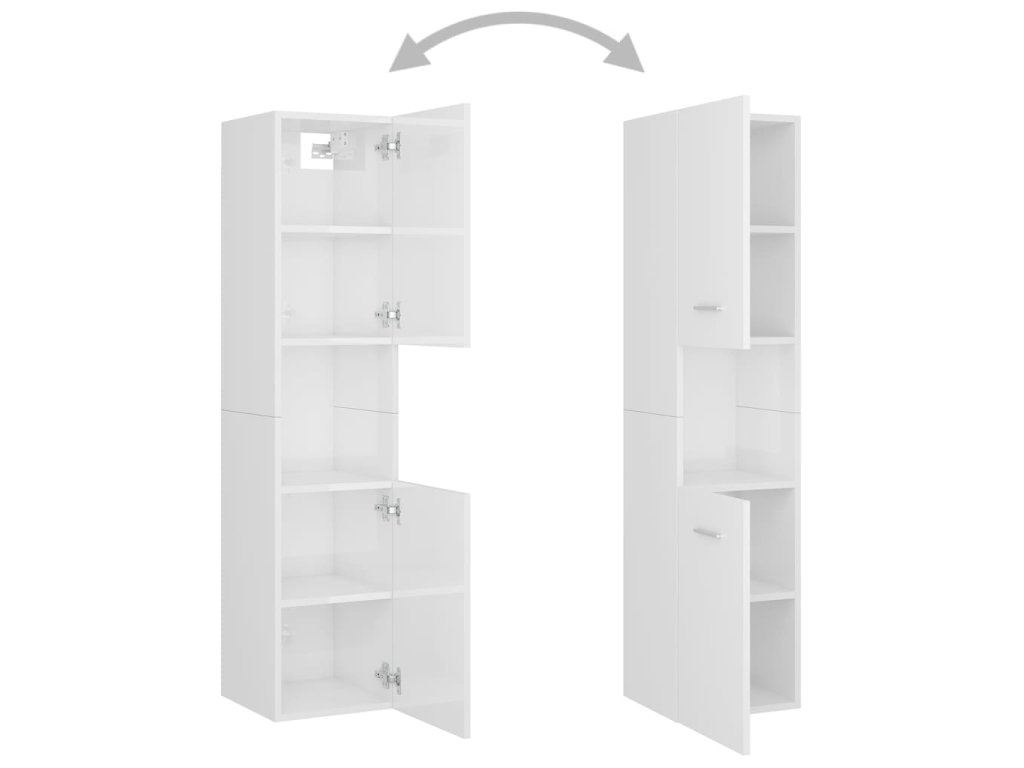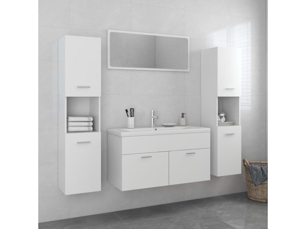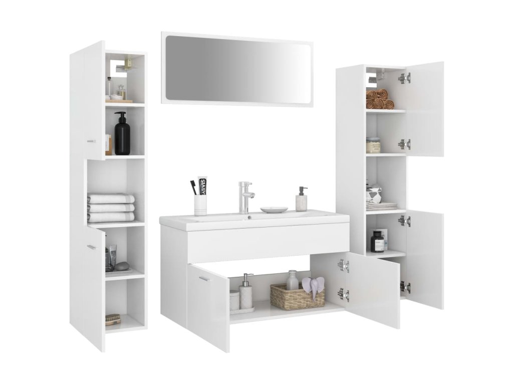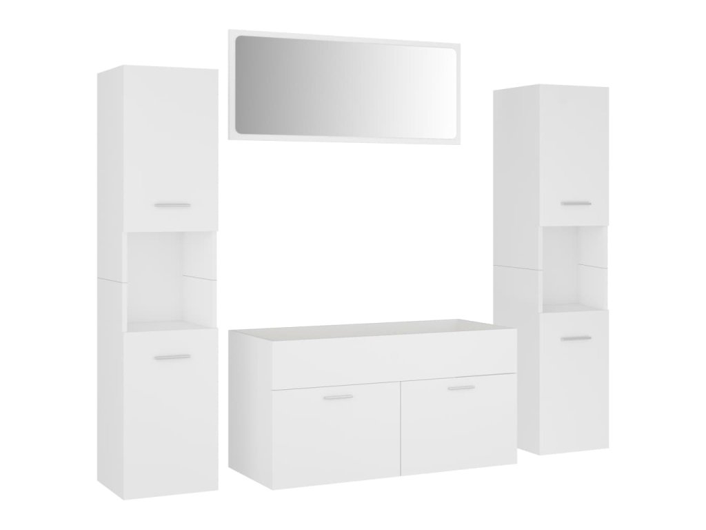 Súprava nábytku sa skladá z umývadlovej skrinky, 2 vysokých skriniek a zrkadla. Elegantná umývadlová skrinka má 1 priehradku a jej vrchná časť je ideálna na umiestnenie drezu. Každá vysoká skrinka má celkom 5 oddelení a 2 dvere, čo ponúka dostatok priestoru na uloženie predmetov vo vašej kúpeľni. Zrkadlo tiež dodá vášmu interiéru vynikajúci vzhľad. Navyše sa táto kúpeľňová sada ľahko čistí vlhkou handričkou.