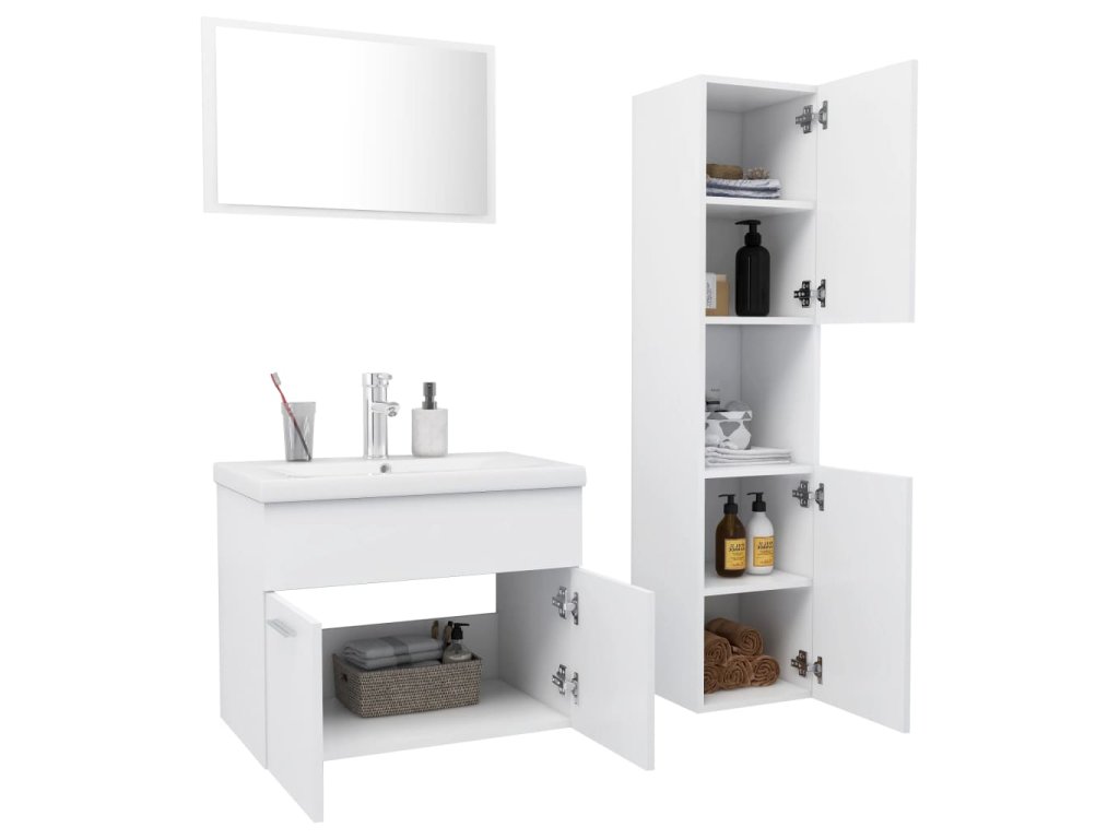 Súprava nábytku pozostáva z umývadlovej skrinky s umývadlom, vysokej skrinky a zrkadla. Elegantná umývadlová skrinka má 1 priehradku a bude sa perfektne hodiť pod umývadlo, vďaka čomu môžete veci v kúpeľni pekne zorganizovať. Umývadlo je vyrobené z keramiky a môže slúžiť nielen ako nádoba na každodenné používanie, ale aj ako ozdoba vo vašom obývacom priestore. Vďaka svojmu štýlovému a modernému dizajnu sa bude toto umývadlo hodiť do akéhokoľvek interiéru. Prepad je vybavený otvorom na odtekanie vody, keď sa umývadlo príliš naplní. Vysoká skrinka má 5 priehradiek a 2 dvierka, a ponúka dostatok priestoru na uloženie vecí vo vašej kúpeľni. Zrkadlo zase vytvorí krásny doplnok. Táto kúpeľňová súprava sa navyše ľahko čistí vlhkou handričkou.