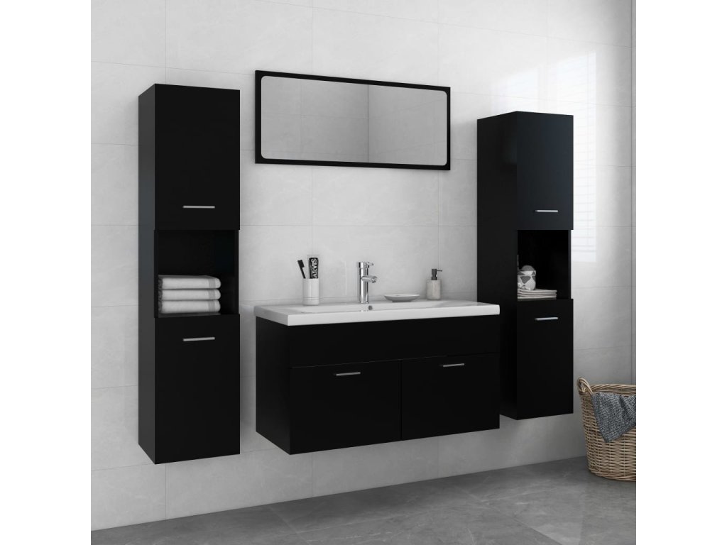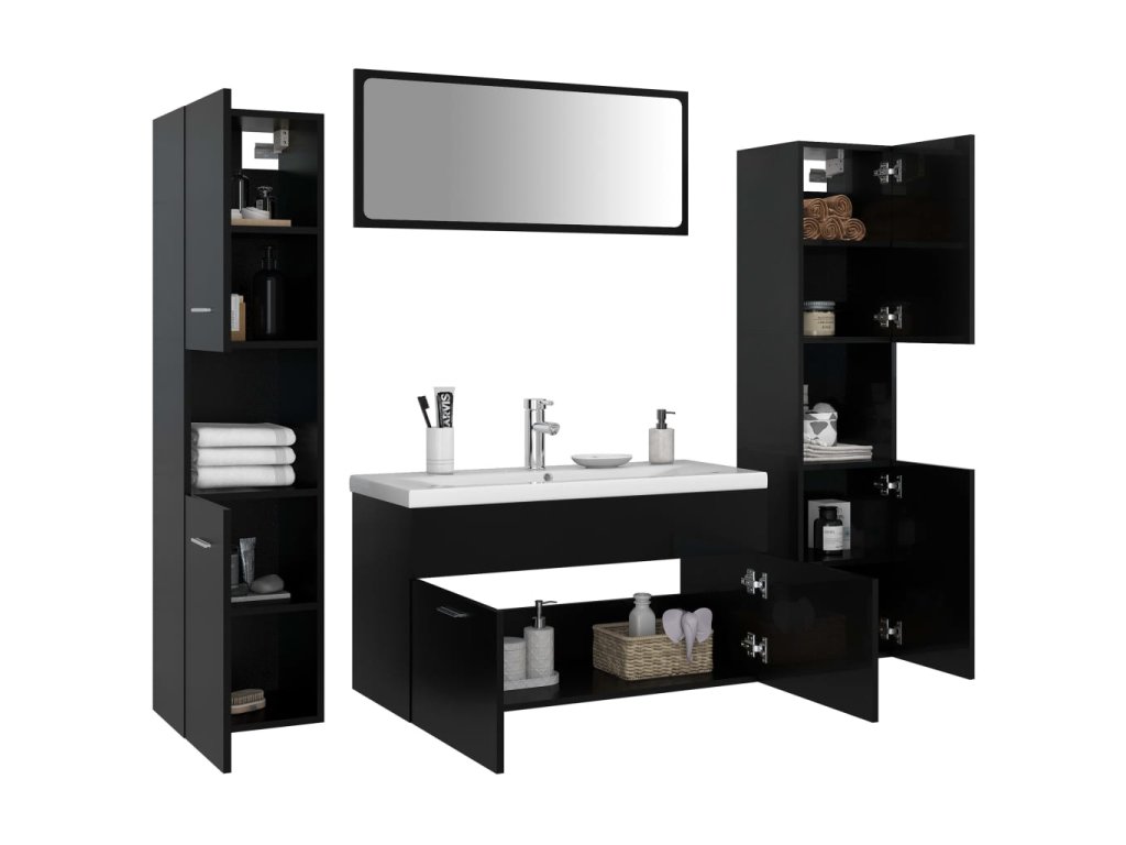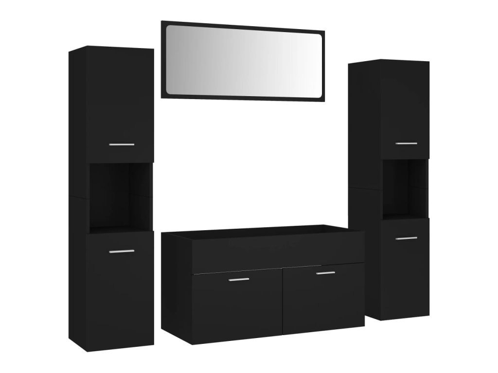 Súprava nábytku sa skladá z umývadlovej skrinky, 2 vysokých skriniek a zrkadla. Elegantná umývadlová skrinka má 1 priehradku a jej vrchná časť je ideálna na umiestnenie drezu. Každá vysoká skrinka má celkom 5 oddelení a 2 dvere, čo ponúka dostatok priestoru na uloženie predmetov vo vašej kúpeľni. Zrkadlo tiež dodá vášmu interiéru vynikajúci vzhľad. Navyše sa táto kúpeľňová sada ľahko čistí vlhkou handričkou.