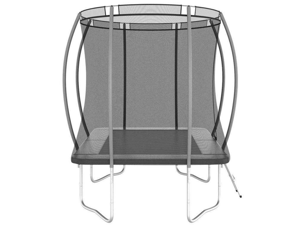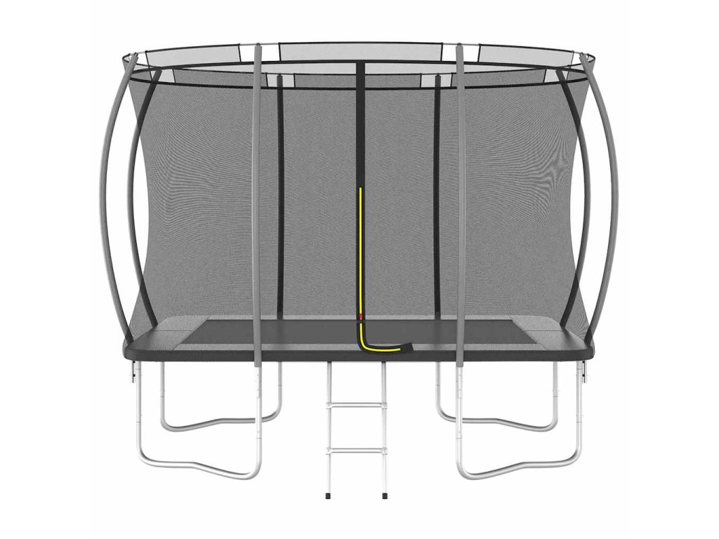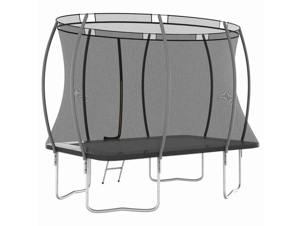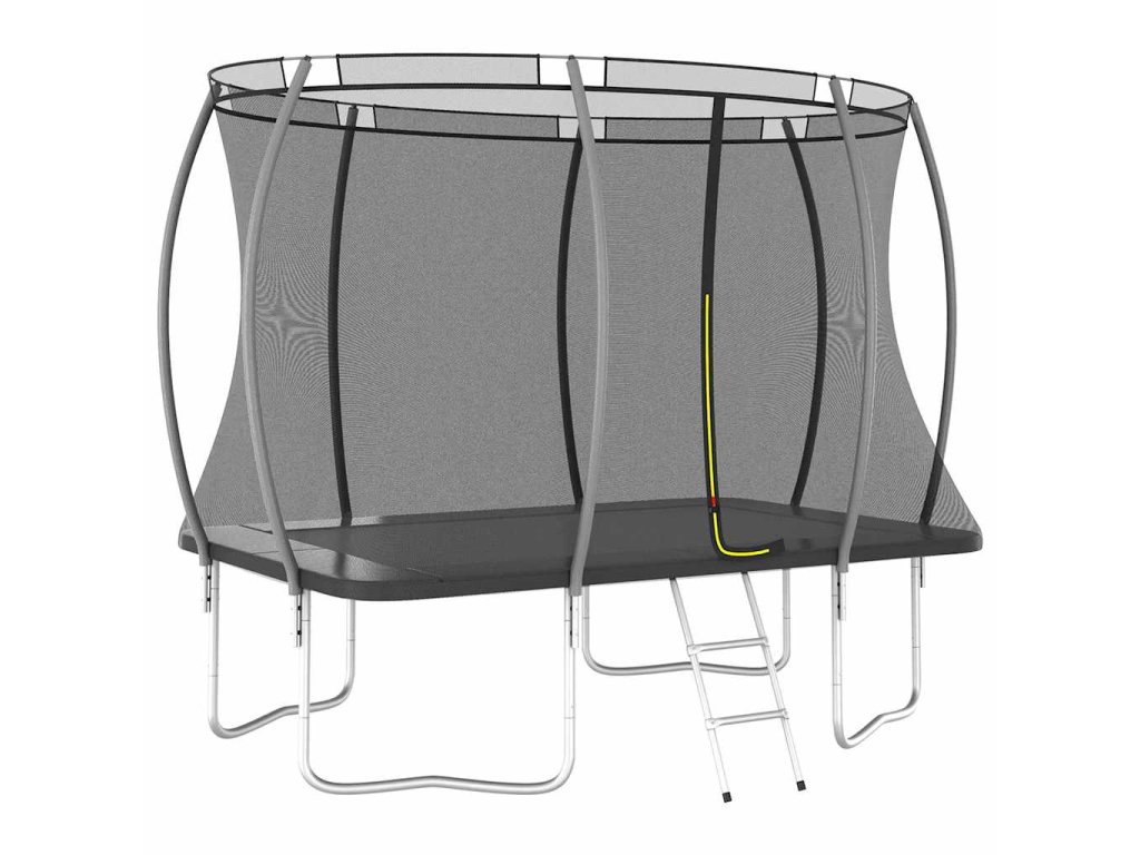 Užite si veľa zábavy a skákania s touto obdĺžnikovou trampolínou! Táto trampolínová sada obsahuje bezpečnostnú sieť, vstupný rebrík a pokrývku proti dažďu.