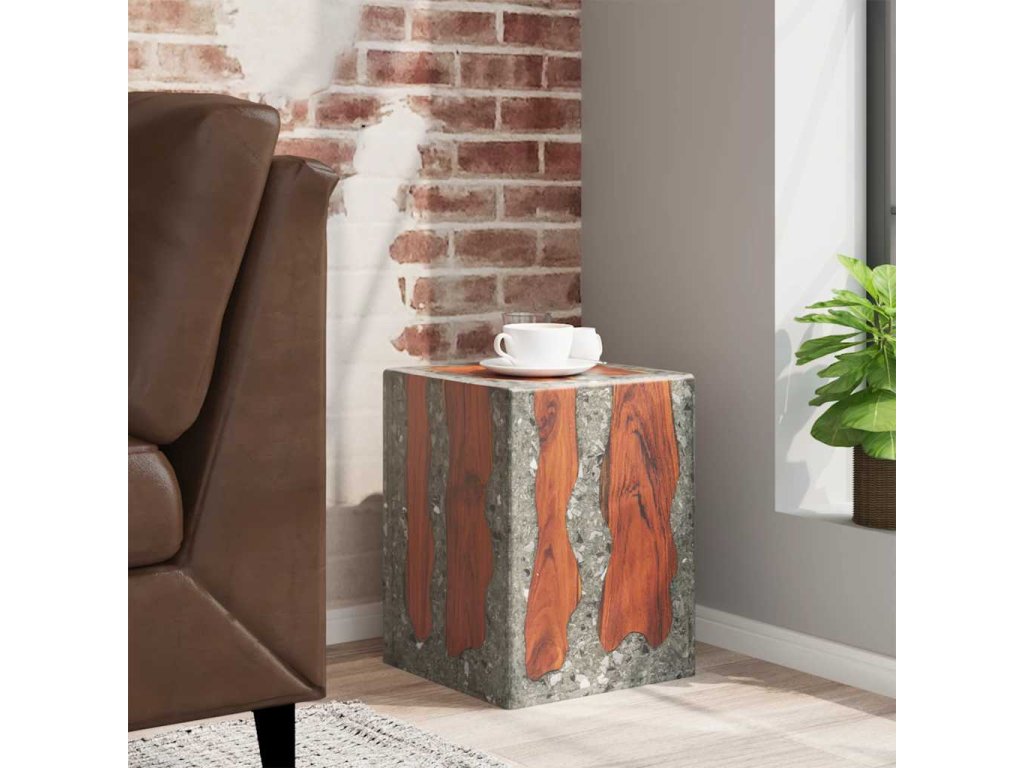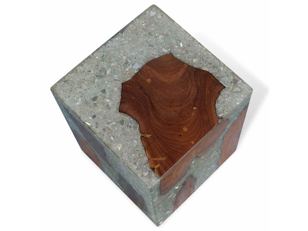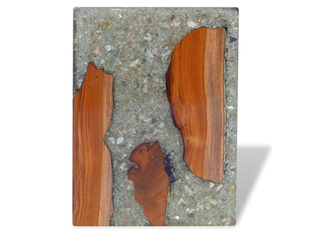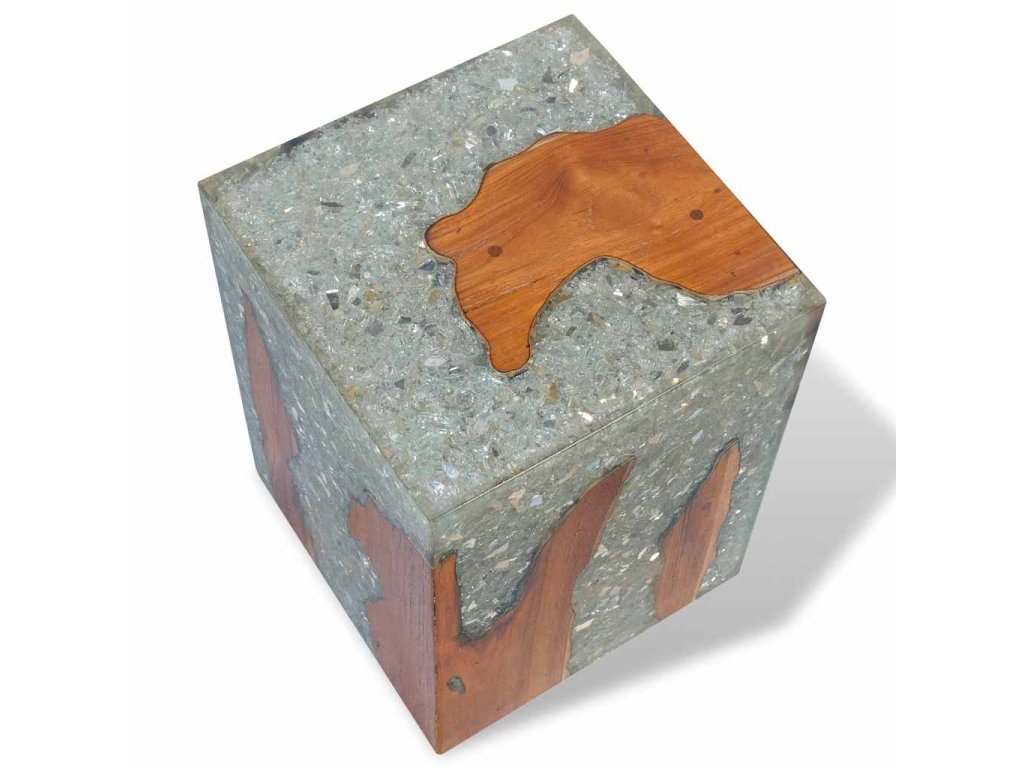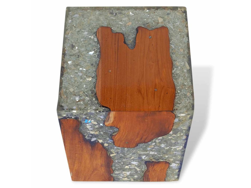- Materiál: Tíkový masív ošetrený čírym lakom, priehľadná živica s drveným sklom, preglejka