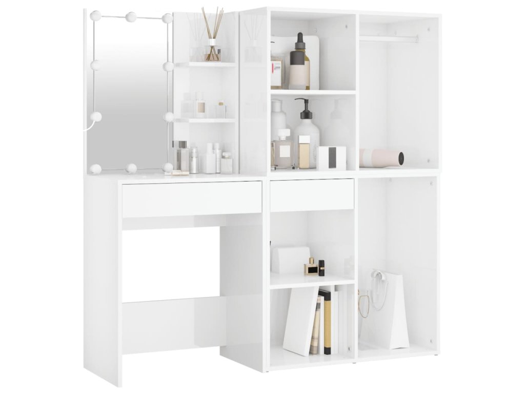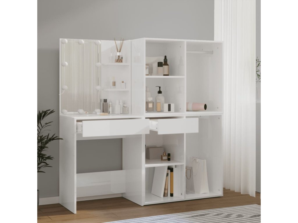 - Odolný materiál: LED toaletný stolík so skrinkami je vyrobený zo spracovaného dreva. Spracované drevo je mimoriadne kvalitné s hladkým povrchom a vyznačuje sa pevnosťou, stabilitou a odolnosťou proti vlhkosti.