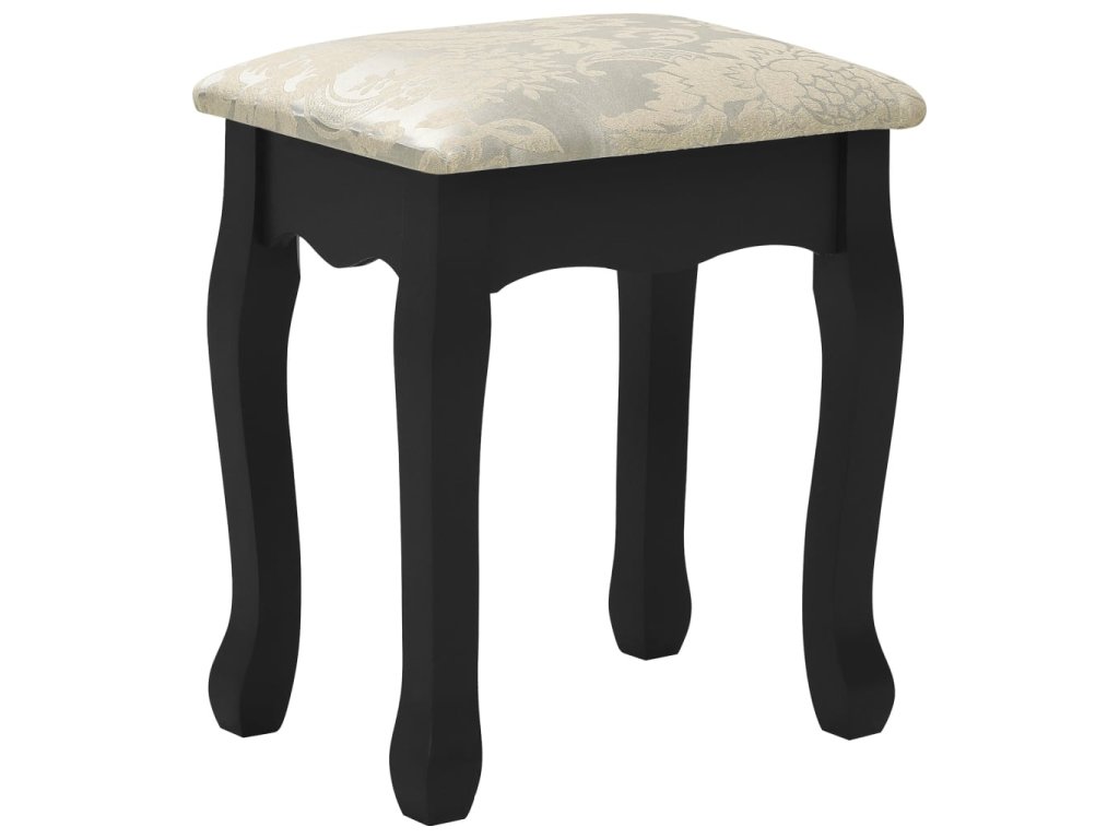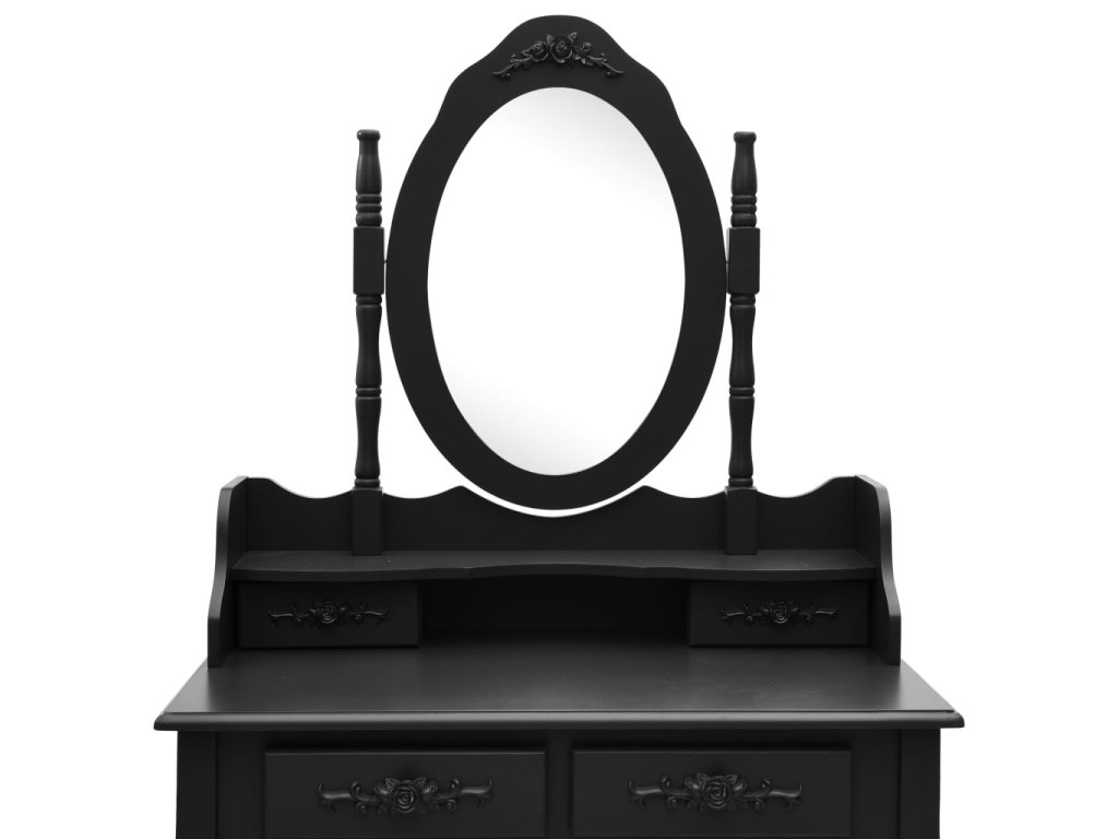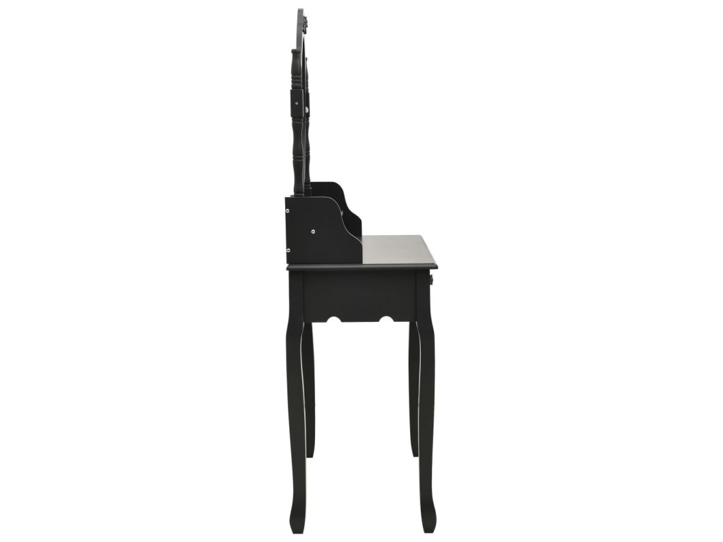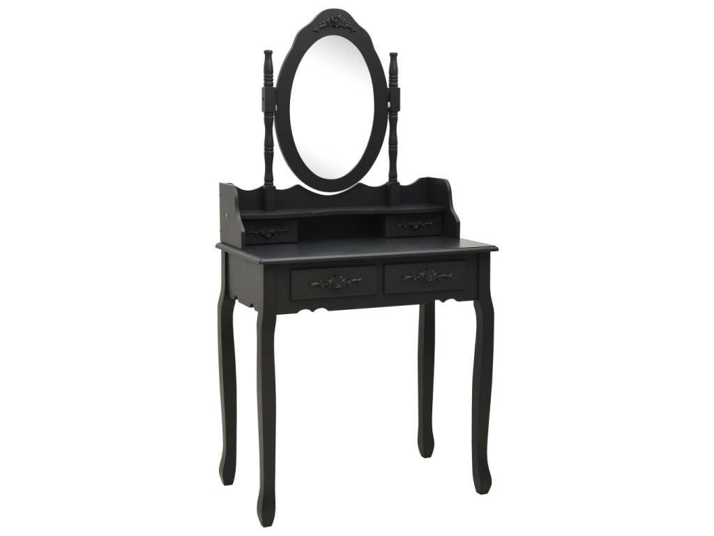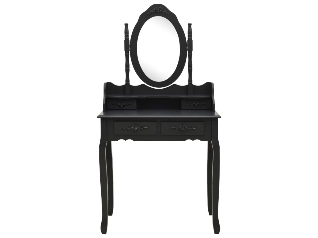 Toaletný stolík je vyrobený zo starostlivo vyberaného dreva paulovnie a vyniká svojou jedinečnou siluetou so štyrmi zaoblenými nožičkami s luxusným dizajnom. Štyri zásuvky rôznych veľkostí a otvorený priečinok poskytujú množstvo priestoru na líčidlá a šperky. Doska stola zas poslúži ako ideálne miesto na vystavenie parfumov či rôznych dekorácií. Stolík sa dodáva spolu so stoličkou bez operadla, ktorá má polstrované sedadlo a zladené drevené nohy. Vstavané vykladané zrkadlo vložené do zaujímavo vytvarovaného rámu dodáva celej súprave moderný vzhľad.