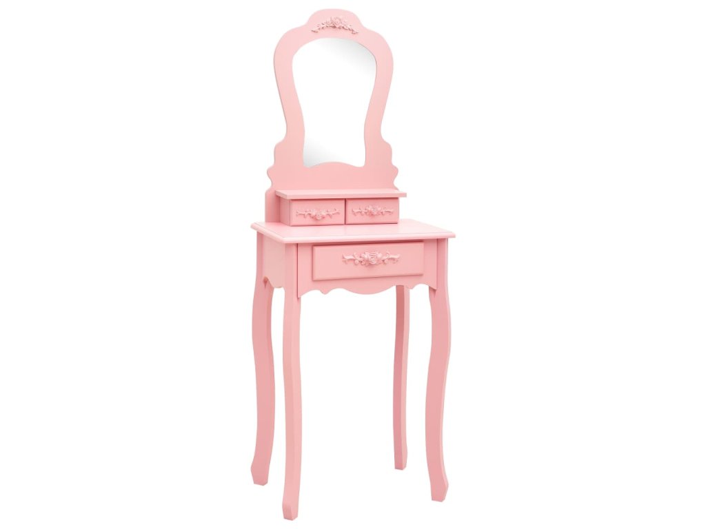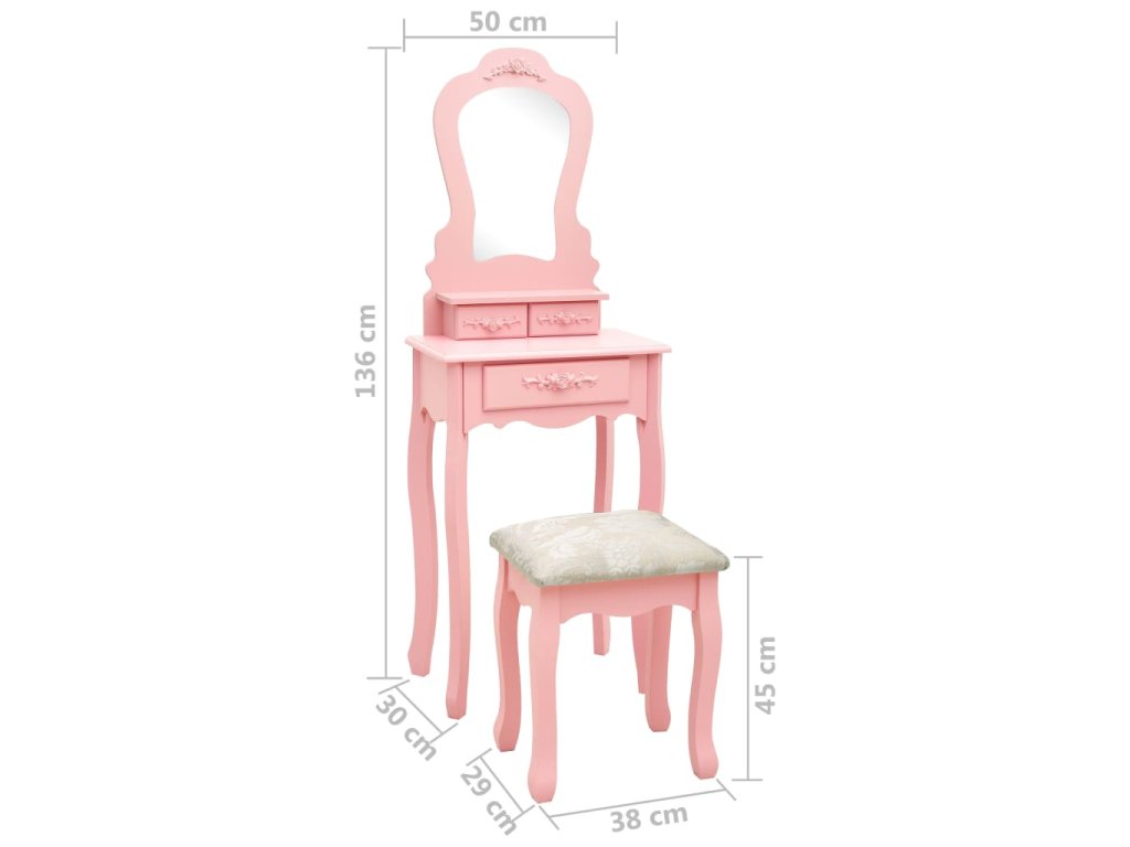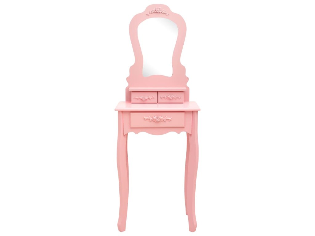 Toaletný stolík je vyrobený zo starostlivo vyberaného dreva paulovnie a vyniká svojou jedinečnou siluetou so štyrmi zaoblenými nožičkami s luxusným dizajnom. Tri zásuvky rôznych veľkostí poskytujú množstvo priestoru na líčidlá a šperky. Doska stola zas poslúži ako ideálne miesto na vystavenie parfumov či rôznych dekorácií. Stolík sa dodáva spolu so stoličkou bez operadla, ktorá má polstrované sedadlo a zladené drevené nohy. Vstavané vykladané zrkadlo vložené do zaujímavo vytvarovaného rámu dodáva celej súprave moderný vzhľad.