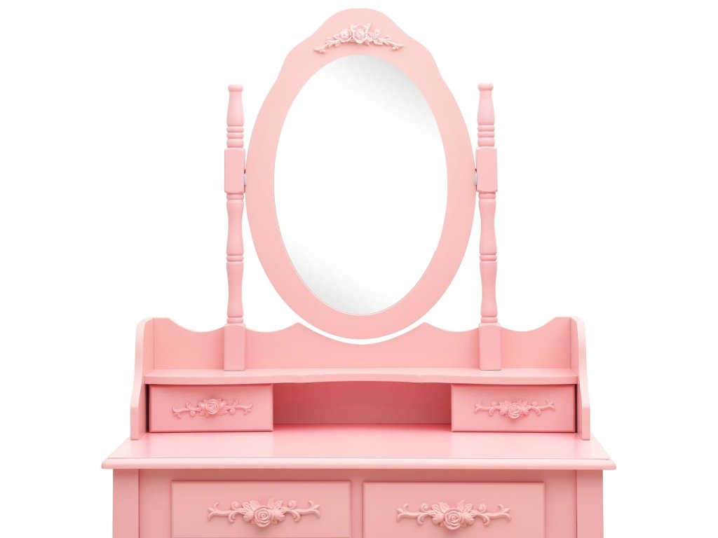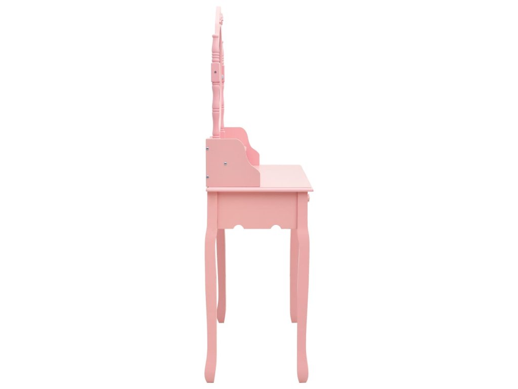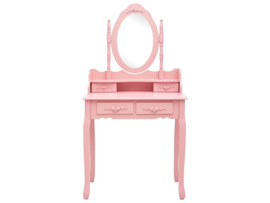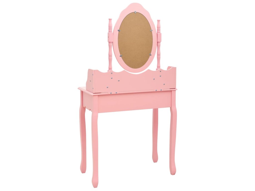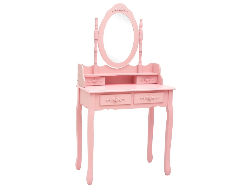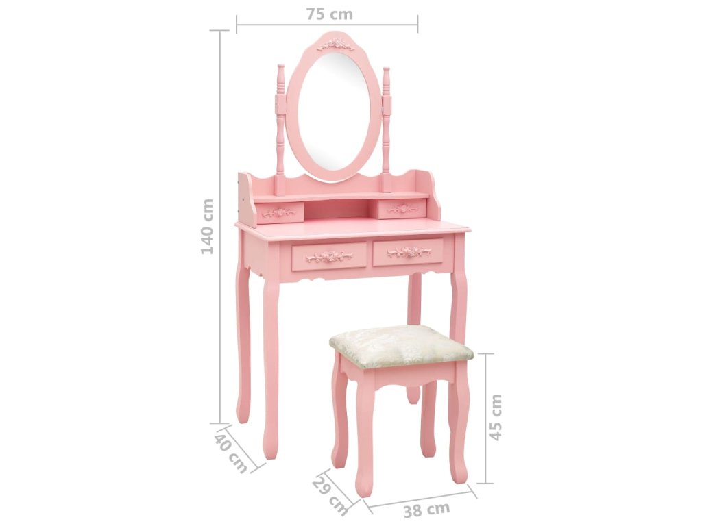 Toaletný stolík je vyrobený zo starostlivo vyberaného dreva paulovnie a vyniká svojou jedinečnou siluetou so štyrmi zaoblenými nožičkami s luxusným dizajnom. Štyri zásuvky rôznych veľkostí a otvorený priečinok poskytujú množstvo priestoru na líčidlá a šperky. Doska stola zas poslúži ako ideálne miesto na vystavenie parfumov či rôznych dekorácií. Stolík sa dodáva spolu so stoličkou bez operadla, ktorá má polstrované sedadlo a zladené drevené nohy. Vstavané vykladané zrkadlo vložené do zaujímavo vytvarovaného rámu dodáva celej súprave moderný vzhľad.