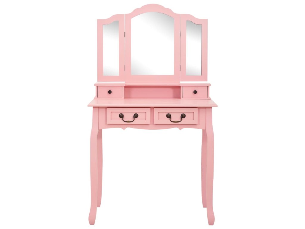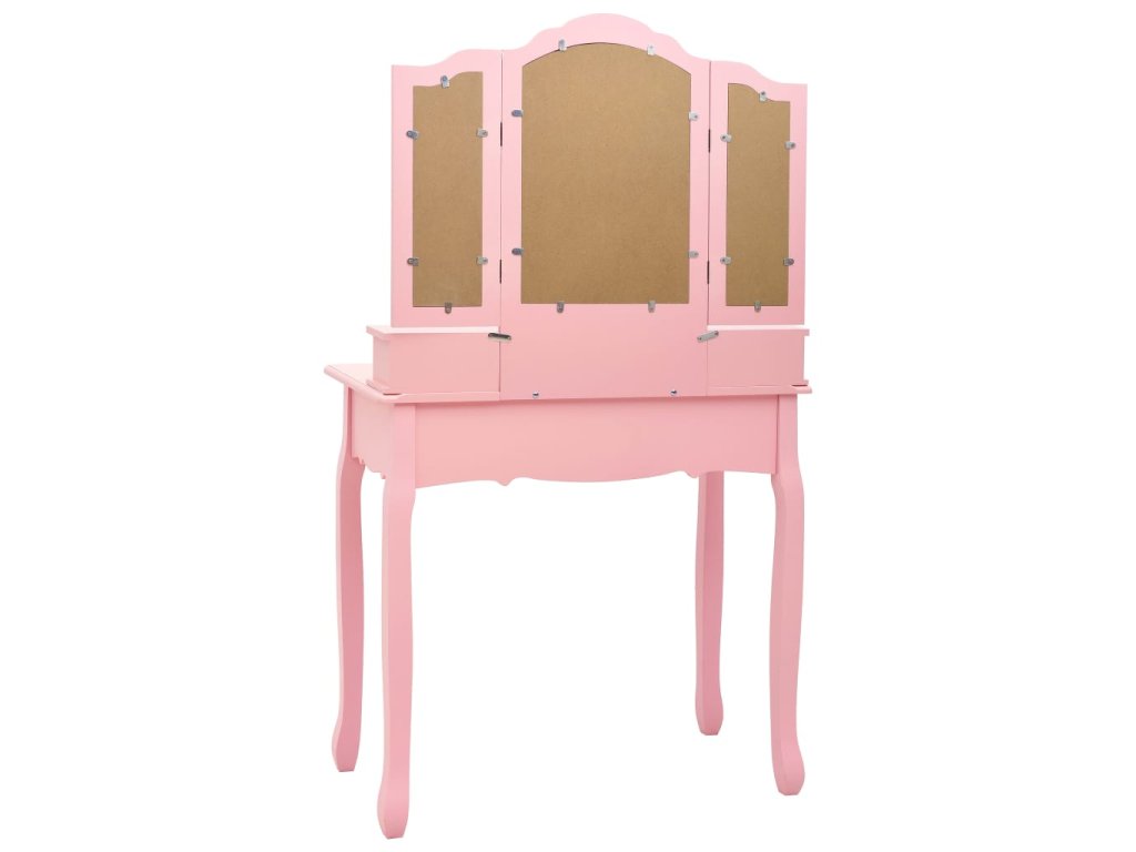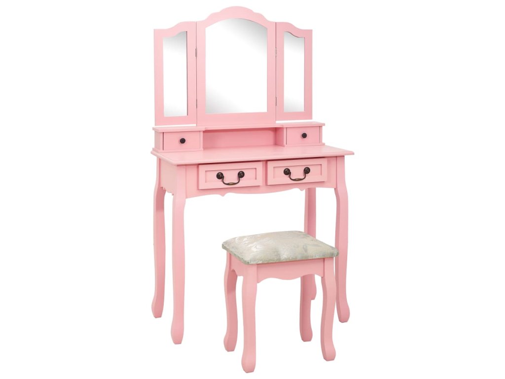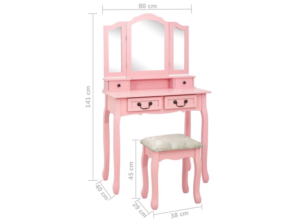 Toaletný stolík je vyrobený zo starostlivo vyberaného dreva paulovnie a vyniká svojou jedinečnou siluetou so štyrmi zaoblenými nožičkami s luxusným dizajnom. Štyri zásuvky rôznych veľkostí a otvorený priečinok poskytujú množstvo priestoru na líčidlá a šperky. Doska stola zas poslúži ako ideálne miesto na vystavenie parfumov či rôznych dekorácií. Stolík sa dodáva spolu so stoličkou bez operadla, ktorá má polstrované sedadlo a zladené drevené nohy. Vstavané vykladané zrkadlo vložené do zaujímavo vytvarovaného rámu dodáva celej súprave moderný vzhľad.