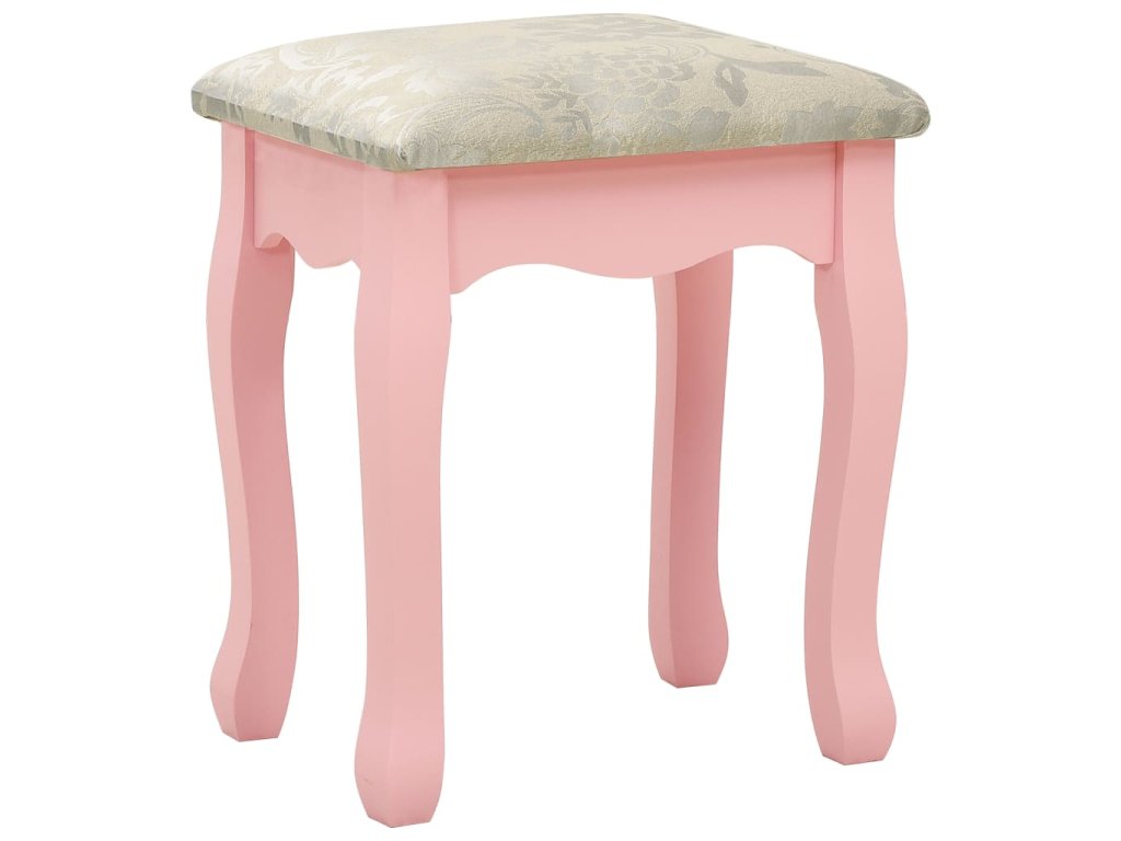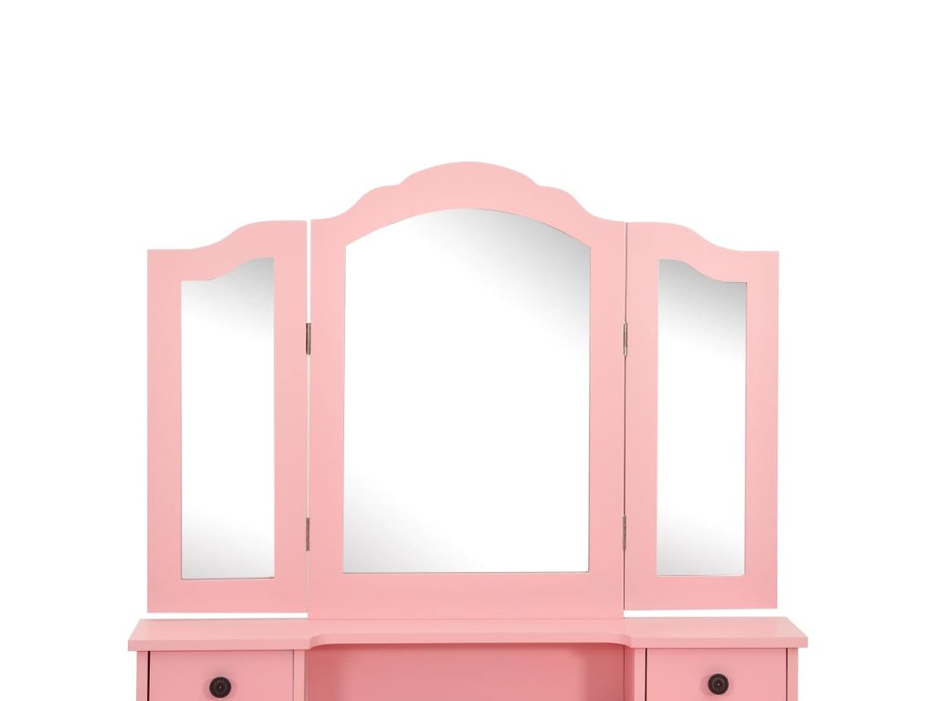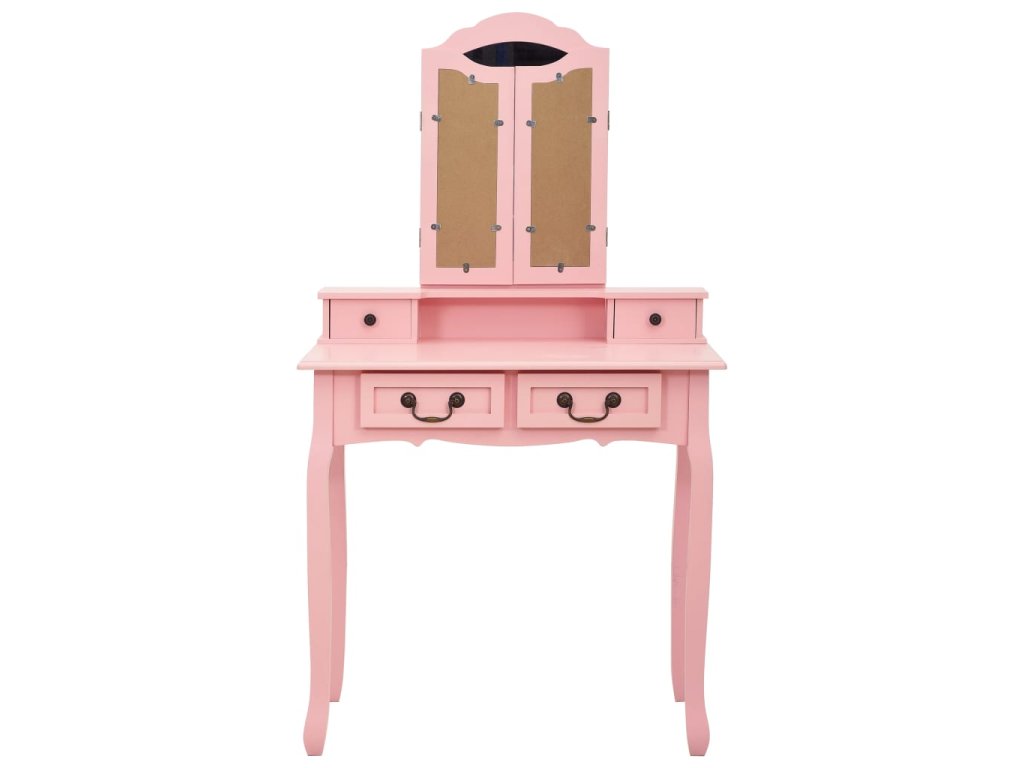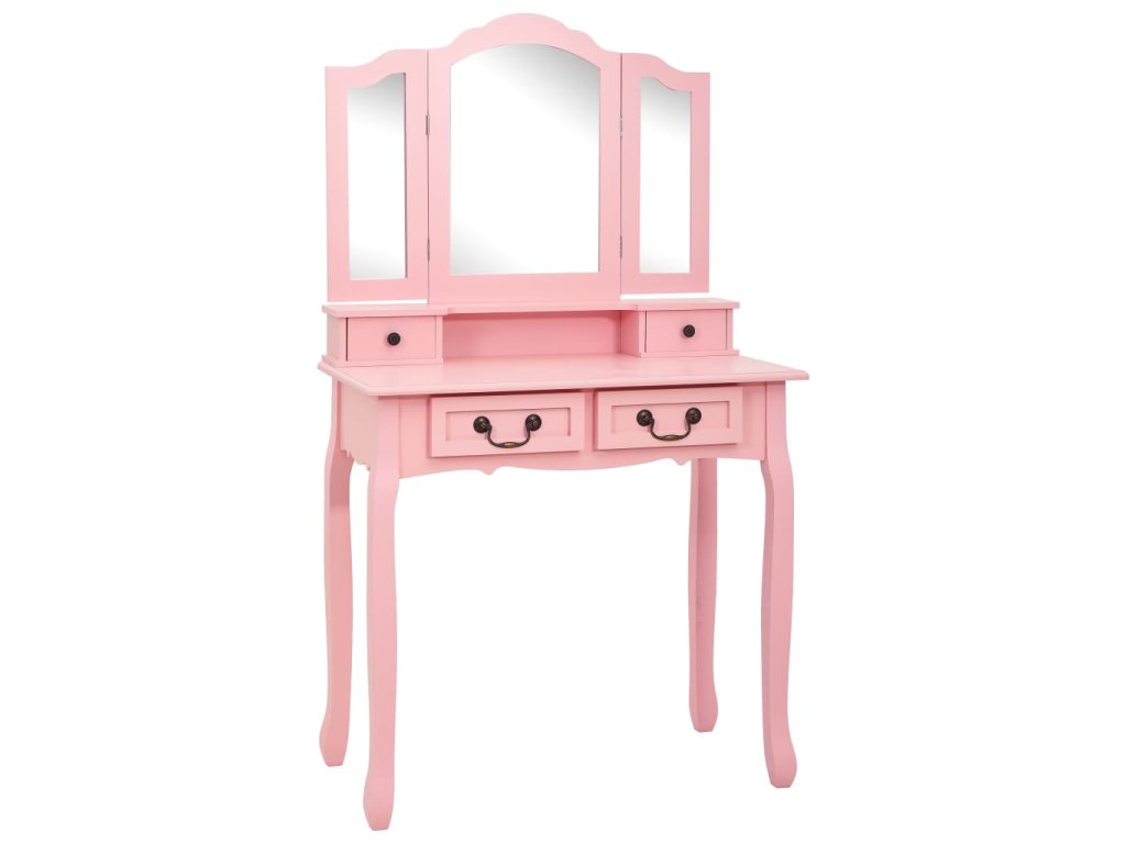Toaletný stolík je vyrobený zo starostlivo vyberaného dreva paulovnie a vyniká svojou jedinečnou siluetou so štyrmi zaoblenými nožičkami s luxusným dizajnom. Štyri zásuvky rôznych veľkostí a otvorený priečinok poskytujú množstvo priestoru na líčidlá a šperky. Doska stola zas poslúži ako ideálne miesto na vystavenie parfumov či rôznych dekorácií. Stolík sa dodáva spolu so stoličkou bez operadla, ktorá má polstrované sedadlo a zladené drevené nohy. Vstavané vykladané zrkadlo vložené do zaujímavo vytvarovaného rámu dodáva celej súprave moderný vzhľad.