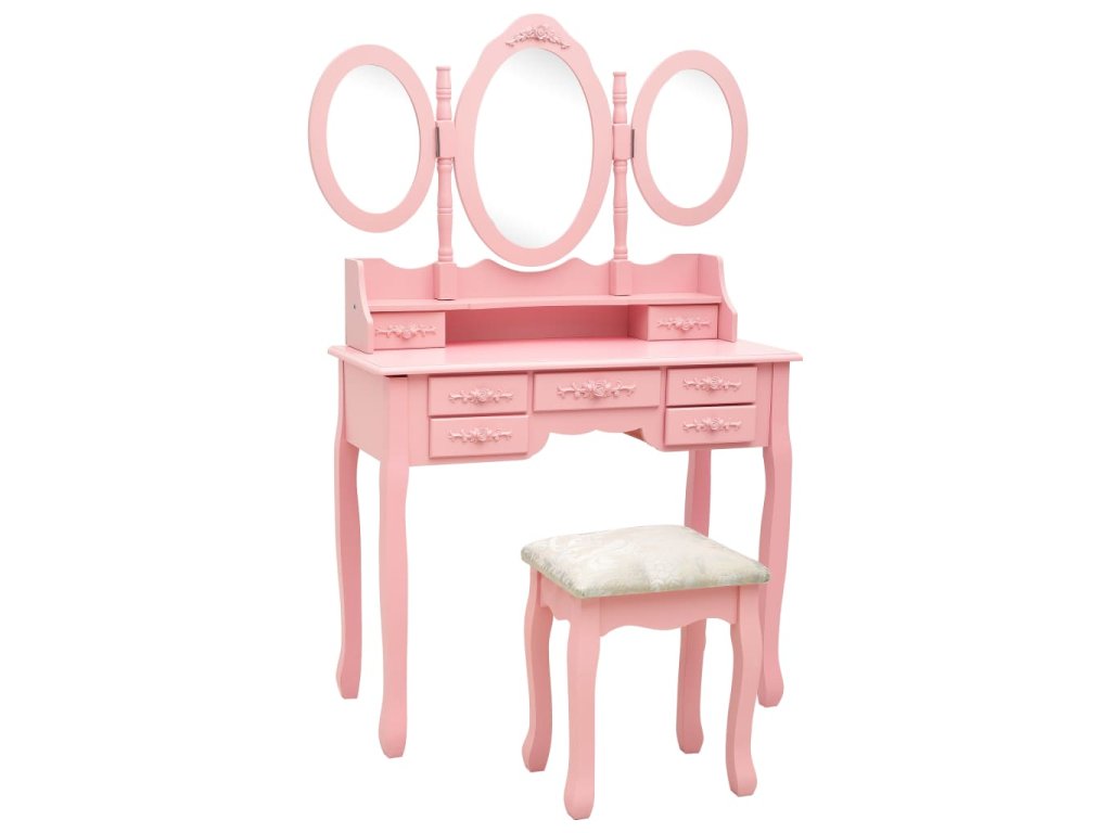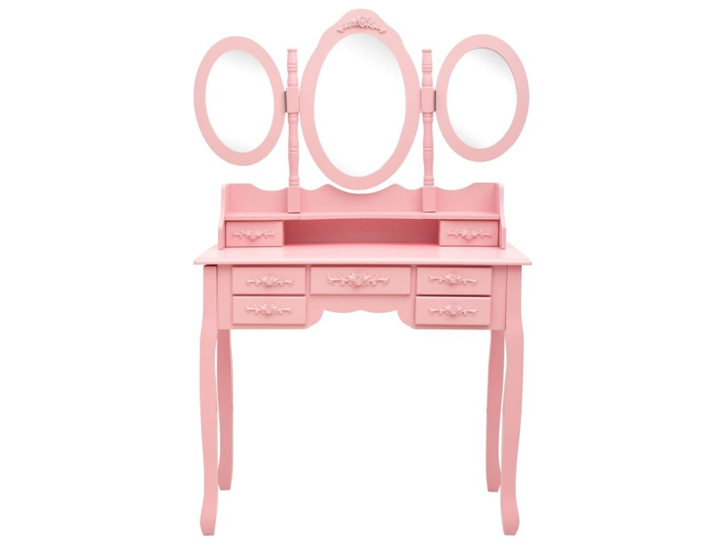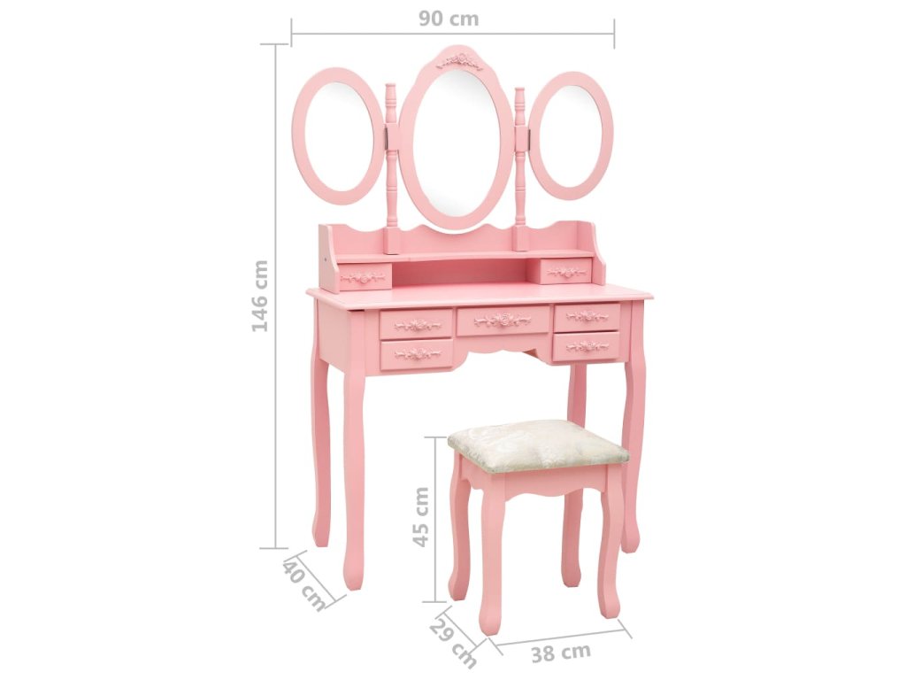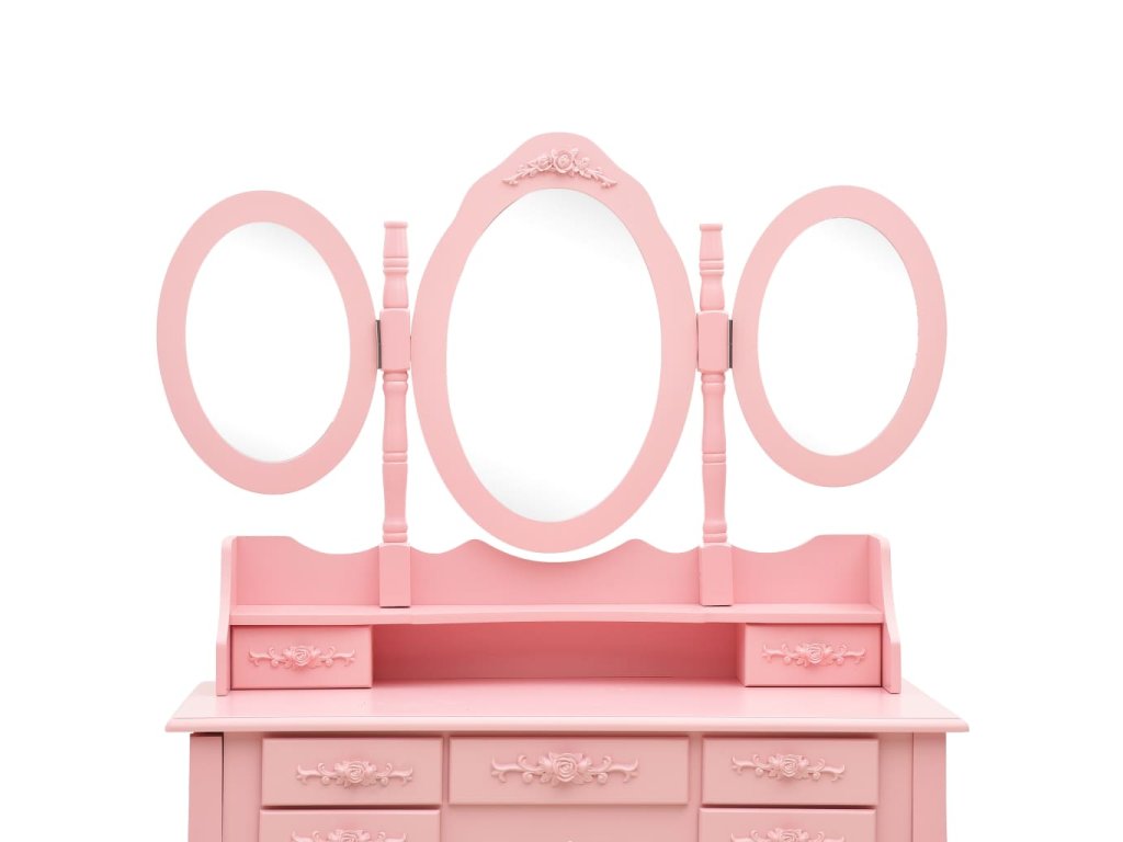 Zrkadlá majú samostatne stojaci rám a 2 bočné zrkadlá môžete otočiť do požadovaného uhla. Vďaka 7 zásuvkám máte ďalší priestor pre vaše šperky, kozmetiku a ďalšie veci. Vynikajúce spracovanie je ďalšou charakteristikou tejto súpravy stola a stoličky. Táto súprava pritiahne pozornosť všade tak, kde ju položíte.