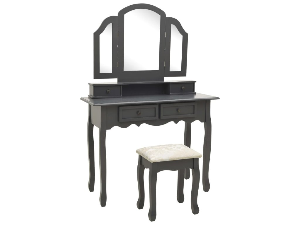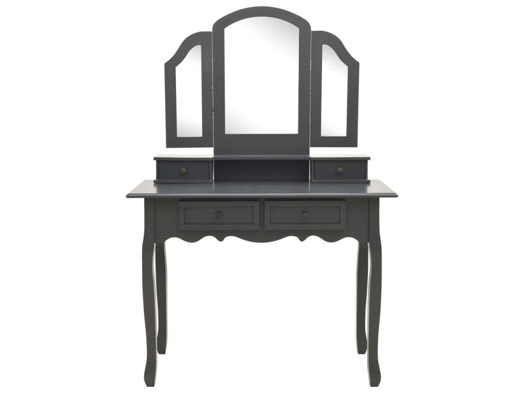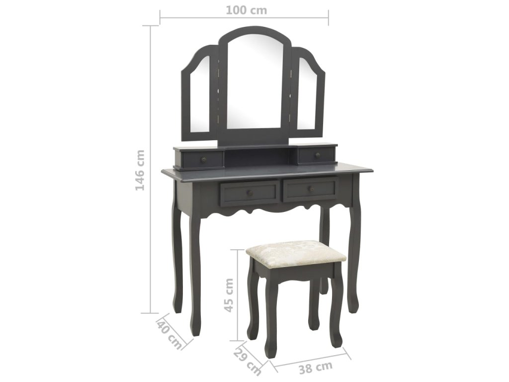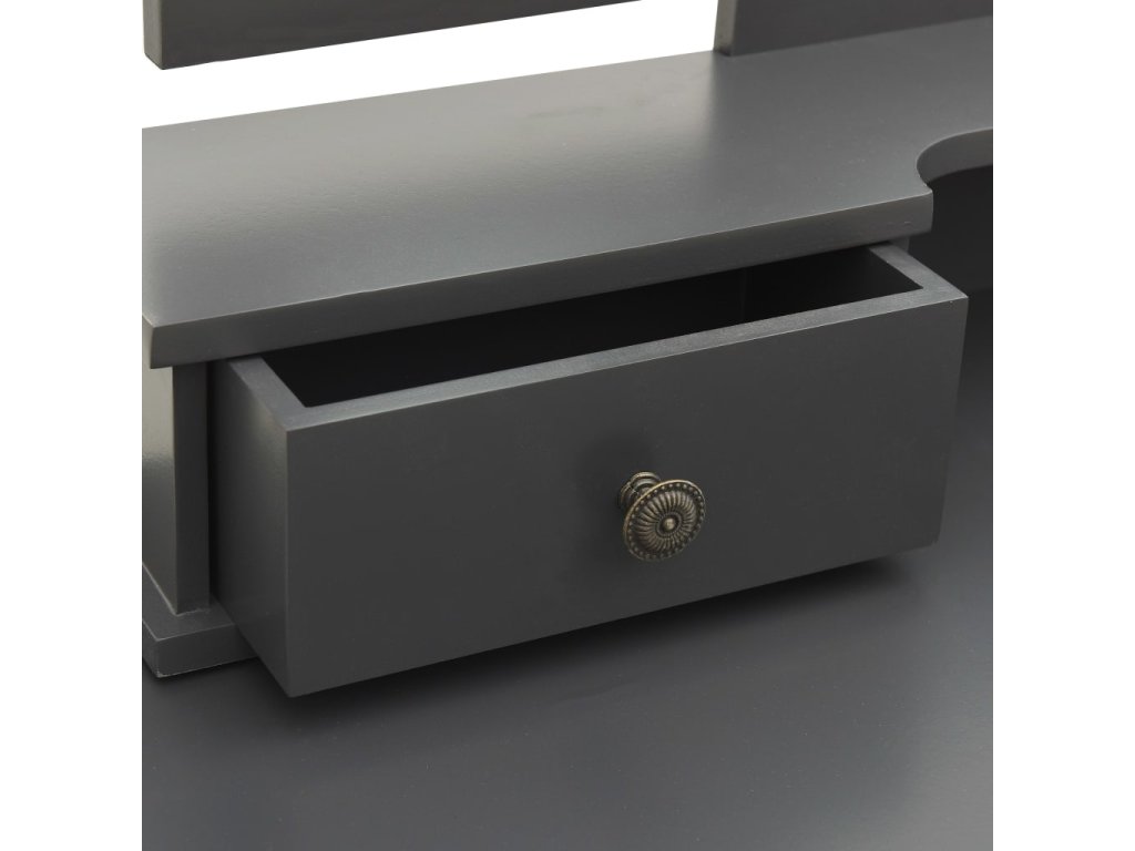 Táto okúzľujúca súprava toaletného stolíka a stoličky je vyrobená z dreva paulovnie prvotriednej kvality. Jej viktoriánsky vzhľad a sivý povrch vnesú do každého budoáru, salóniku alebo šatne nádych krásy a elegancie. Exkluzívne remeselné spracovanie dodáva toaletnému stolíku a stoličke jedinečné charakteristiky.