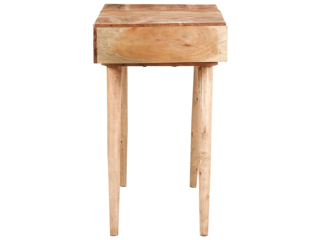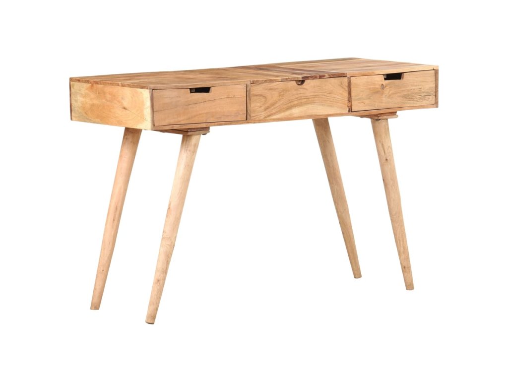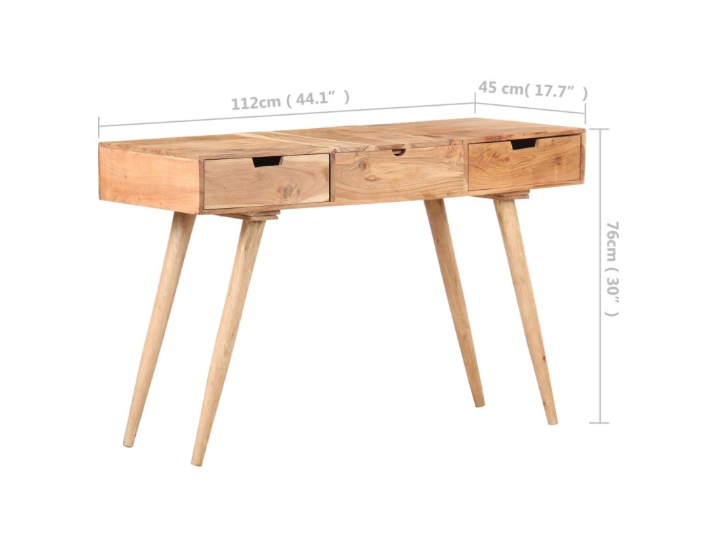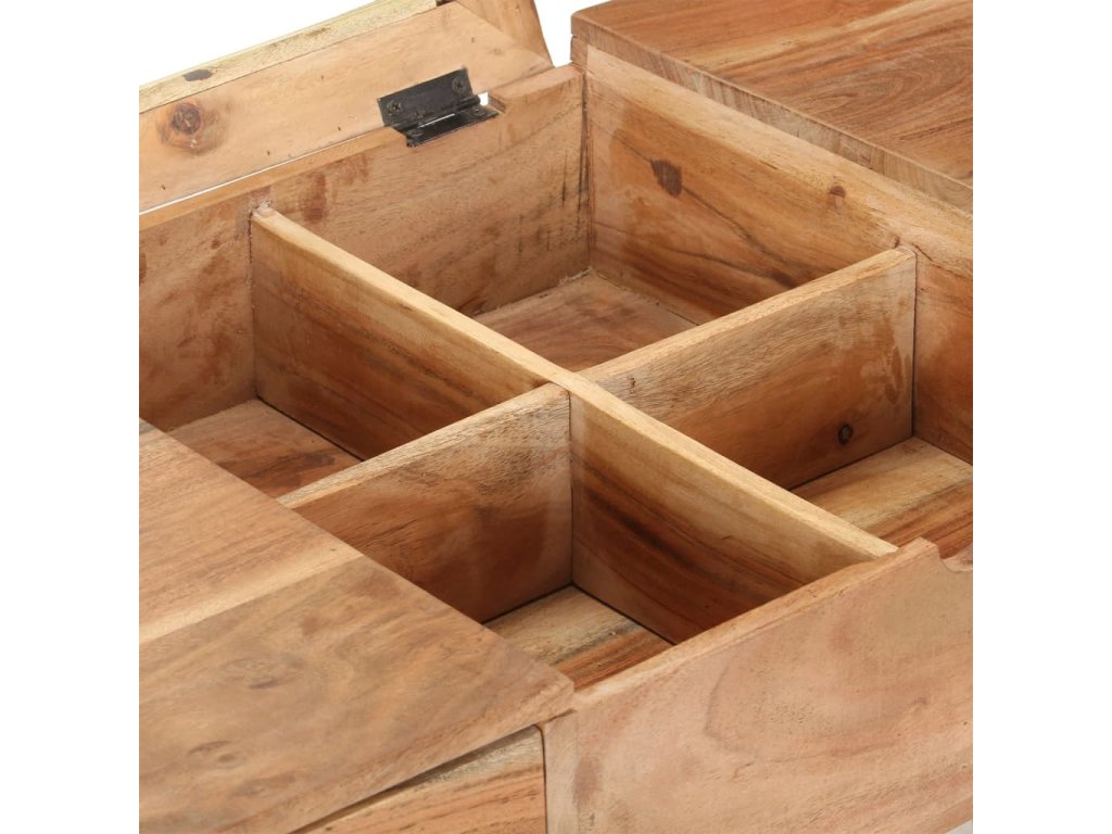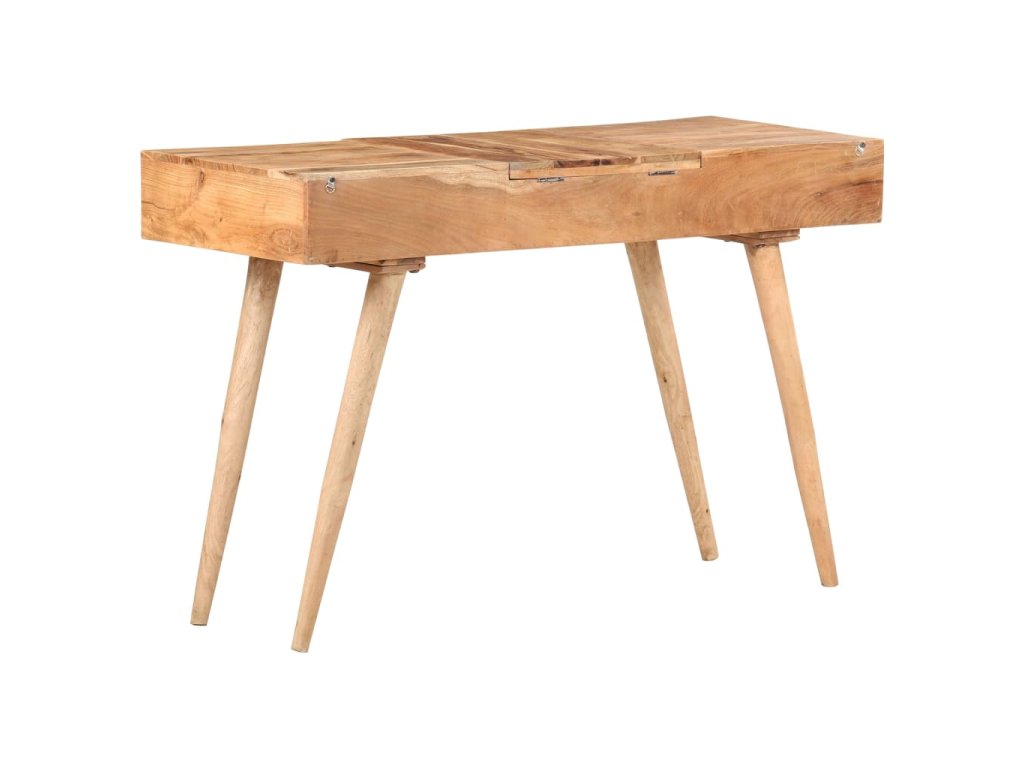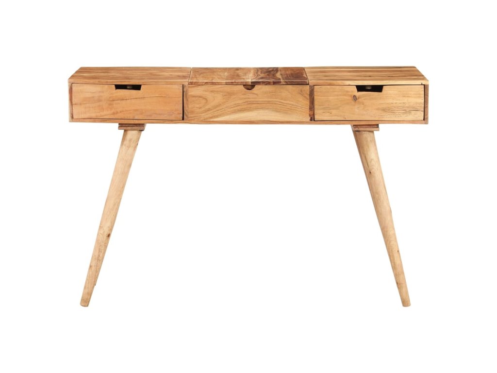 Tento kozmetický stolík je vyrobený z masívneho akáciového dreva, tvrdého dreva s hustou kresbou. Krásne navrhnutý zrkadlový stôl je stabilný, odolný a pútavý. Vďaka vynikajúcemu remeselnému spracovaniu a nádhernej štruktúre dreva je každý kus mierne odlišný. Tento stôl pre mejkap je vybavený zrkadlom a skrytým úložným priestorom. K dispozícii sú aj 2 zásuvky, ktoré poskytujú dostatočný úložný priestor pre všetky vaše kozmetické potreby.
