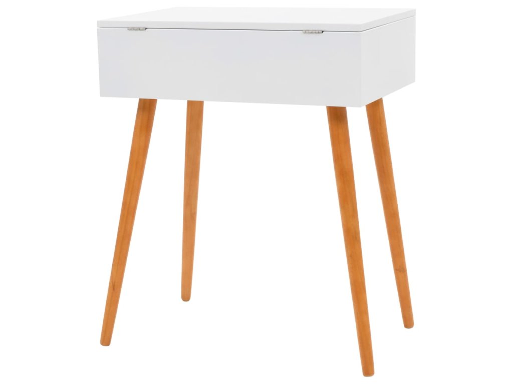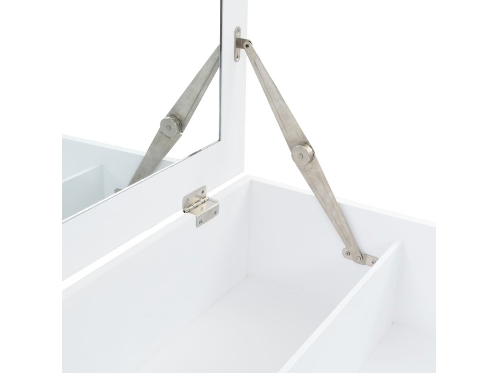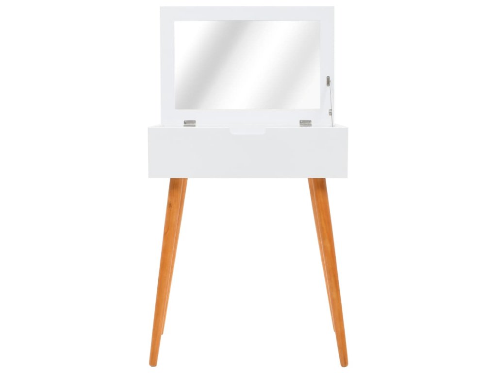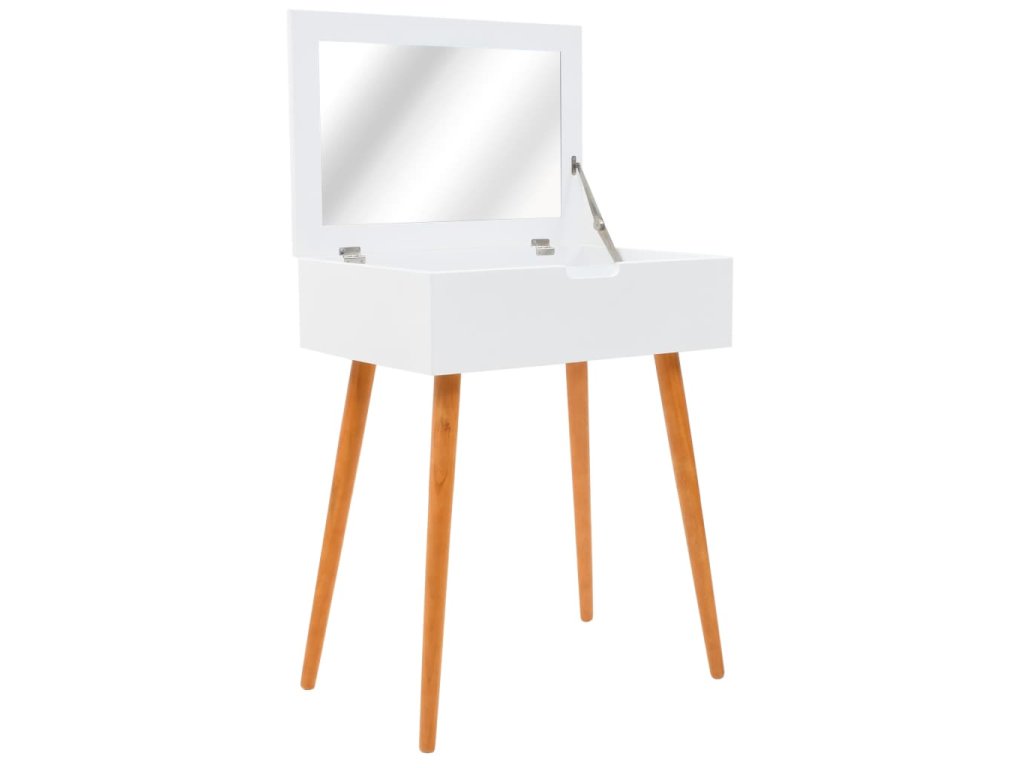 Stolík je vyrobený z MDF a má sklenené zrkadlo. Jeho súčasťou je vyklápací panel so zrkadlom, pod ktorým nájdete priestranný priečinok na odkladanie šperkov. Poskytuje dostatok miesta na kozmetiku a rôzne prípravky na starostlivosť o vlasy a pleť. Keď zrkadlo nepoužívate, stačí ho sklopiť a z vrchnej dosky stola sa stane ideálne miesto na uloženie líčidiel, šperkov a iných kozmetických potrieb. Pevné drevené nohy dodávajú stolíku stabilitu a umocňujú jeho moderný dizajn z polovice minulého storočia.