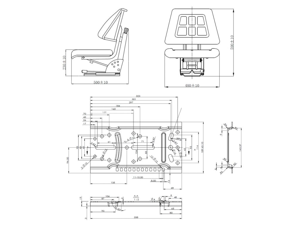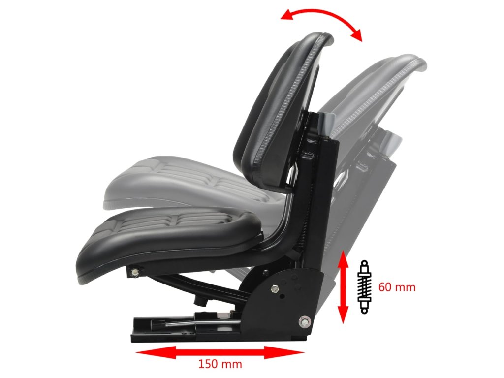 Traktorové sedadlo je vhodné pre používateľa s hmotnosťou od 50 do 130 kg tak, že sa dá nastaviť pomocou gombíka na spodnej strane. Obsahuje odpruženie, ktoré pomáha absorbovať šoky na nerovnom teréne a zabezpečuje čo najhladšiu jazdu na traktore. Toto traktorové sedadlo je vybavené aj posuvnými koľajnicami, ktoré umožňujú jednoduché a pohodlné posúvanie dopredu alebo dozadu v rozsahu 150 mm. Základňa sa dá nastaviť do 5 rôznych uhlov. Doska základne má dierky, vďaka čomu je montáž jednoduchá a rýchla.