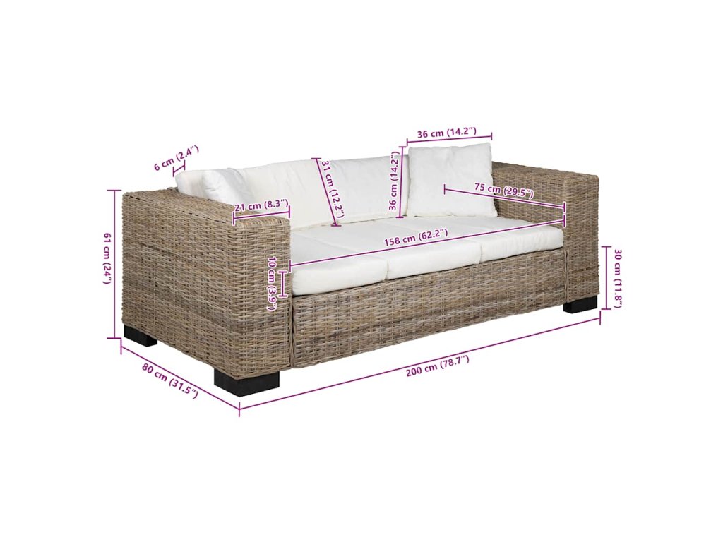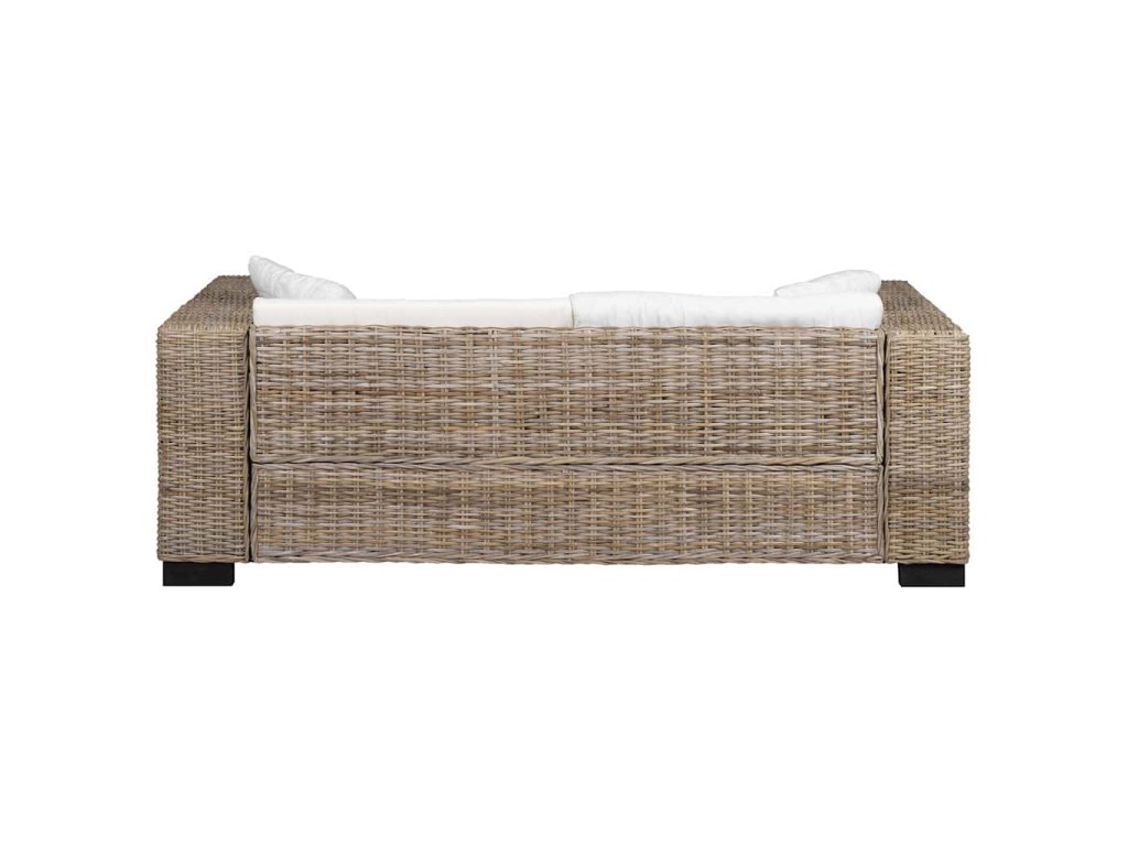 Vďaka vysoko kvalitnému pravému ratanu sa pohovka jednoducho čistí, je odolná a vhodná na každodenné použitie. Obsahuje robustný drevený rám, ktorý je nadmieru odolný a stabilný. Vďaka odnímateľným návliečkam sú hrubé vankúše veľmi prispôsobivé a umývateľné. Široké opierky umožňujú pohodlné sedenie na tejto pohovke.
