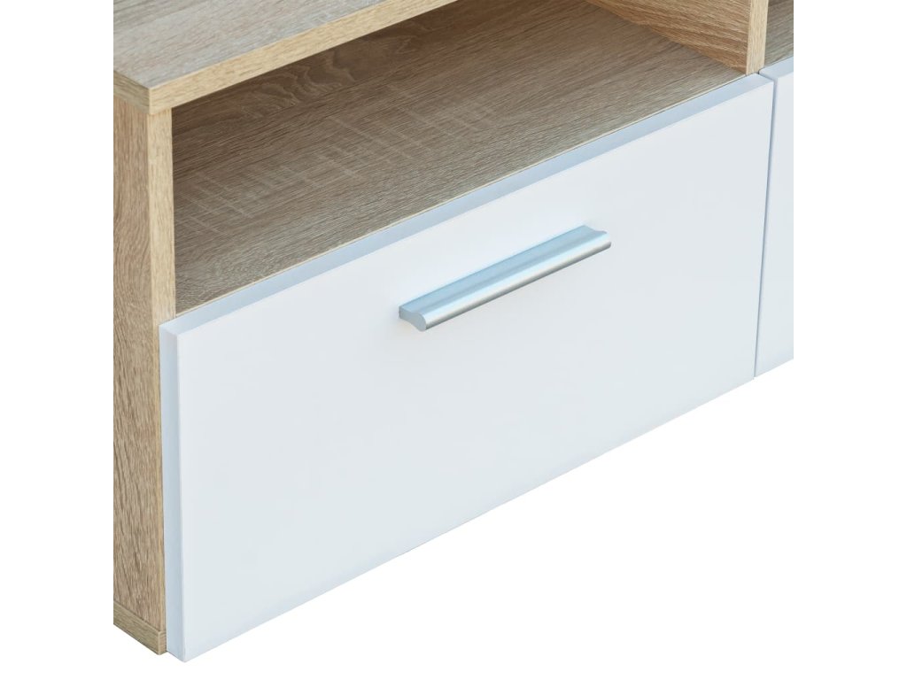 Skrinka na Hi-Fi vežu je vyrobená z kompozitného dreva s PVC hranami a je stabilná a trvácna. Má dve otvorené poličky a dve skrinky s dvierkami, ktoré sa vyklápajú smerom nadol a poskytujú dostatok priestoru na DVD prehrávač, hernú konzolu, digitálny prijímač alebo mediálne nosiče. Táto TV skrinka s čistými líniami predstavuje skvelý doplnok do spálne či obývačky.