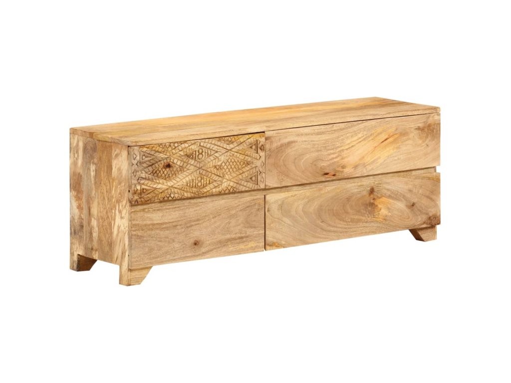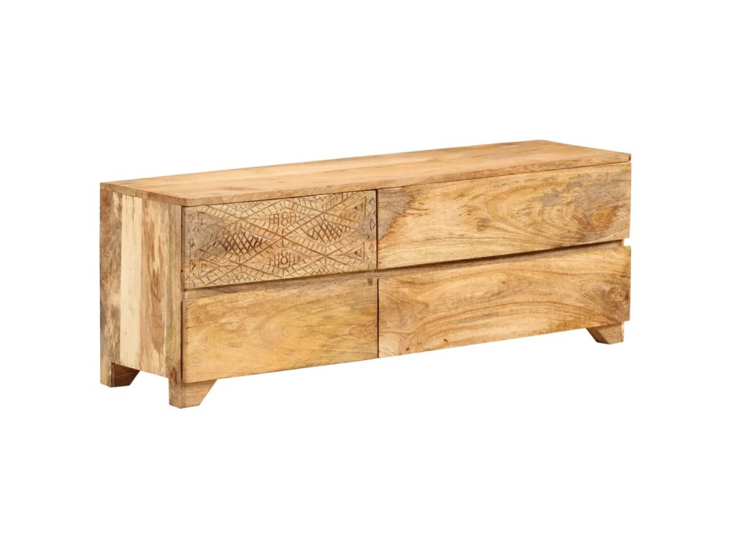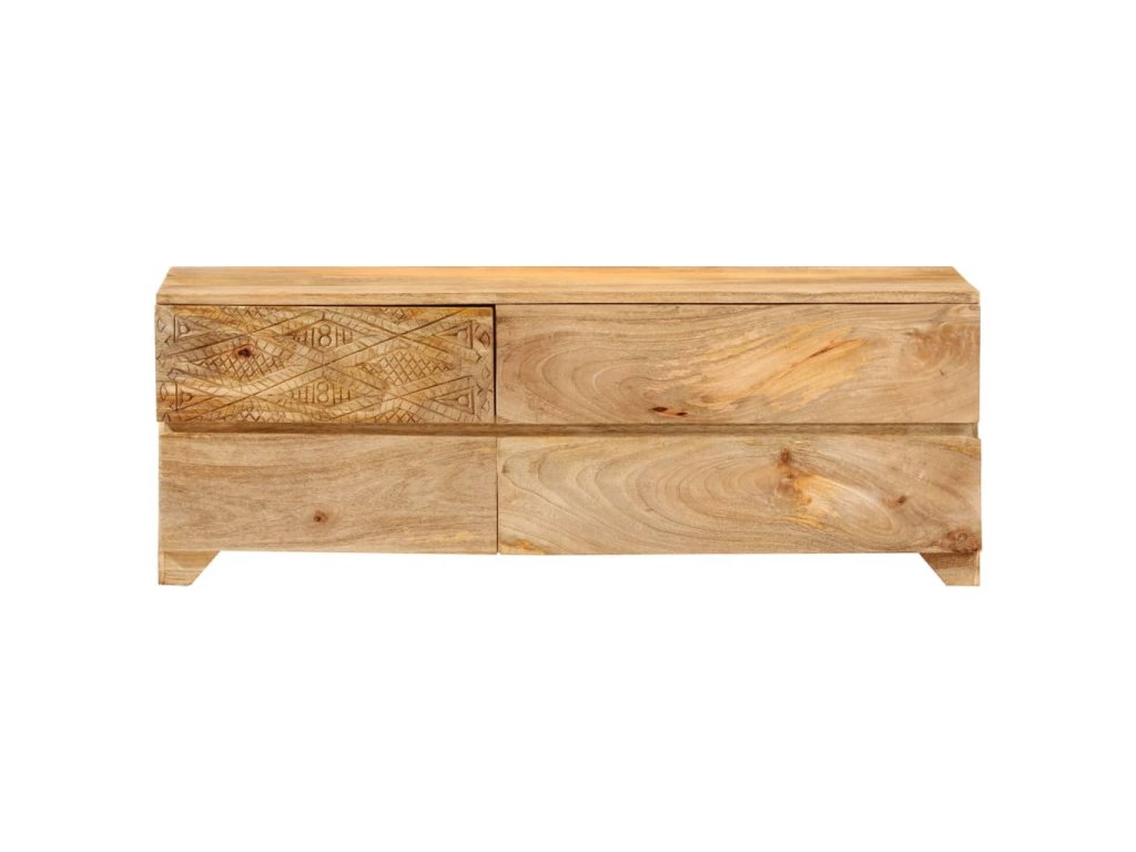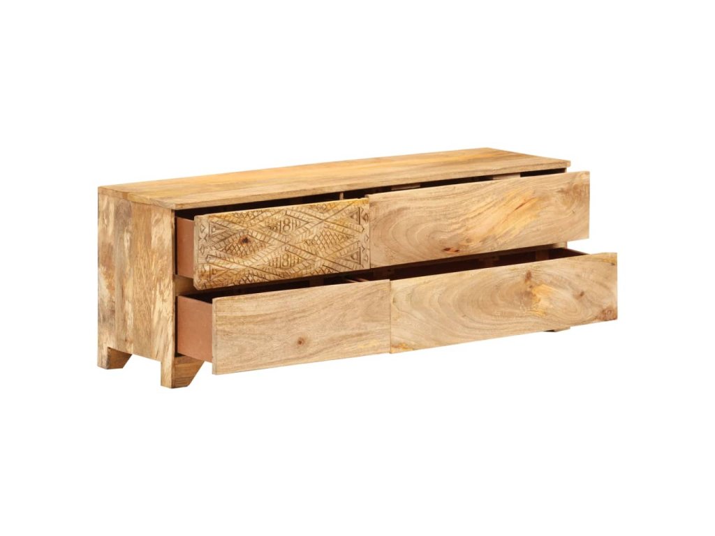 Táto TV skrinka je vyrobená z masívneho mangovníkového dreva a je veľmi stabilná a odolná. Robustná vrchná doska je ideálna na umiestnenie televízora a stereo systémov, ale aj ozdobných predmetov, ako sú vázy alebo rastliny v kvetináčoch. HiFi skrinka so 4 zásuvkami poskytuje dostatok priestoru na úhľadné uloženie DVD prehrávačov, herných konzol, streamingových zariadení, nosičov médií, atď. Krásne vyrezávané motívy na povrchu dodávajú skrinke jedinečný vzhľad. Každý krok výrobného procesu sa vykonáva s maximálnou starostlivosťou, či už ide o leštenie, natieranie alebo lakovanie. Táto skrinka je vopred namontovaná, žiadna dodatočná montáž nie je potrebná.