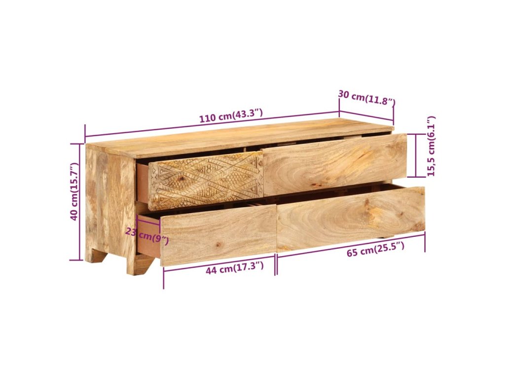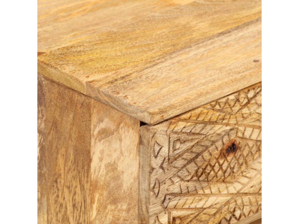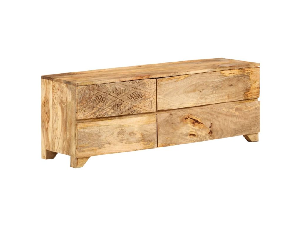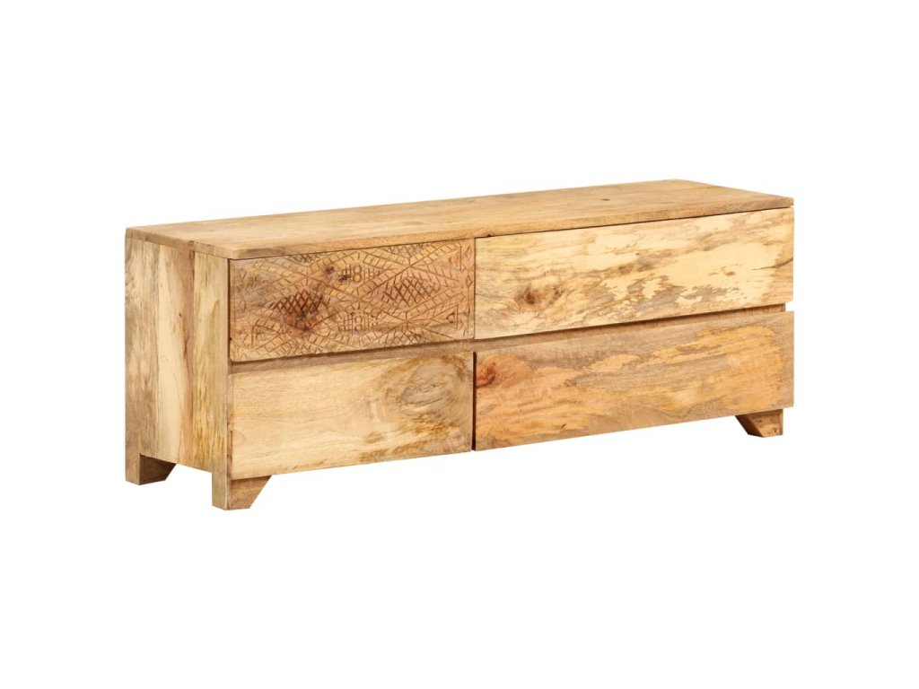 Táto TV skrinka je vyrobená z masívneho mangovníkového dreva a je veľmi stabilná a odolná. Robustná vrchná doska je ideálna na umiestnenie televízora a stereo systémov, ale aj ozdobných predmetov, ako sú vázy alebo rastliny v kvetináčoch. HiFi skrinka so 4 zásuvkami poskytuje dostatok priestoru na úhľadné uloženie DVD prehrávačov, herných konzol, streamingových zariadení, nosičov médií, atď. Krásne vyrezávané motívy na povrchu dodávajú skrinke jedinečný vzhľad. Každý krok výrobného procesu sa vykonáva s maximálnou starostlivosťou, či už ide o leštenie, natieranie alebo lakovanie. Táto skrinka je vopred namontovaná, žiadna dodatočná montáž nie je potrebná.