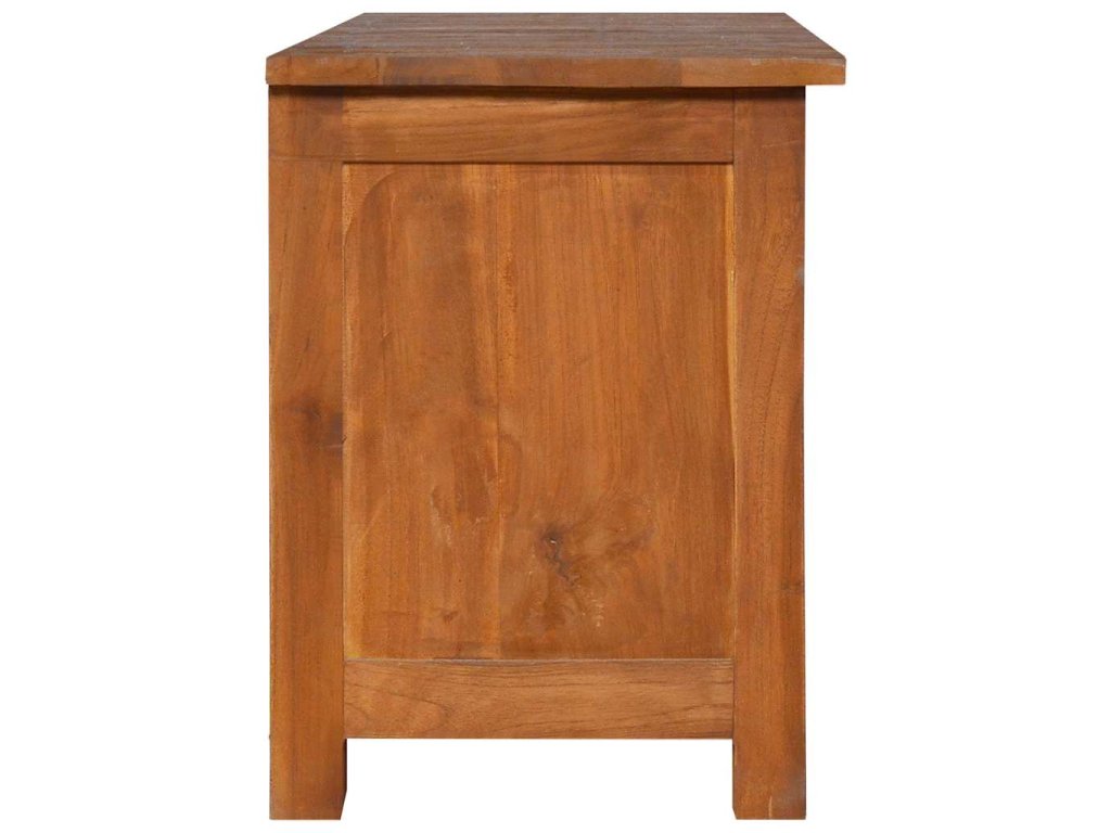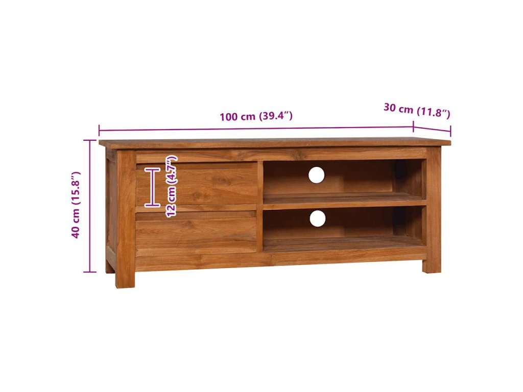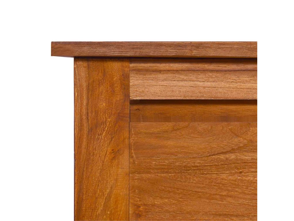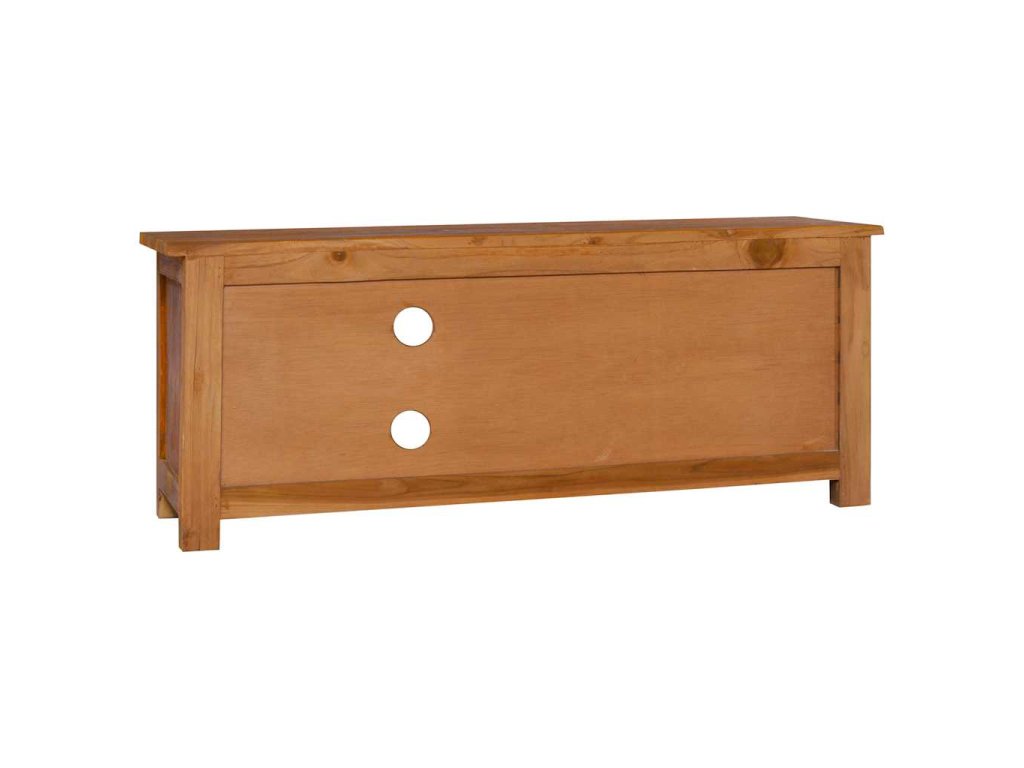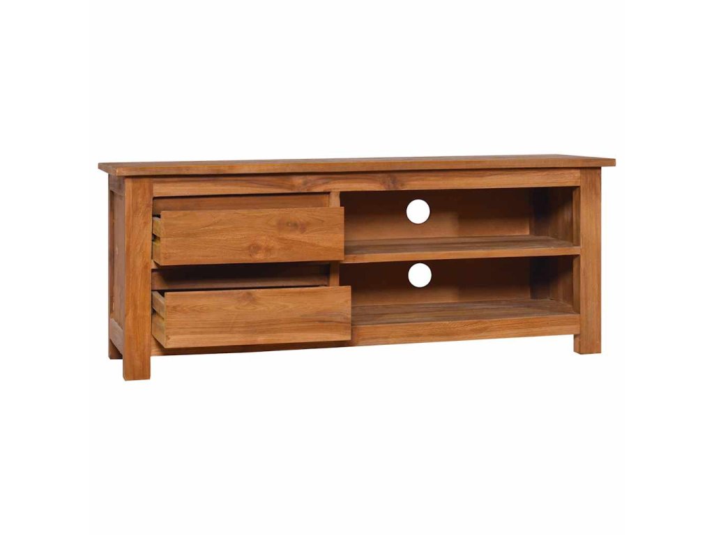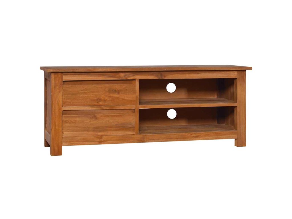 TV skrinka je vyhotovená z tvrdého tíkového dreva, ktoré bolo umelo vysušené v sušiarni a jeho povrch bol následne jemne obrúsený, aby získal hladký vzhľad. Tíkové drevo sa vyznačuje výnimočnou pevnosťou, a tak predstavuje jeden z najvhodnejších materiálov na výrobu nábytku spomedzi všetkých ostatných druhov dreva. Ak si chcete zaobstarať nábytok, ktorý vám bude slúžiť dlhé roky, tíkové drevo je pre vás ako stvorené. Skrinka má 2 zásuvky a 2 poličky, a tak poskytuje praktický priestor na odkladanie rôznych predmetov.